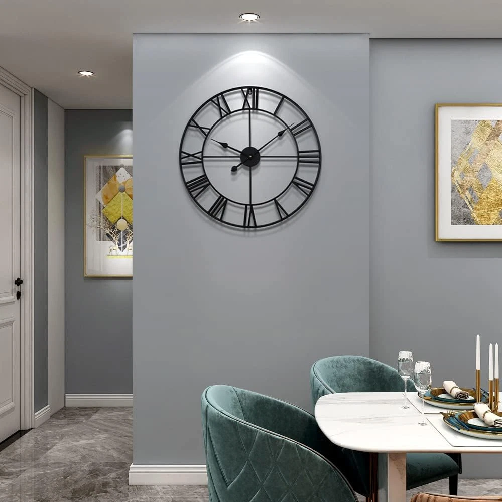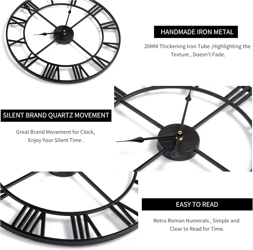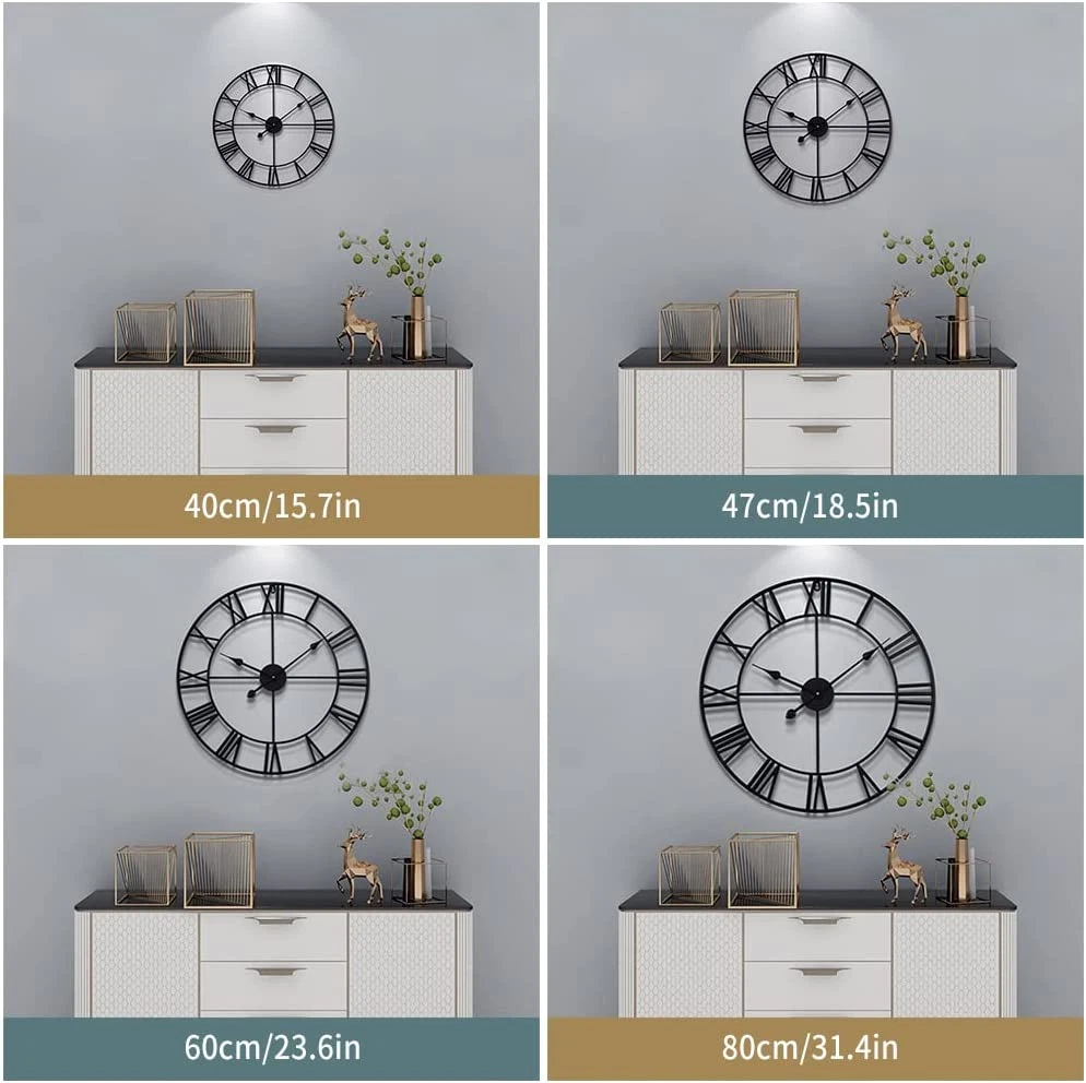 【INDUSTRIAL CLOCK】Large retro metal clock in hollowed-out design, frame of the wall clock is hand-made by solid iron, and high- quality materials ensure the robustness and retro appearance of the Roman wall clock. 【NEARLY SILENT】Using high-quality quartz movement, simple design without pointer sweeping movement, energy-saving, nealy silent and just little ticking, it will not disturb you when installed anywhere. 【MODERN DECORATIVE】Decorative wall clock is suitable for living room, office, bedroom, kitchen, school, classroom and other home or public places. 【EASY TO INSTALL】] The hook design has less damage to the wall but is stronger, the rear slot design is easy to hang, powered by 1 AA battery ( NOT INCLUDE ON PACKAGE). 【GUARANTEED】The movement of this modern wall clocks accept 6-months replacement,if your movement has any problems within half a year, please contact us in time, our team will give you satisfactory after-sales service within 24 hours. Product Description ALMOST SILENT - Using high-quality quartz movement, simple design without pointer sweeping movement, energy-saving, almost silent and little ticking, it will not disturb you when installed anywhere. MODERN DECORATIVE : Decorative wall clock is suitable for living room, office, bedroom, kitchen, school, classroom and other home or public places. ROMAN NUMERALS : Large Modern Metal Wall Clocks Vintage Round Silent Non Ticking Battery Operated Silver Roman Numerals Clock for Living Room/Bedroom/Kitchen Wall Decor MULTIPLE SIZES : Clocks have 40CM / 47CM /60CM size for your option. LEIKE MODERN WALL CLOCKS MODERN DECORATIVE : Decorative wall clock is suitable for living room, office, bedroom, kitchen, school, classroom and other home or public places. ROMAN NUMERALS : Large Modern Metal Wall Clocks Vintage Round Silent Non Ticking Battery Operated Silver Roman Numerals Clock for Living Room/Bedroom/Kitchen Wall Decor MULTIPLE SIZES : Clocks have 40CM / 47CM /60CM size for your option. INDUSTRIAL CLOCK Large retro metal clock in hollowed-out design, frame of the wall clock is hand-made by solid iron, and high- quality materials ensure the robustness and retro appearance of the Roman wall clock. EASY TO INSTALL The hook design has less damage to the wall but is stronger, the rear slot design is easy to hang, powered by 1 AA battery. CLASSIC NUMERAL DESIGN Large size with elongated old European-style numerals make a grand appearance yet lightweight for easy hanging and transport.