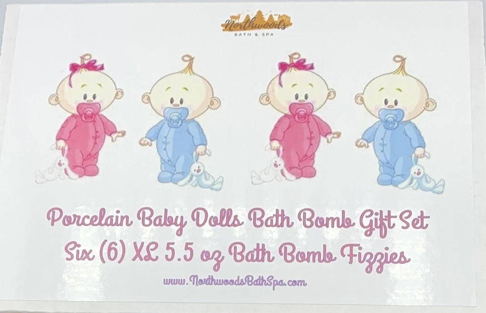 Large Porcelain Baby Doll Figurines 6-pack XL 5.5 oz Bath Bomb Gift Set. Includes six (6) XL 5.5 oz bath bomb fizzies (three [3] Japanese Cherry Blossom and three [3] Cool Water) and six (6) Porcelain Baby Doll Figurines. The Porcelain Baby Doll Figurines are too large to fit inside the bath bomb, so they are loose inside the box next to the bath bombs. The fragrances in this gift set include three (3) Japanese Cherry Blossom (pink) and three (3) Cool Water (blue). (We can make the bath bombs in any fragrance or color; just send us a message what you would like in your gift set.) We also include two (2)Teddy Bear Goat's Milk & Shea Butter handmade soaps. PREMIUM QUALITY - Handmade in Arbor Vitae, Wisconsin. Natural and organic. Comparable to Lush Bath Bombs, ours are 5.5 oz each. PERFECT GIFT IDEA - Includes six (6) XL 5.5 oz bath bomb fizzies and six (6) Porcelain Baby Doll Figurines loose inside the box next to the bath bombs. The Porcelain Baby Doll Figurines are too big to fit inside the bath bombs. NATURAL, VEGAN, ORGANIC, cruelty free. Made with luxury ingredients including Shea, Mango & Cocoa Butter that will help leave your skin feeling soft and smooth. SATISFACTION GUARANTEE - We want you to be happy with your gift set. The fragrances in this gift set include Japanese Cherry Blossom (pink) and Cool Water (blue), but we can make this gift set in other fragrances; just send us a message what fragrance(s) you would like in your gift set. The Porcelain Baby Doll Figurines are also available in our Baby Doll Bathtub Gift Sets.