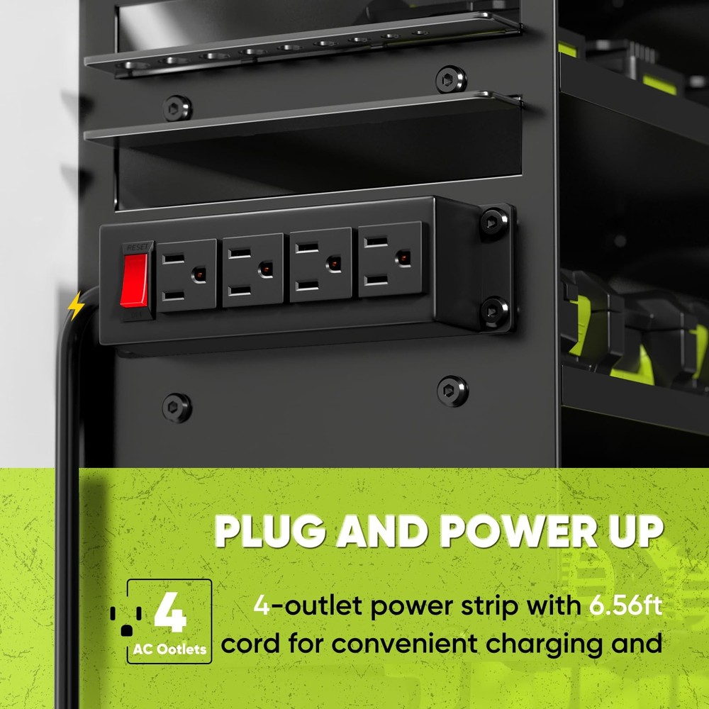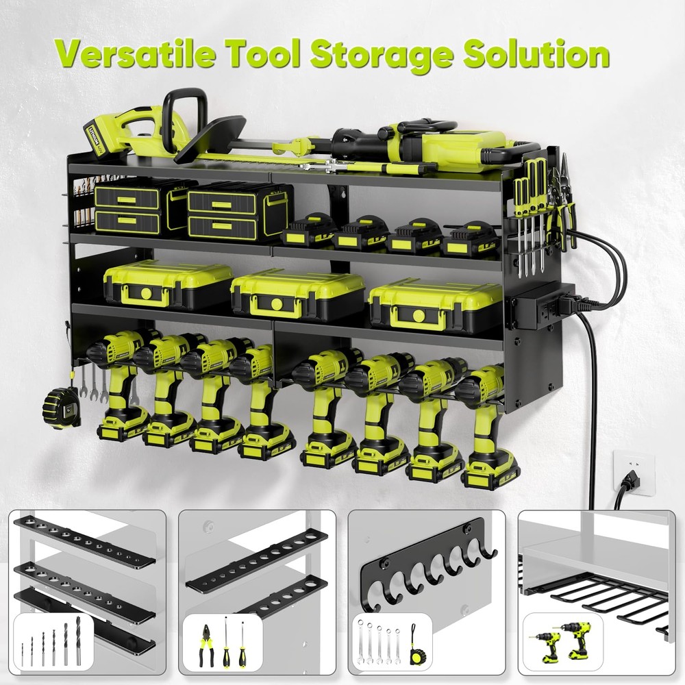 REVAMP YOUR WORKING ENVIRONMENT: Upgrade your workbench or optimize your wall space with our high-quality, enlarged tool organizer that includes an integrated charging station. Enhance your organizational capabilities with extra side compartments and hooks, creating a tidy and efficient workspace that promotes productivity. 4-Outlet Power Strip:This garage shelf wall mount features an integrated 4-outlet power strip with a 6.5-foot cord for easy charging. Charge your tools directly on the shelf without the hassle of searching for outlets. By combining storage and functionality, this tool rack saves space while ensuring your power tools are always ready for use. Heavy-Duty 600lbs Load Capacity: Constructed from high-quality, industrial-grade metal,our power tool organizer wall mount with charging station supports up to 600lbs, ensuring exceptional durability. Extensive load-bearing tests confirm its strength, allowing you to store heavy tools with confidence, free from concerns about breakage or instability. It is ideal for securely holding power tools of any size or weight. 4-Tier Tool Rack: This tool storage rack with power strip features two side drill bit racks, a hook rack, six shelves, eight drill slots, and an four-outlet power strip, making it your all-in-one solution. Easily organize your toolbox, drills, chargers, batteries, hammers, and screwdrivers. With ample space for all your garage tools, this rack optimizes storage and effortlessly eliminates clutter. Space-Saving Tool Organization: this power tool battery shelf transforms cluttered tool areas into clean, Ideal for garages, workshops, and tool rooms, it accommodates a wide range of tools. Designed to keep workbenches clear and maximize storage, this organizer is essential for any professional or DIY enthusiast. Hassle-Free Quick Installation: Our cordless drill holder comes with a comprehensive manual and high-quality installation accessories for swift and straightforward assembly. It is compatible with wooden walls, concrete surfaces, and pegboards, allowing it to integrate seamlessly into your workspace. Assemble it in just minutes and enjoy a tidy, easily accessible storage solution for your tools.