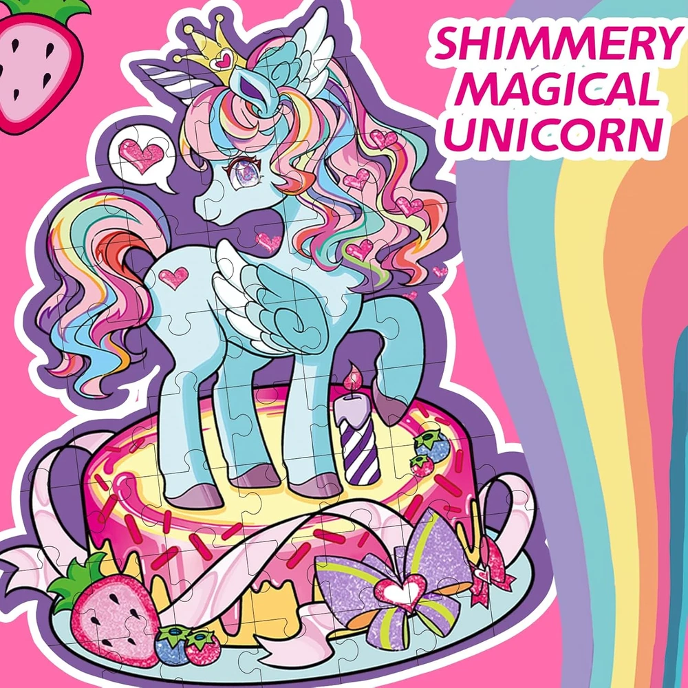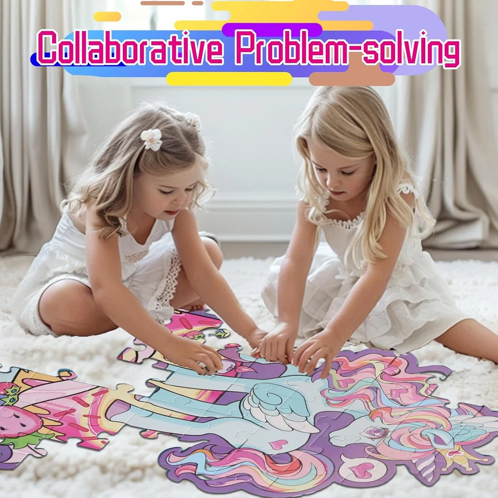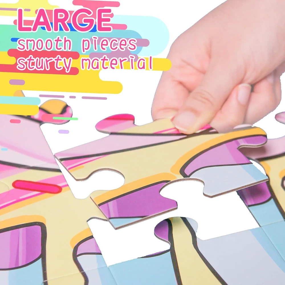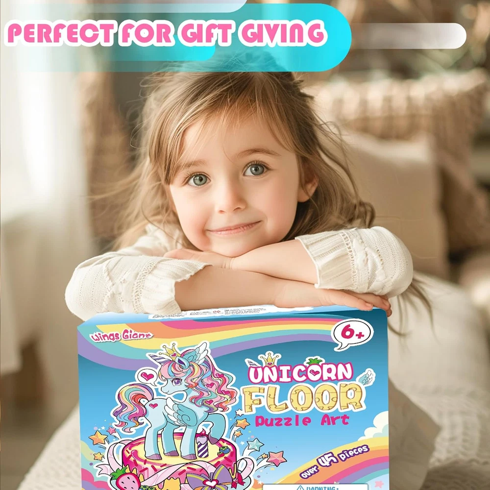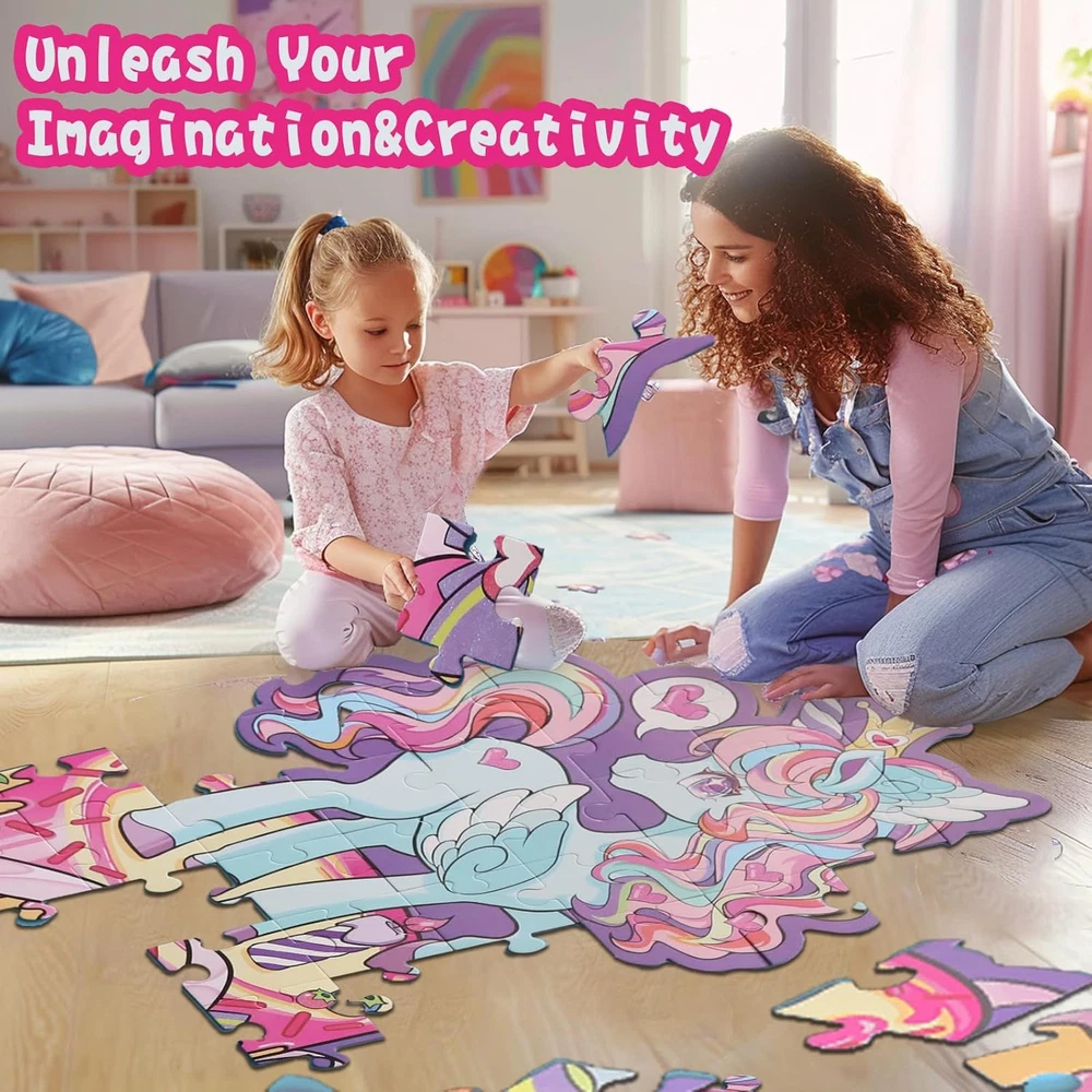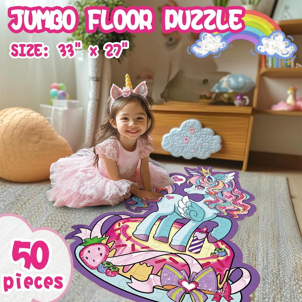 【Magical Unicorn Adventure】Looking for special gifts for girls? Let's dive into a world of Magical Unicorn Floor Puzzle! Our uniquely shaped unicorn puzzle adds an extra layer of excitement and challenge. This enchanting design captivates young minds, igniting kid's creativity and imagination, and making every playtime a magical journey. 【Perfect Size for Little Explorers】Measuring a remarkable 27" x 33", this giant floor puzzle offers a perfect play space for children to spread out and immerse themselves in the puzzle-building experience. The large size encourages hands-on interaction and active play, fostering a sense of adventure as they piece together the majestic unicorn. 【Dazzling Shimmer Effects】Transform playtime into a sparkling spectacle with our puzzle's unique shimmery highlights! These eye-catching elements reflect light beautifully, adding an extra touch of enchantment. Each piece dazzles as it's placed, captivating children and making every puzzle session a visually stunning experience. 【Designed for Little Hands】Our puzzle is designed for young children, featuring large, sturdy pieces that are easy for little hands to grasp and maneuver. Crafted from durable, high-quality materials, each piece ensures long-lasting play and withstands the enthusiasm of eager young puzzlers. This design helps develop fine motor skills, boosting their confidence with every successful piece placement. 【Quality You Can Trust】Enjoy a premium puzzle experience with expertly crafted pieces that fit together seamlessly. Our top-notch design ensures frustration-free assembly, while also helping children develop crucial skills like hand-eye coordination, problem-solving, and spatial awareness. This educational and entertaining activity is sure to be a hit with both kids and parents! Product Description Let Children Play Happily with Magical Unicorn Floor Puzzle!