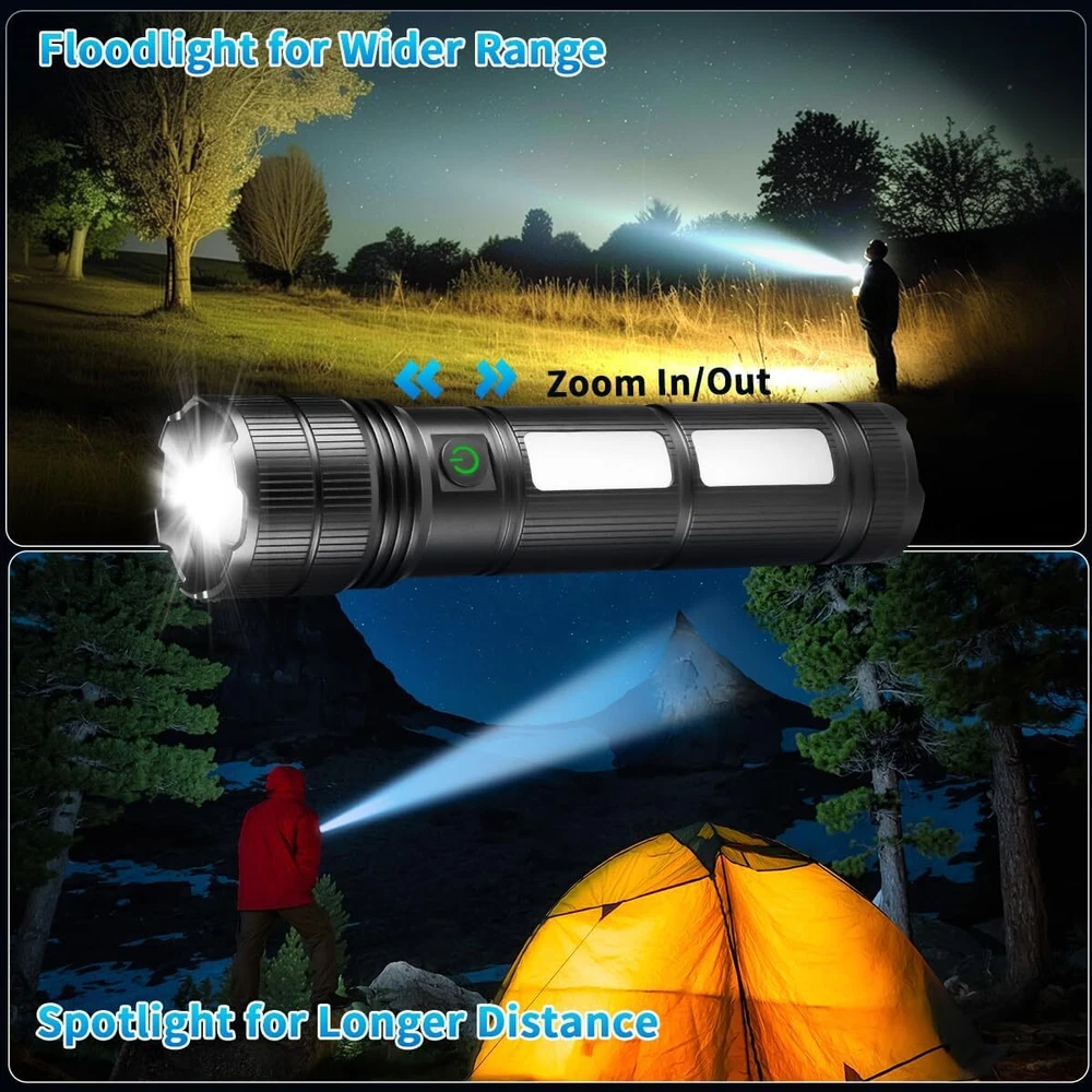 Large Size & High Powered Flashlight, Flashlights 1Pack, Bright Black Description Features: Large Size & High Powered Flashlight: KYEKIO rechargeable flashlight is equipped with an ultra-bright upgraded LED chip, which can reach a maximum brightness of 1,000,000 high powered, lighting up to 4000ft. LED flashlight is equipped with 7200mAh rechargeable battery, so it can provided up to 24 hours of powerful and non-diminishing brightness. Tactical flashlight adopts large size design, the length is 8 inches and the diameter is 2 inches, meeting your professional lighting needs. Adjustable Focus & 4 Working Modes: Adjusting the focal length of the flashlight can change the size of the beam, so that you can switch the long-distance observation function as spotlight and wide-range lighting function as floodlight. This handheld flashlights has 4 lighting modes: High Mode, Medium Mode, Strobe Mode and Side Light Mode. You can Turn Off the rechargeable flashlights by long pressing the buttons for 3s in any mode. Rechargeable Flashlight & Power Digital Display: The LED flashlight high lumens rechargeable is built-in 2 interfaces, one is Type-C input for charging, the other is USB output which can charge your smartphone, earphone or any other USB devices. The newly upgraded LCD power display is clearly visible, so you can always easily and accurately grasp the remaining power of the brightest flashlight. Water Resistant & Heavy Duty Flashlight: The sealed design of the tactical flashlight makes it have good waterproof performance. The flash light can be used in heavy rain, snow, and other harsh weather conditions. Made of aviation grade aluminum alloy, the flashlight is anti drop and shatter-resistant, so you don't need to worry about dropping the flash light and in emergencies it can also be used for self-protection. Product Details: Special Feature: High Power, Adjustable Light Modes, Adjustable Focus, Rechargeable Color: Bright Black Power Source: Battery Powered Light Source Type: LED Material: Aluminum White Brightness: 1000000 Lumens Included Components: 1* TypeC-USB Charging Cable, 1* User Manual, 1* Rechargeable Flashlight, 1* Packing Box, 1* Carrying Lanyard Product Dimensions: 2"D x 2"W x 8"H Light Path Distance: 4E+3 Feet Battery Cell Composition: Lithium Ion Number of Batteries: 6 Lithium Ion batteries required. (included) Water Resistance Level: Waterproof Brand: KYEKIO Brightness: 1000000 lumen Battery Description: Lithium-Ion Runtime: 24 hours Style: Modern Bulb Base: GU4 Bulb Shape Size: S6 Finish Type: Black Specification Met: True Mounting Type: Handheld Recommended Uses For Product: Emergencies, Fishing, Camping, Home, Hiking Manufacturer: Yuyao KeRun Technology Limited Size: 1Pack Part Number: Flashlights L90 Item Weight: 1.09 pounds Item model number: Flashlights L90 Batteries: 6 Lithium Ion batteries required. (included) Item Package Quantity: 1 Finish types: Black Special Features: High Power, Adjustable Light Modes, Adjustable Focus, Rechargeable Batteries Included?: Yes Batteries Required?: Yes Product Dimensions : 2 x 2 x 8 inches; 1.09 Pounds Item model number : Flashlights L90 Batteries : 6 Lithium Ion batteries required. (included) Manufacturer : Yuyao KeRun Technology Limited Special Feature: High Power, Adjustable Light Modes, Adjustable Focus, Rechargeable Color: Bright Black Power Source: Battery Powered Light Source Type: LED Material: Aluminum Handling We will ship all orders within 3 business day of payment. Delivery We take pride in offering fast and reliable delivery for your orders! We are committed to getting your products to you as quickly as possible. Generally, we would like to inform you that all orders will be delivered to you within 1-3 business days after processing.However, in some cases, delivery times may vary depending on the buyer's location. Especially in remote or rural areas, the expected delivery time may be extended. In such situations, we do our best to ensure that your order reaches you as quickly as possible.If there are any delays, we will be happy to contact you to explain the situation. Our goal is to enhance your satisfaction with our fast delivery times. We work diligently to ensure that your order arrives safely.Trust us and enjoy our speedy delivery! Return Policy All items qualify for returns within 30 days of receipt. Buyer is responsible for return shipping on any item that is not damaged. Feedback We take our reputation seriously, we buy and sell online, so we understand the value of trust. If you are unsatisfied with your order, please contact us and we will work with you to resolve it to your satisfaction.