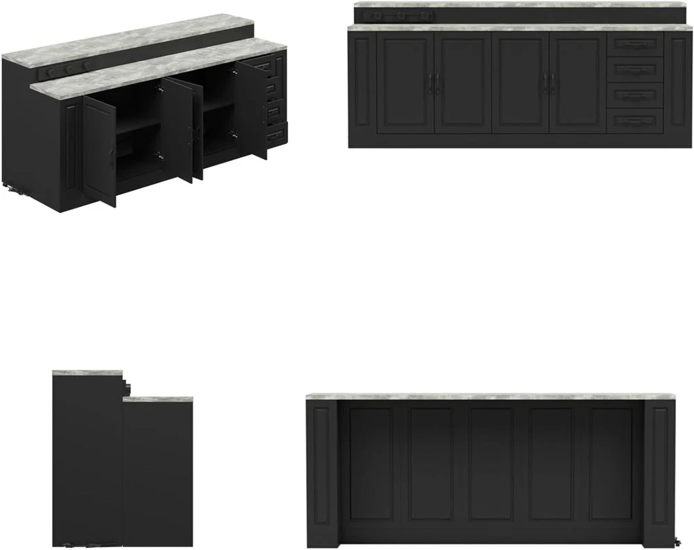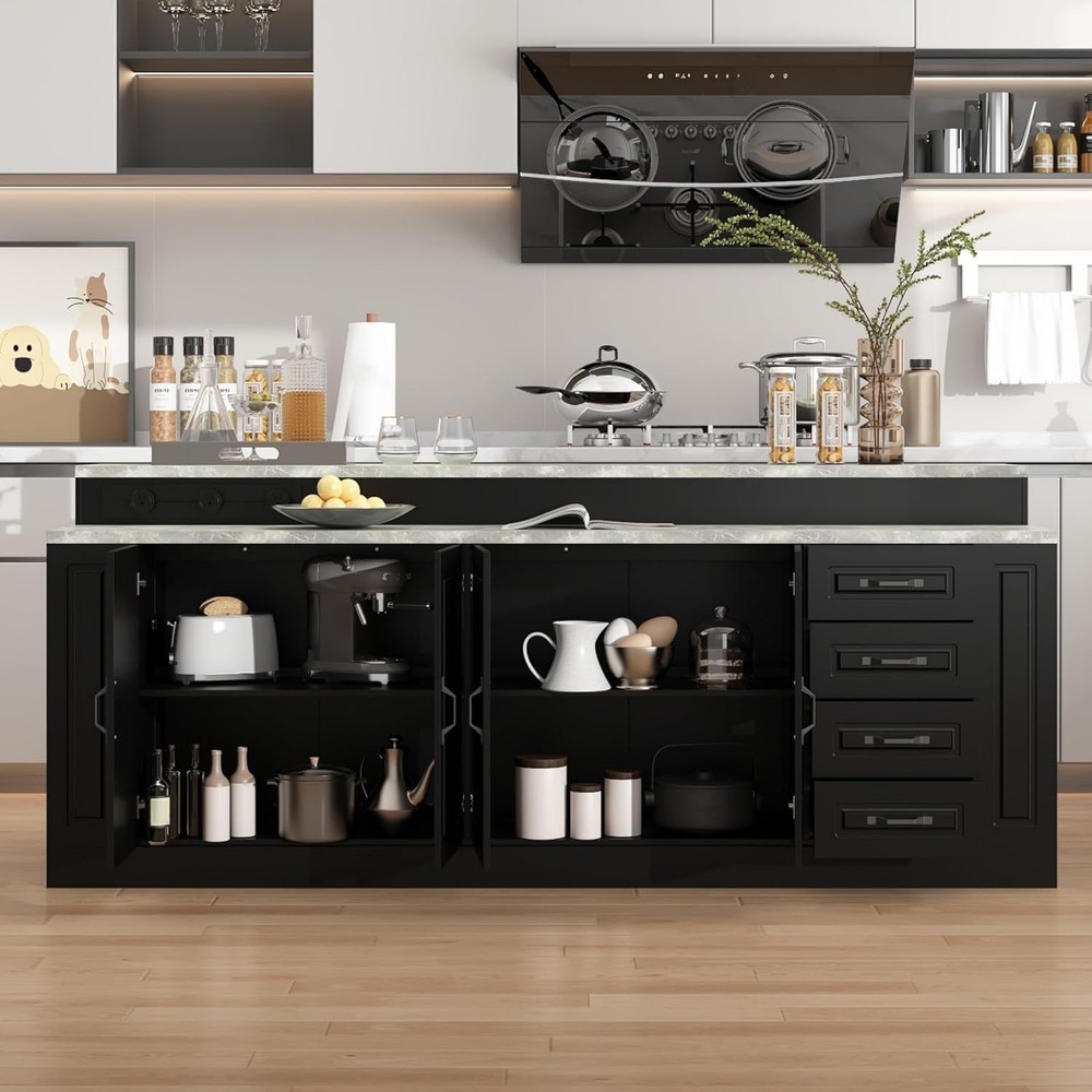 Product Description Large Stationary Kitchen Island with Charging Station, Modern Storage Kitchen Island Table with Drawers and Shelves, Marble Grey Desktops, Black 31.3”D x 94.5”W x 39.4”H Charging Station - This modern kitchen cart island features charging station with 3 ports to meet your charging needs. The ports are removable to fit your electric cookers, blender and microwave. Featuring 4 drawers and 2 large cabinets with shelves, this island offers plenty of storage to organizer your kitchen items. Mable Grey Desktops - Double layered design with marble veneered desktops showcase a modern look for this large kitchen island. You’ll have enough space to place food containers, bowls, plates, cookers and more. Stable & Durable - The stationary kitchen island is mainly made of quality MDF and the desktops are made of particle boards. Raised base enhances stability and black painted surface prolongs service life. The desktop is 30mm thickness, which is sturdy enough for daily use. 2-Person Assembly - To make sure the stability, this item is divided into a large number of pieces. Please follow the instructions step by step with all your caution. Every piece is labeled and all hardwares are included with instructions. Overall Dimension: 31.3”(W) x 94.5”(D) x39.4”(H). Before Assembly - The item will come with 3 boxes, including a clear manual and necessary hardware. Please check all parts are received and intact before assembly process and follow the directions to setup carefully. The 3 boxes may not arrive at the same time, please wait patiently.