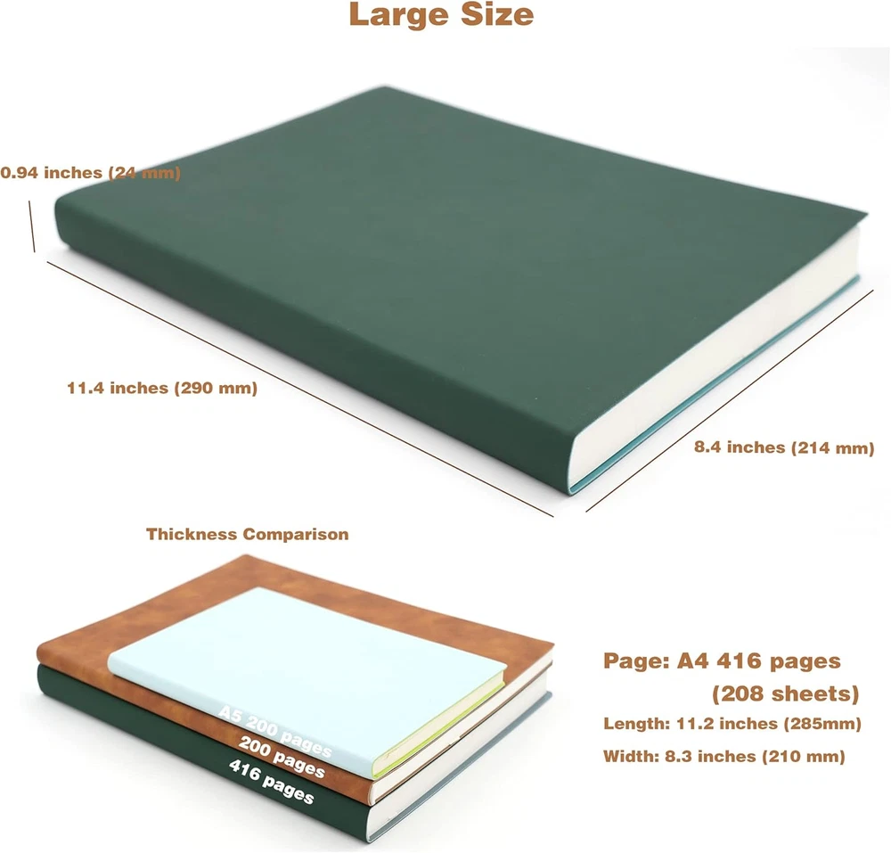Store New Arrivals Add to Favorite View Feedback Contact Large Thick Journal Notebook, Blank Papers, A4 8.4X11.4 Inches, 416 Pages Description Item model number DHBZ-0422 Style Plain Product Dimensions 11.4"L x 8.4"W x 0.94"Th Number of Items 1 Color Green, Plain, 416Pages Pages 416 Pages Cover Material Faux Leather Sheet Size A4 Manufacturer Part Number DHBZ-0422 Item Weight 2.43 pounds Theme Book Ruling Plain Ruling Type Plain Special Feature Soft cover Brand BenOpinion Manufacturer WMWL Large Journal: This is a large journal, 8.4x11.4 inches (214x290 mm) , 0.94 inches (24 mm) thick. It weighs approximately 2.5 pounds (1.15 kg). It gives a heavy sense of satisfaction. Thick Hardcover Notebook: Exquisite and concise appearance, 416 pages (208 sheets) of paper are stitched with thread, can be opened at 180 degrees and laid flat without falling pages, which is convenient for writing. With a white tape bookmark. Soft Faux Leather Cover: This journal uses soft faux leather cover, which is soft and delicate, comfortable to the touch, strong and durable, and protects the paper very well. This notebook uses 80 gsm high-quality A4 paper, 8.3x11.2 inches(210x285 mm) . Larger pages can record more content. Blank pages, you can write more forms of content and draw pictures. Fountain pen friendly, no bleed through with ink. Applicability: This journal is very suitable for taking notes, writing diaries, creating, drawing, office, and helping you record more content. Due to its large size and large number of pages, it is also very suitable as a sincere gift to friends, children, classmates, colleagues and employees. Product Description Large Size This notebook uses A4 pages, 8.3x11.2inches (210x285mm), and more content can be recorded and displayed on one page, which is clear at a glance. Lots of Pages This journal has 416 pages (208 sheets) of paper, stitched with threads, it is strong and will not fall off.It is about 24mm (0.94inch) thick and weighs about 1.1kg (2.4Lb). Soft Leather Cover This notebook has a soft faux leather cover, it is made of P.U. leather, a man-made, animal-free material that looks and feels like genuine leather. It is soft, comfortable and strong. This notebook has two types of ruled pages and blank pages. The line spacing of ruled type pages is 0.43inch (11mm). Wider line spacing allows you to write freely. The blank page type of notebook is not only suitable for writing but also for sketching. A4 size blank paper, and it has double the size of A4 paper when opened at 180 degrees. You can draw larger pictures and record more forms of content. Great Gift After a long time or when we are old, open the notebook and look at the things we recorded before, recalling the original scene, what a warm and meaningful thing. ABOUT US We offer the best prices around on high quality products. Our E-store includes media such as books, movies, music and games while offering electronics, toys, sporting apparel, clothing, tools, general home, garden items and more. SHIPPING We are always working hard to ensure your package arrives as soon as possible. Please understand that some factors like weather, high postal traffic, and the performance of shipping companies are outside of our control. We offer free shipping to the lower 48 states and ship within 2 business days of payment, usually sooner. We do not accept P.O. Boxes. Please provide a physical address. RETURNS We offer a 30-Day Return Policy on items which you are not completely satisfied with. You have the option for a full-refund or an exchange of the item. No returns are available on items shipped outside of the USA. PAYMENT We accept PayPal. CONTACT US This page content is yet to come Please ad us to your favorite seller and visit again later Thank You CUSTOMER SATISFACTION We try our very best to make sure every customer is completely satisfied. If there's a problem, message us! We're happy to help.