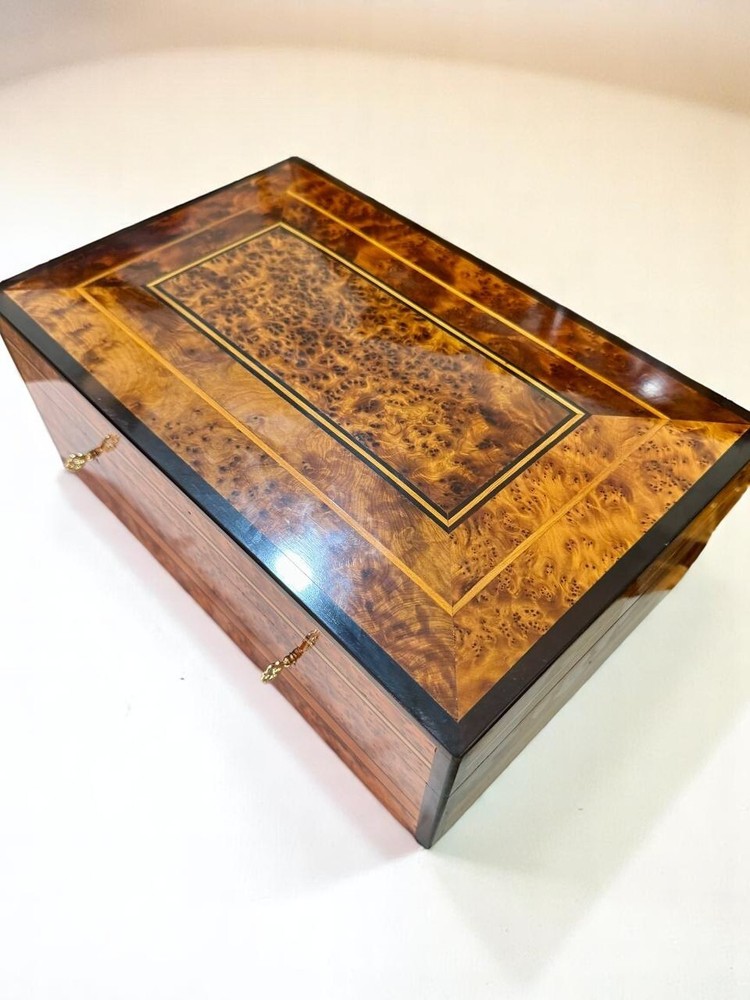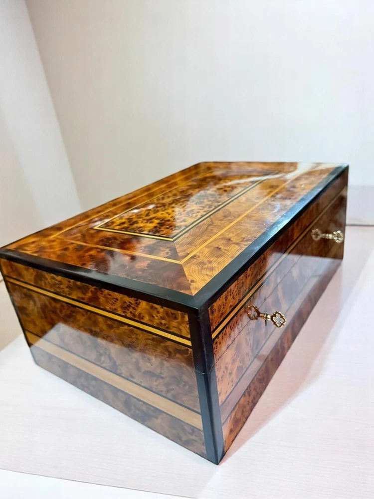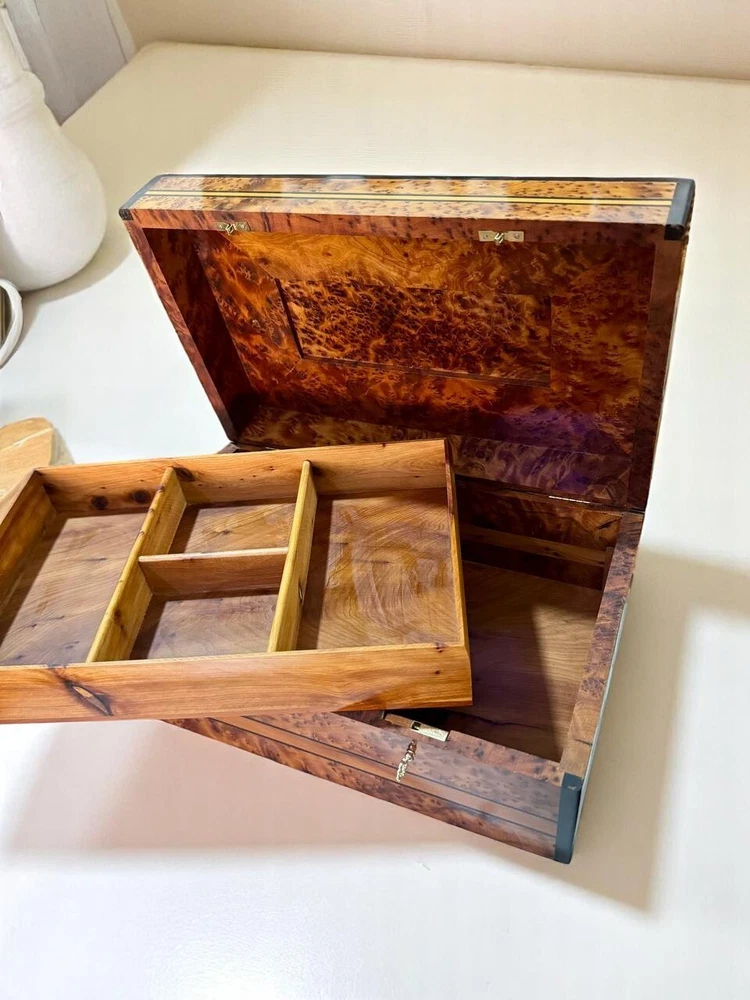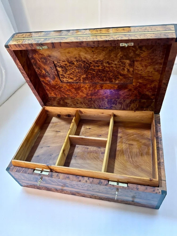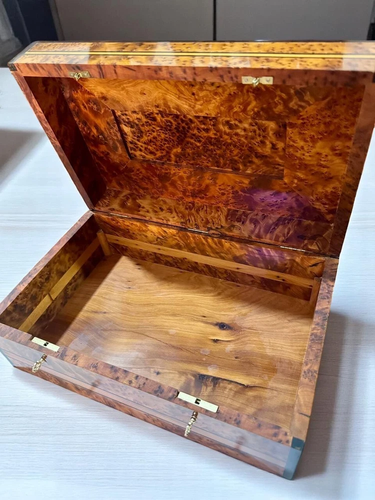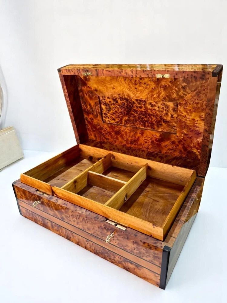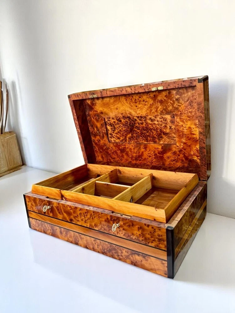 Elevate your storage with this Large Burl Wooden Thuya Jewelry Organizer, expertly handcrafted by Moroccan artisans using rare Thuya root burl. Designed to hold and protect your most cherished items, this statement piece offers both refined beauty and practical functionality. 🌿 Exceptional Thuya Burl Wood This luxurious jewelry box is made from aromatic Thuya wood, known for its rich scent, intricate swirling grain, and deep amber tones. Each box is unique—no two grains are alike—making it a functional work of art. ✨ Key Features: • Large capacity for organizing jewelry, documents, and keepsakes • Lockable with brass key for added security • Premium Thuya burl wood from the Atlas Mountains of Morocco • Velvet or leather interior available (optional) • Ideal as a luxury gift or heirloom-quality personal box 📏 Product Dimensions: • Length: 36 cm (14.2 in) • Width: 23 cm (9.1 in) • Height: 13 cm (5.1 in) 🎁 A Gift of Meaning and Craftsmanship Whether for weddings, anniversaries, or legacy gifting, this large burl Thuya wood jewelry box offers timeless value and unmatched artisan quality. 📩 Need Customization? We can engrave your name, message, or logo on the lid. Feel free to message us to customize your box or view additional patterns and finishes.