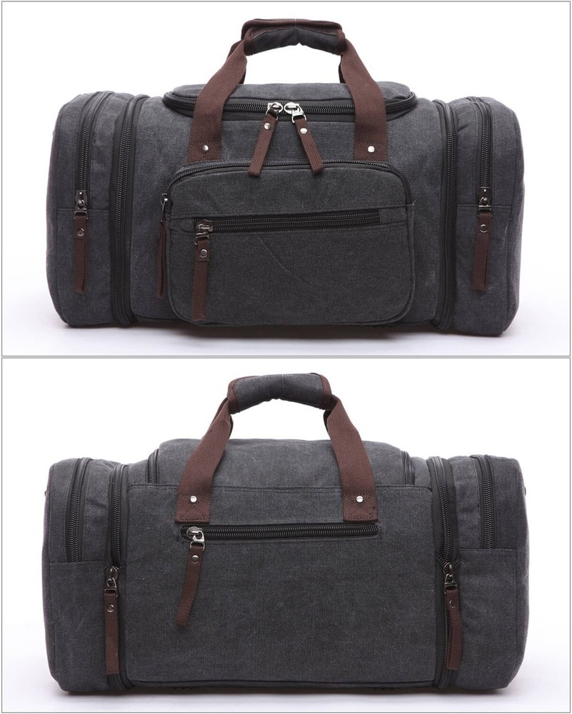 Duffle Bag for Travel, Large Canvas Duffel Bag for Travelling Overnight Weekender Bag Carry On Bag for Men Women Black Product Details Color: Black Brand: VanBasic UPC: 769894491317 EAN: 0769894491317 MPN: Does not apply Product Dimensions: 20.87 x 9.84 x 11.81 inches Item Weight: 2.87 pounds Department: Unisex Adult Manufacturer: VanBasic Number of Compartments: 1 Item Weight: 2.9 Pounds Capacity Total: 50 Liters [Material] This duffle bag is made of 16 Ann high density durable canvas materials, exquisite workmanship etc, Strong and Durable, comfortable handle for carry. [Expandable Design] Regular Size: 53 x 25 x 30 cm (20.9 (L) x (W) 9.8 x (H)) 11.8 inch. Weight: 1.3kg/2.89 lb. Pull down 2 side zippers to extend the bag to 24.8 inches long. This duffel bag can also as a carrying luggage on flight without any worries. [Multi-Pocket & Large Capacity] Weekender bag Interior with 1 large main compartment and 1 zipper pocket. Exterior with 2 side zipper pockets, 2 front zipper pockets and 1 back zipper pocket. Spacious with 50L to hold 15'' laptop, iPad, clothes, shoes and other daily essentials for long or short trip. [Thoughtful Detail Design] (1) This travel bag comes with rounded stitched grip handles & padded adjustable, removable shoulder strap. So you can take it as a handbag or a shoulder bag comfortable. (2) 4 high quality plastic cushions at the bottom to make the bag well resistance to dirty and wear. [Multipurpose] A Good travel duffle bag for Men & Women. Can also be used as a weekend bag, overnight bag, short journey bag, toiletry bag, camping bag, business duffel, sports gym duffle, carry-on luggage, etc.