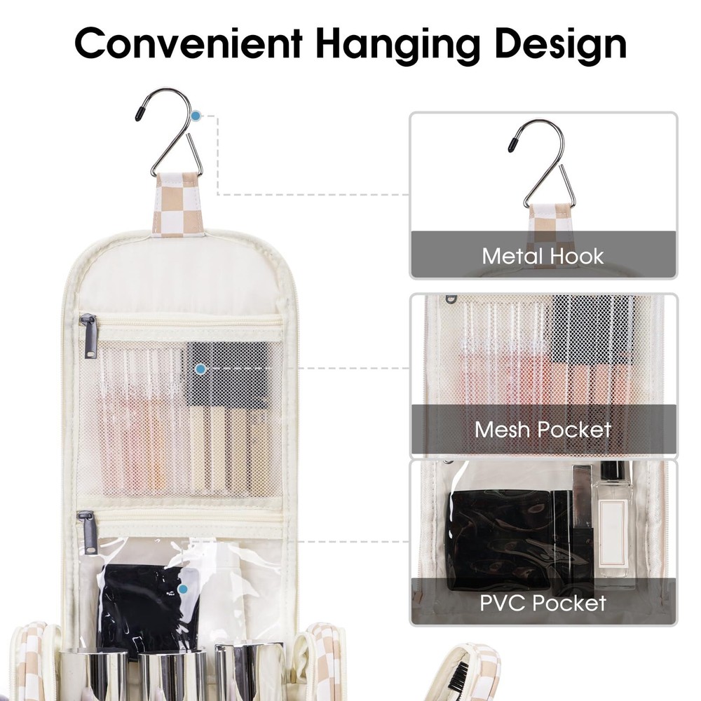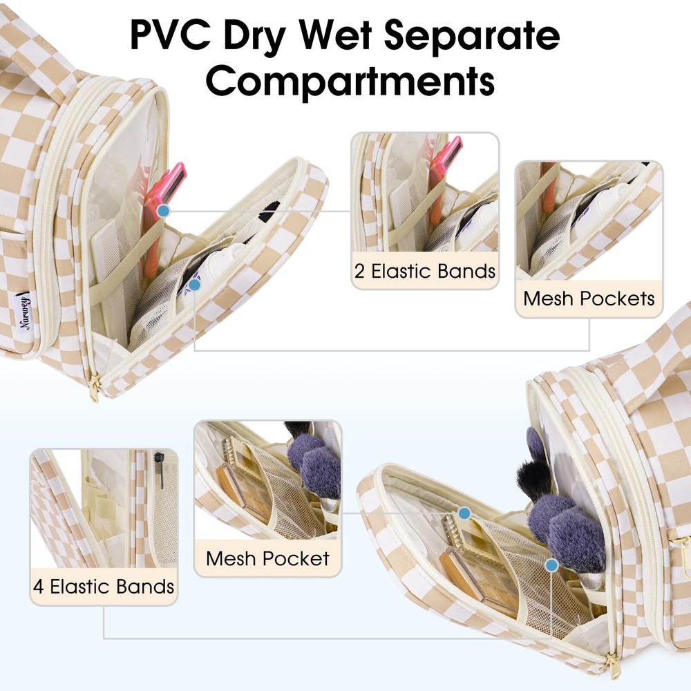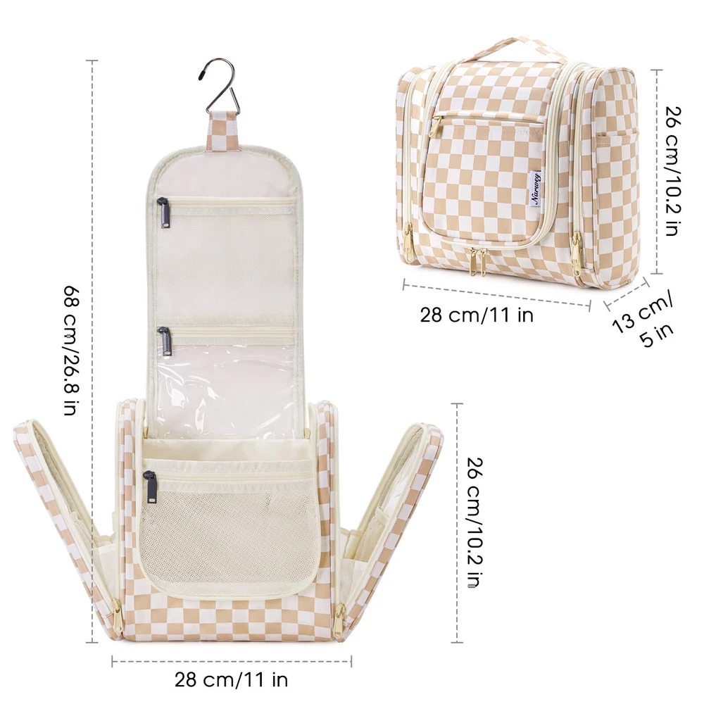 Narwey Large Hanging Toiletry Bag for Women Travel Makeup Bag Organizer Toiletries Bag Dry Wet Separation (Light Brown Checkerboard) Practical 10.2" Tall. Dimension:11"x10.2"x5”/28x26x13cm. The main compartment featured with several mesh pockets and elastic bands has a practical height of 26cm (10.2") which could easily well organize travel-size toiletries as well as makeup like shampoo, conditioner, lotion, toothpaste, toothbrushes, hair brush, shaving kit and a few extra items Dry Wet Separated Side Pockets. PVC-lined compartments on both sides are dustproof and enable effective wet-dry separation. The left side features 4 elastic bands and a mesh pocket for makeup tools, while the right side has 2 wider elastic bands and a mesh pocket for toothpaste, toothbrushes, and wet towels Not Bulky Design. Large capacity yet compact design, weighs merely 14 ounces. Pack-it-flat design ensures it doesn't occupy much space in your suitcase Details Oriented. Built-in large metal hook allows hanging the toiletry case from towel rack, coat hook or wherever is available, making your toiletries and cosmetics displayed well for easy access, saving bathroom counter space as well. Water-resistant and durable fabric protects your gear from spills. Soft fabric and reliable zippers ensure durability. Wide opening and rectangle shape makes it easy to stand on its own Versatile. Compact, sturdy, portable, lightweight, which makes it a good for business trips, travel, gym, camping, home use and more SHIPPING Domestic Buyers - We have confidence in our products, but if you are not fully satisfied please contact us within 30 days of purchase and you will get full refund. - We ship within 3 business days of payment, usually sooner - We offer FREE shipping on all orders! - We only ship to the lower 48 states, no APO/FPO addresses or PO Boxes allowed International buyers – please note: Import duties, taxes, and charges aren't included in the item price or postage cost. These charges are the buyer's responsibility. - Please check with your country's customs office to determine what these additional costs will be prior to bidding or buying. * Order Cancellation Policy ** You can return a product for up to 30 days from the date you purchased it. 1. The seller reserves the right to cancel the special case only due to eBay cancellation fee. 2. The decision of seller is the final. 3. The seller will respond to the cancellation request within 2 business days. Please wait for the result of cancellation. 4. In case the cancellation is not completed by some reasons, the buyer can follow the options below to get the refund. 4.1 The buyer can reject the item when it arrives. 4.2 The buyer can send the item back to the seller within 30 days If the buyer receives item (USA Shipment ONLY). The seller will provide the FREE return label to the buyer when the buyer opens " Return Item" case on eBay by using the reason as "Change my mind" ONLY. 5. When buyer has placed the order. The order will be processed and completed by automatic warehouse system within 5 minutes. In case that buyer sends the cancellation request after 5 minutes of placing the order, the request will be rejected. **Sending direct message to cancel the order is not allowed for every case.* Return Policy For the return case - If buyer would like to return the items for refund or replacement, please CONTACT SELLER to receive the free return label from seller. The refund or replacement will be processed with the tracking number of return label which is provided by seller only. The other ways of return which are not approved by seller will not be processed for the refund or replacement.