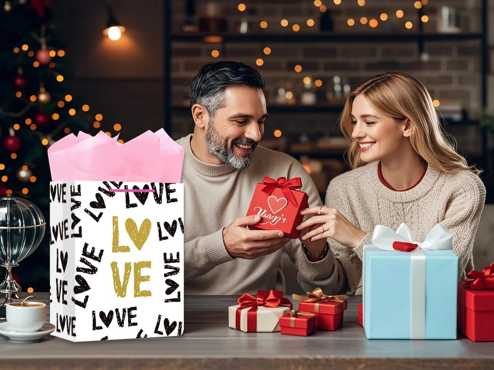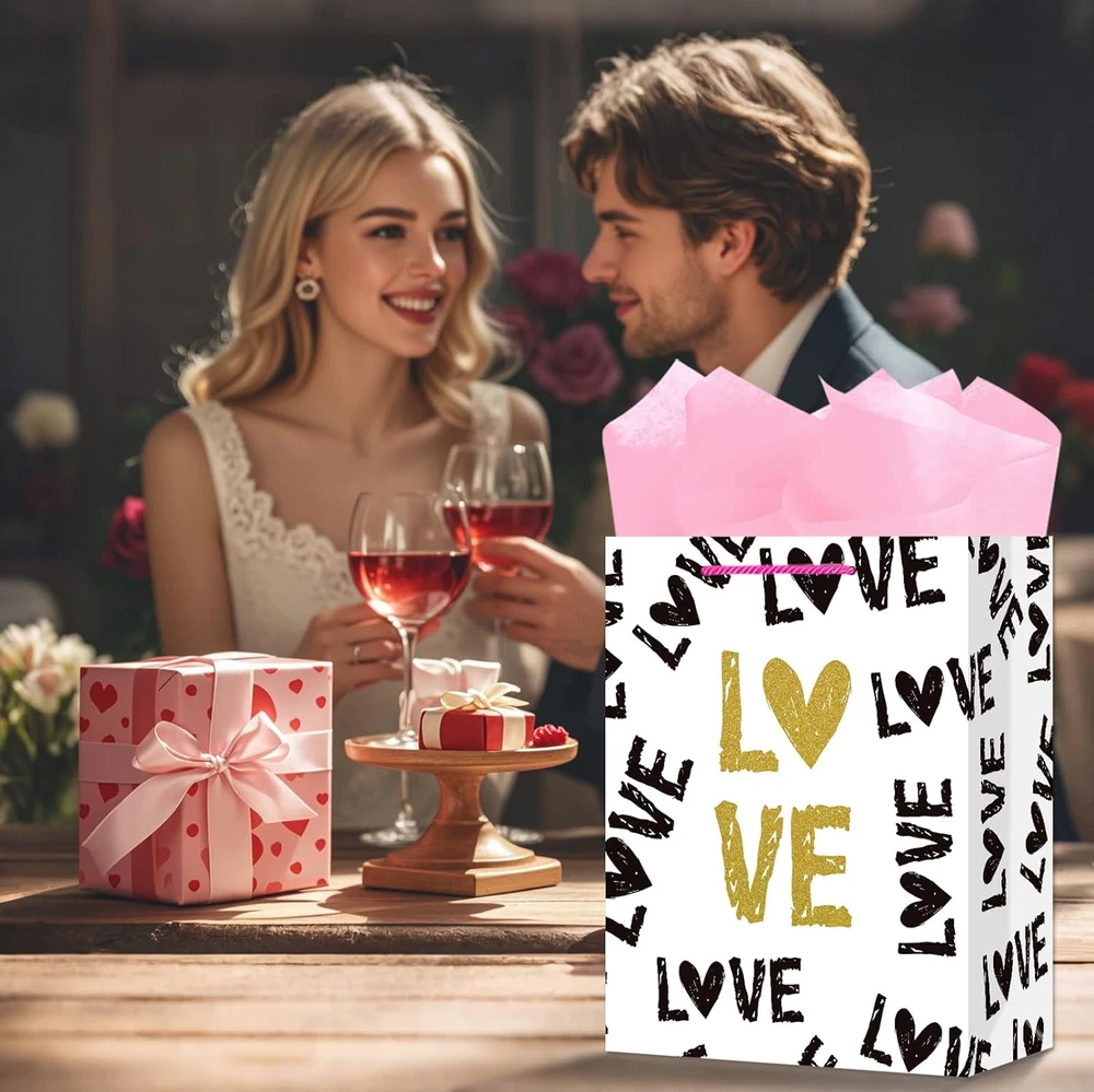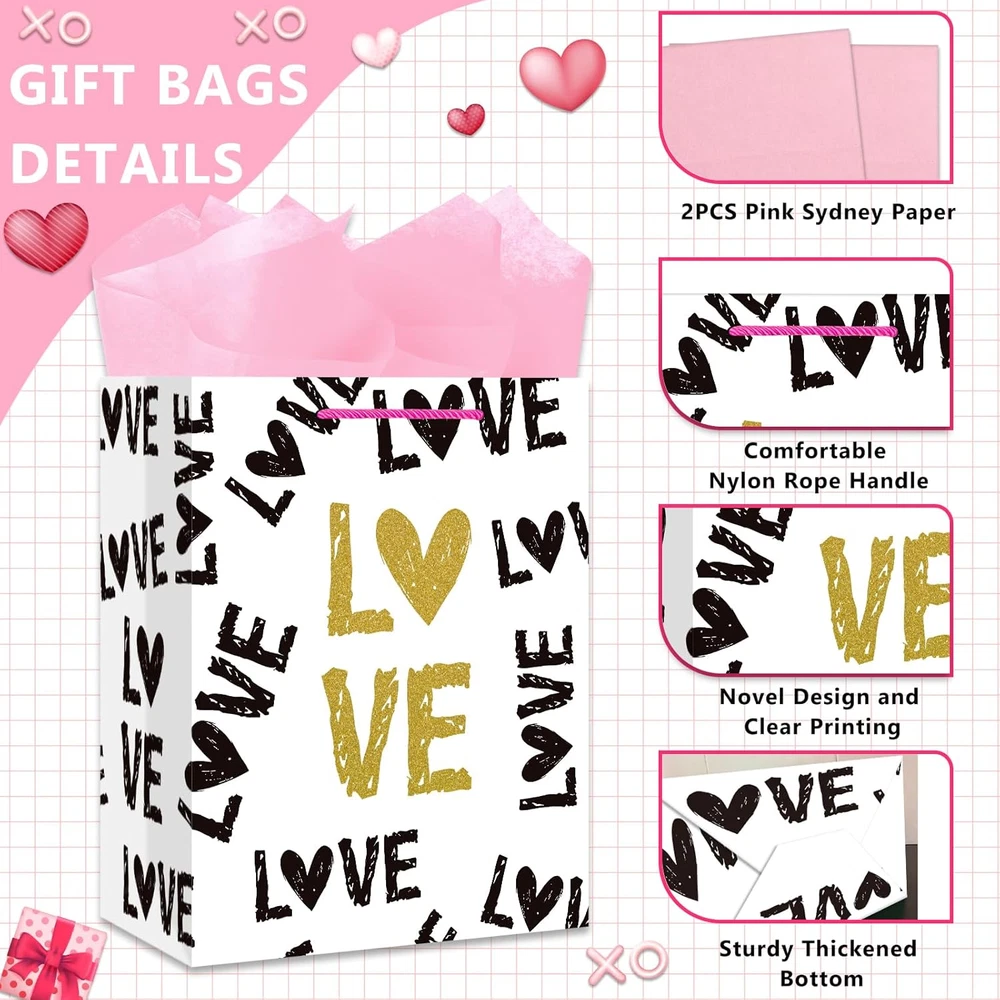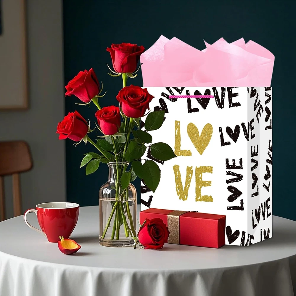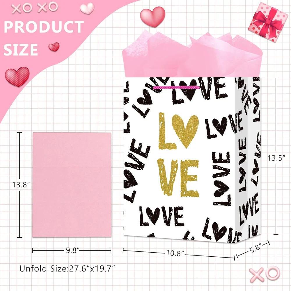 Valentines Day Gift Bag: Valentines Day gift bag with handles and 2 pieces wrapping tissue paper, which will match your Valentines Day party decoration and make a delicate Valentines Day gifts package for her him girlfriend boyfriend wife husband women men. Large Gift Bags with Tissue Paper: Valentines Day gifts bags with tissue paper measures about 13" tall x 10.2" long x 5.8" wide, large capacity for you to hold Valentines Day gifts for girlfriend boyfriend wife husband her him women men. Eco-Friendly Material: Our Valentines Day paper bag is made of high-quality paper materials, reliable and reusable, easy to fold and carry or store for next use. Valentines Day Design: These Valentines Day gift bags feature love related elements, printed with many words " love ", the Valentines Day bag is a great gift idea for husband wife, Valentines Day gift bag for him her, Valentines Day paper bag for mom dad, Valentines gift bag for boyfriend girlfriend. Celebrate with Love: Celebrate this valentine's day with our vibrant gift bags that are as functional as they are heartfelt. They are the ideal choice for anyone looking to wrap their presents in warmth and thoughtfulness, ensuring every moment of your special day is cherished. Valentines Day gift bag with handles and 2 pieces wrapping tissue paper, which will match your Valentines Day party decoration and make a delicate Valentines Day gifts package for her him girlfriend boyfriend wife husband women men