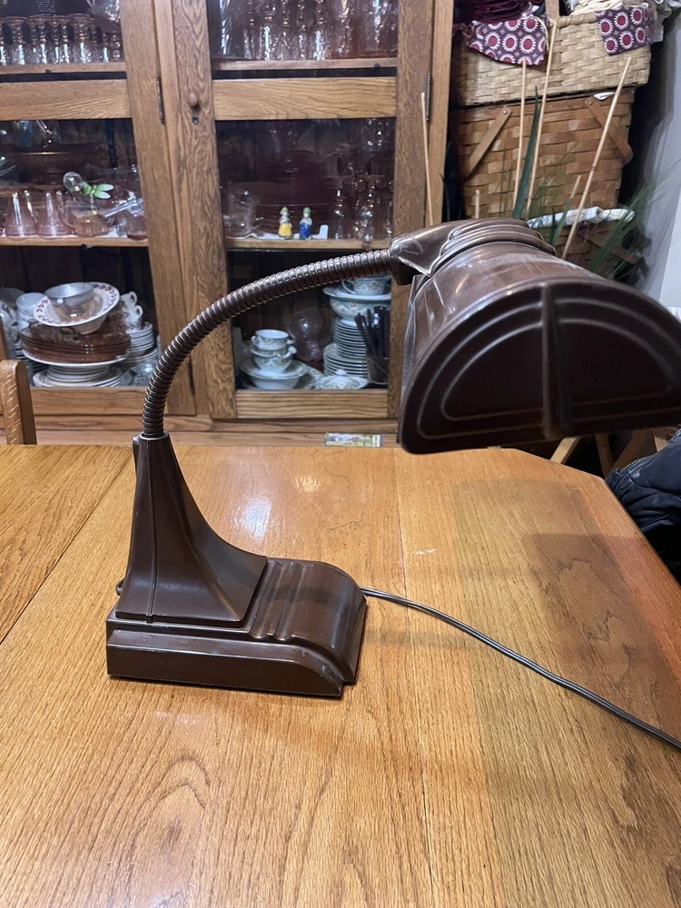 Era: 1940s Brand: Antique Color: Brown Lighting Technology: Fluorescent Tube Vintage: Yes Design: Shaded Power Source: Corded Material: Brass, Metal Style: Art Deco Antique: No Manufacturer: na Cord Color: Brown Light Color: na Type: Desk Lamp Time Period Manufactured: 1930-1960 Sensor Type: Light Original/Reproduction: Original Size: Large Shade Shape: Banker's Lamp Control Style: Switch