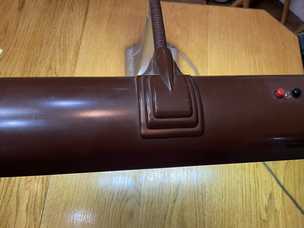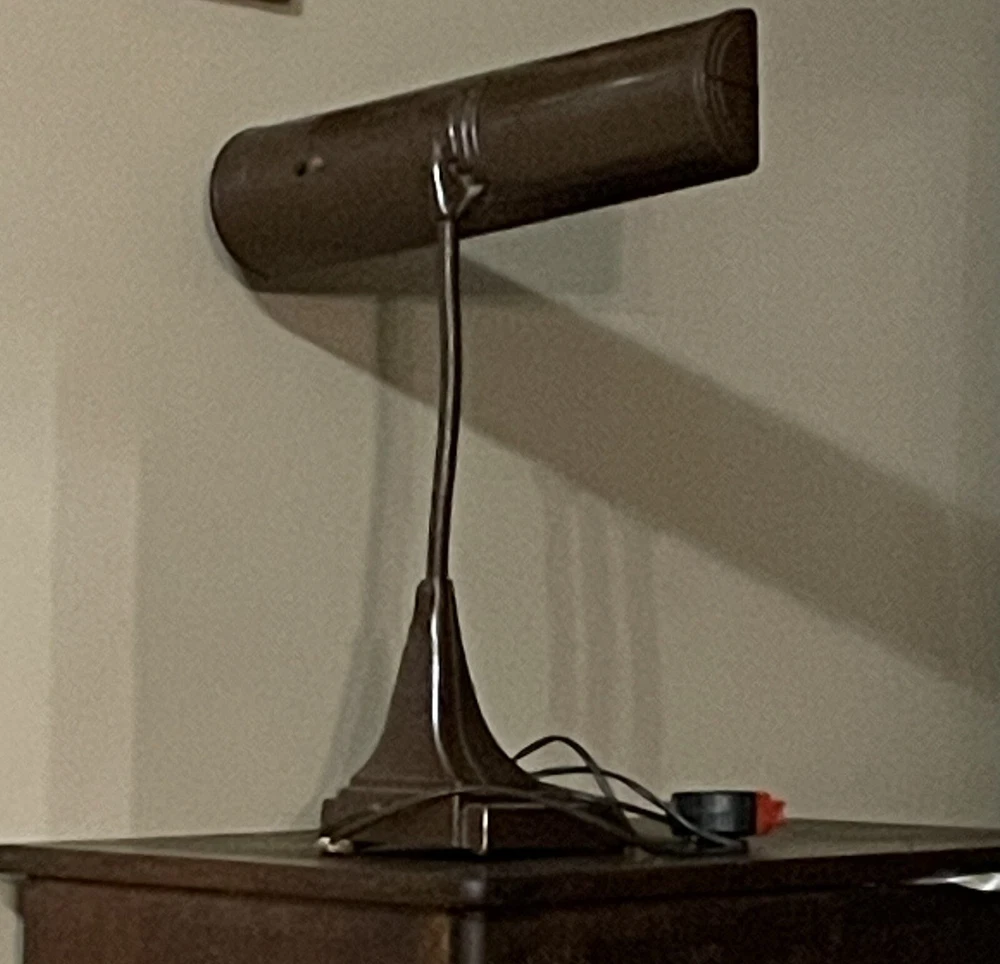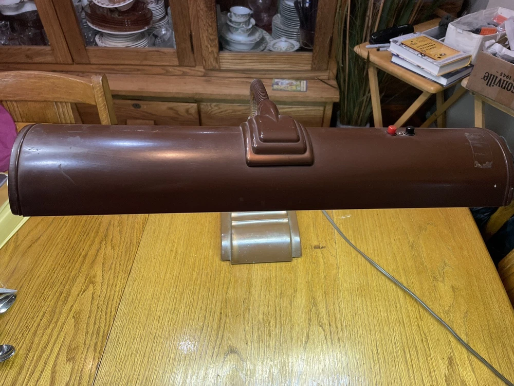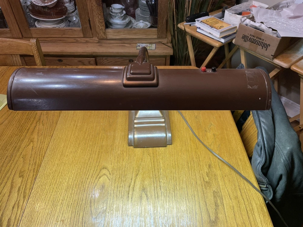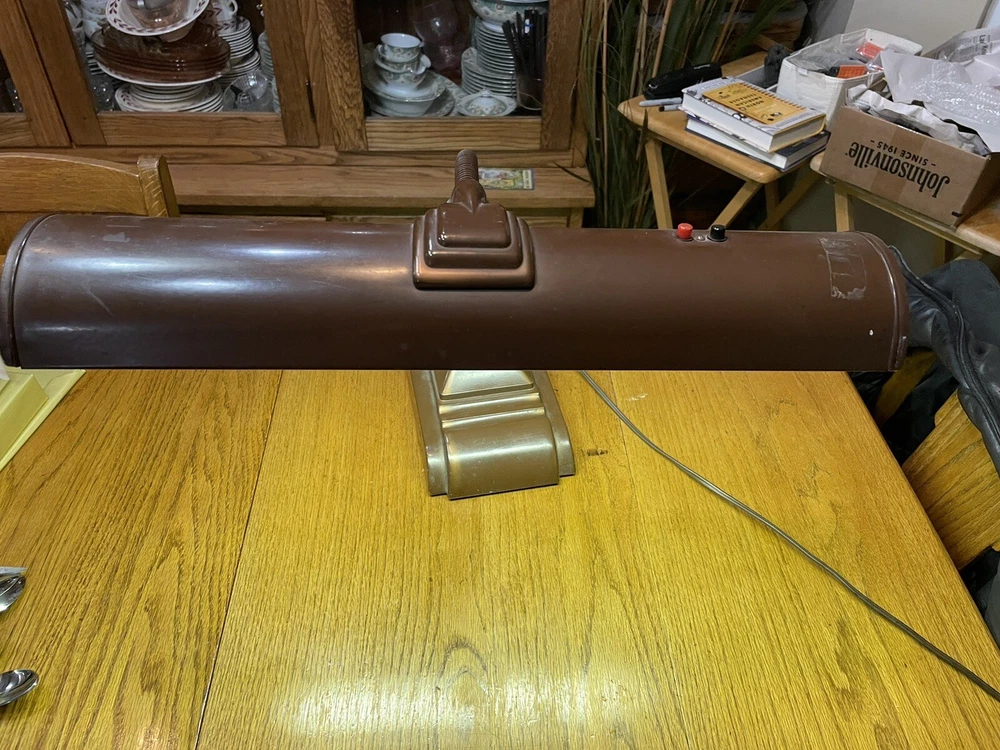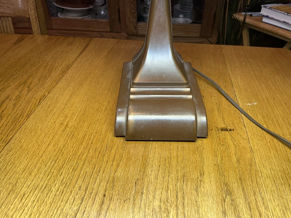 This large (18” wide and 20” high). vintage desk lamp is a stunning addition to any room. Its beautiful art deco design and banker's lamp shade shape make it a unique piece that will definitely catch the eye. The lamp has a corded power source and a switch control style, with a light sensor type. It is made of brass and metal, and the shade is a shaded fluorescent tube. This lamp is an original from the 1940s-1960s era, with a brown cord color and a beautiful antique brand. This lamp is perfect for those who love vintage items and antiques. It's a great conversation piece and adds a touch of style to any room. The lamp is in great working condition and would make a fantastic addition to any collection. The lamp does work as shown in the pictures. I will include the fluorescent bulbs however given the nature of the bulbs I can not guarantee they will work after shipping.