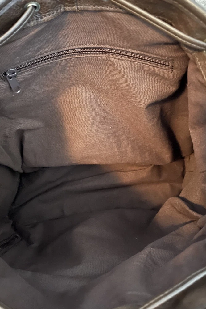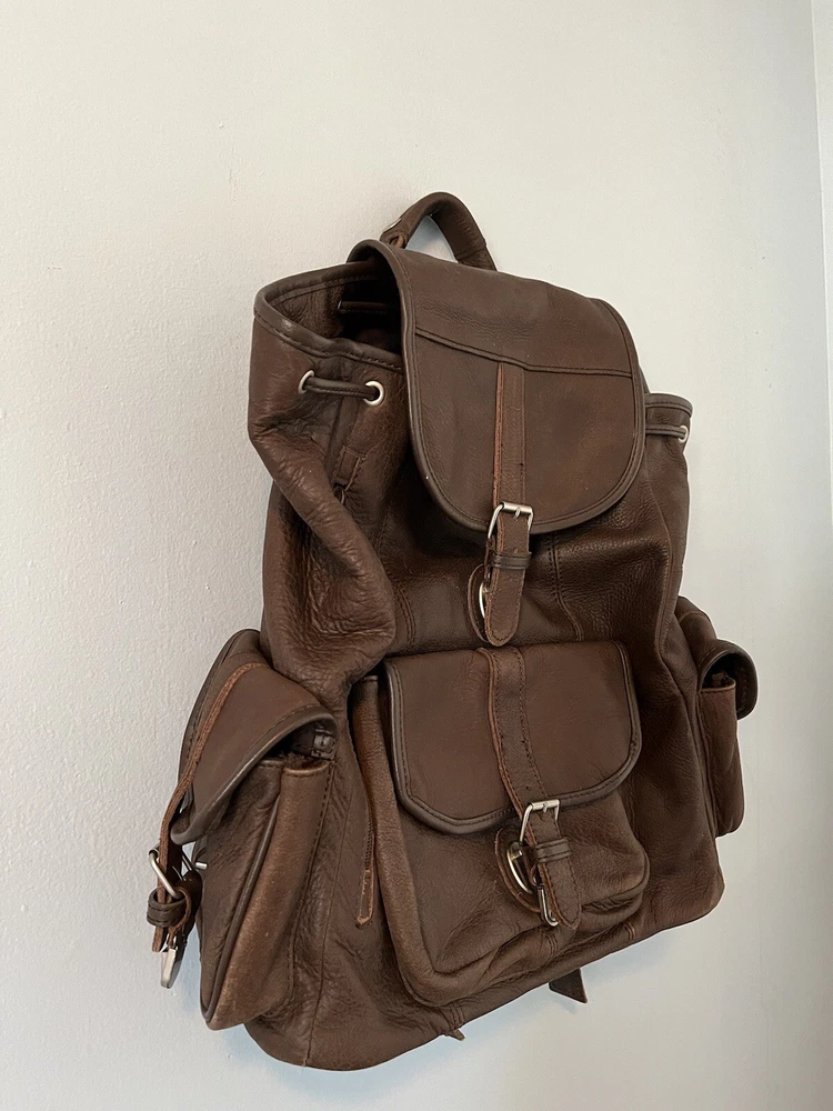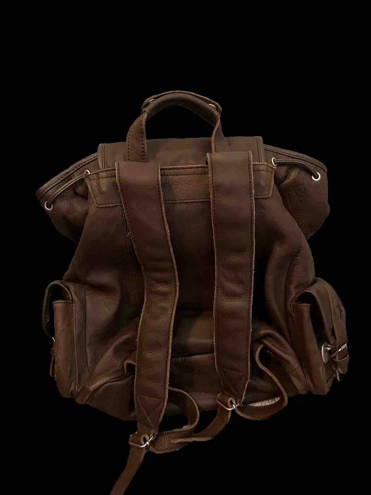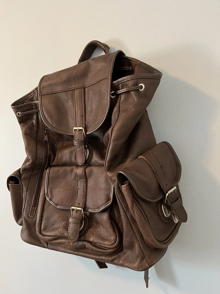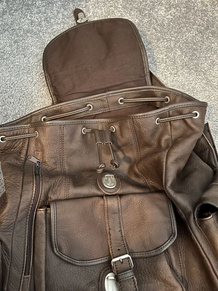 Material: Leather Department: Men Character: Leather Type: Backpacks Color: Brown Theme: Travel Closure: Drawstring Style: Backpack Vintage: Yes Fabric Type: Leather Lining Material: Leather Size: Large Brand: Unbranded Features: Drawstring Occasion: Casual Product Line: Does not apply Pattern: Solid
