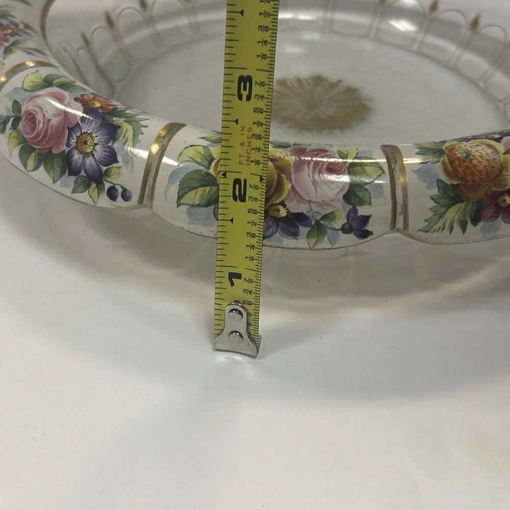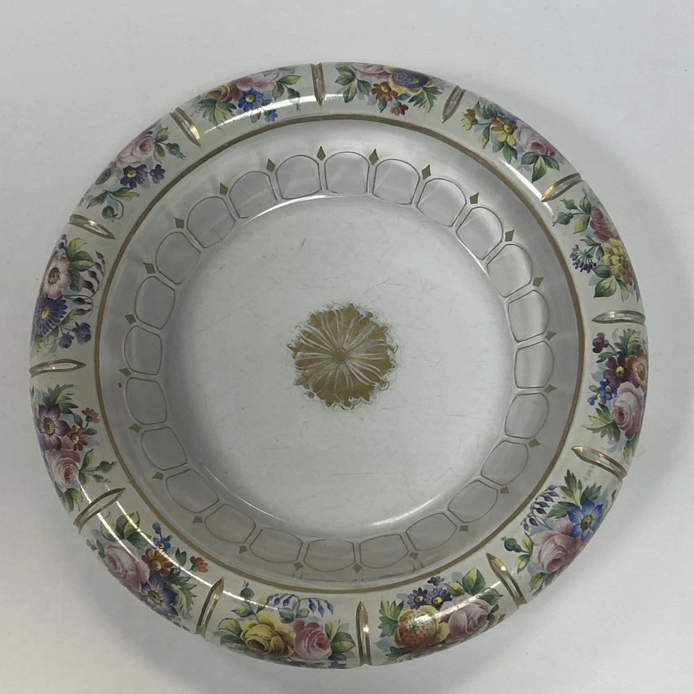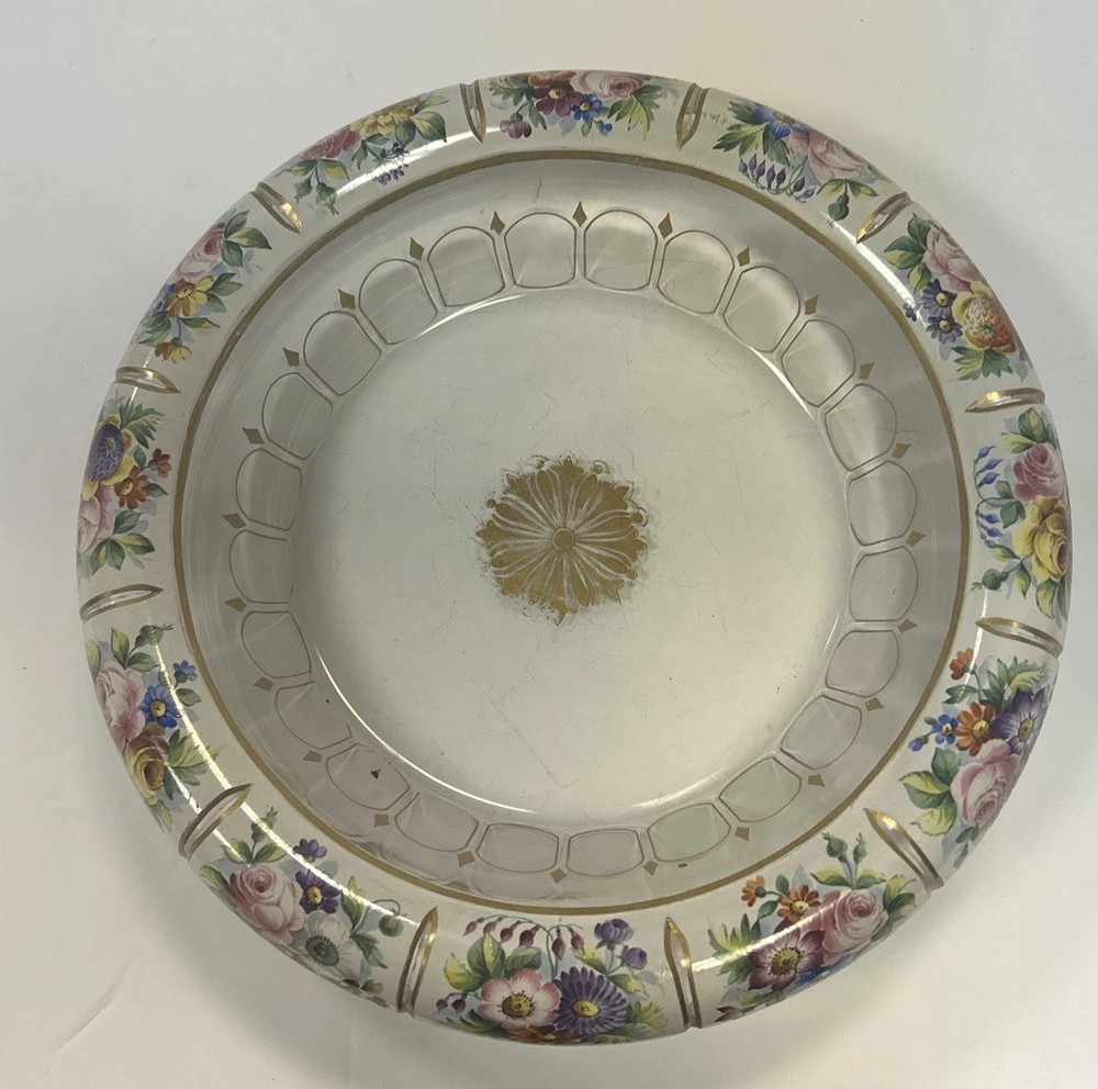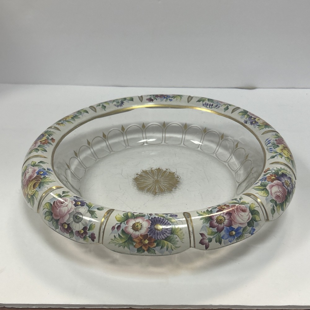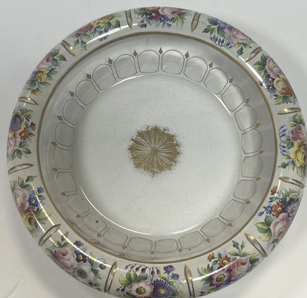 Large Vintage Glass Shallow TRINKET / jewelry DISH w/Gold Detail white Rim w/ Flowers Pink Blue yellow Approximately 9 3/4 “wide Please see photos and measurements. There is a small chip on the outside edge as shown in photos. There are scratches inside due to use. Zoom in to see. Rim edge is white with beautifully detailed flowers. Would be a great dish to store your necklaces, earrings, perfume bottles, or bathroom item. We don’t accept returns, so please take your time deciding on your purchase. For your support of this small shop!