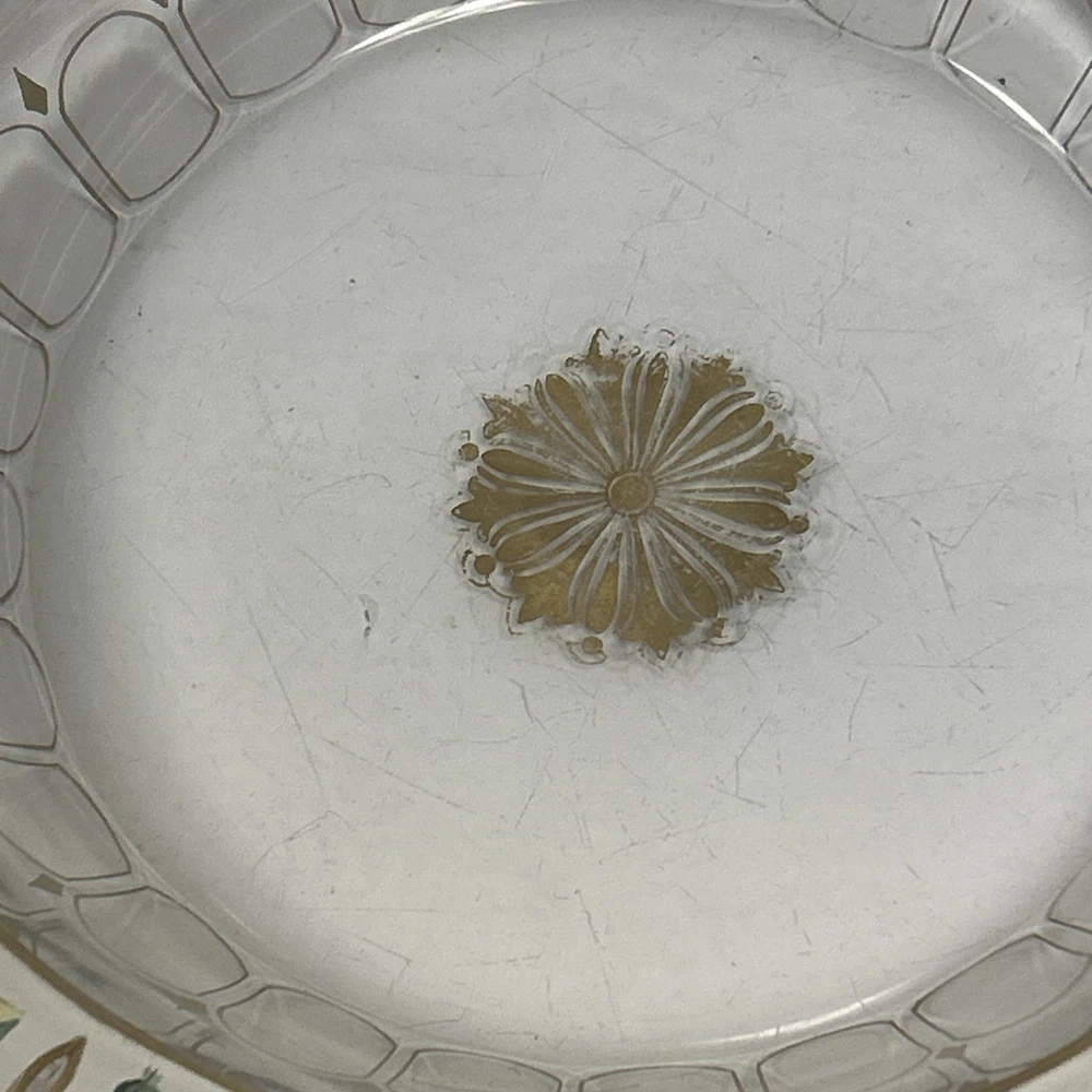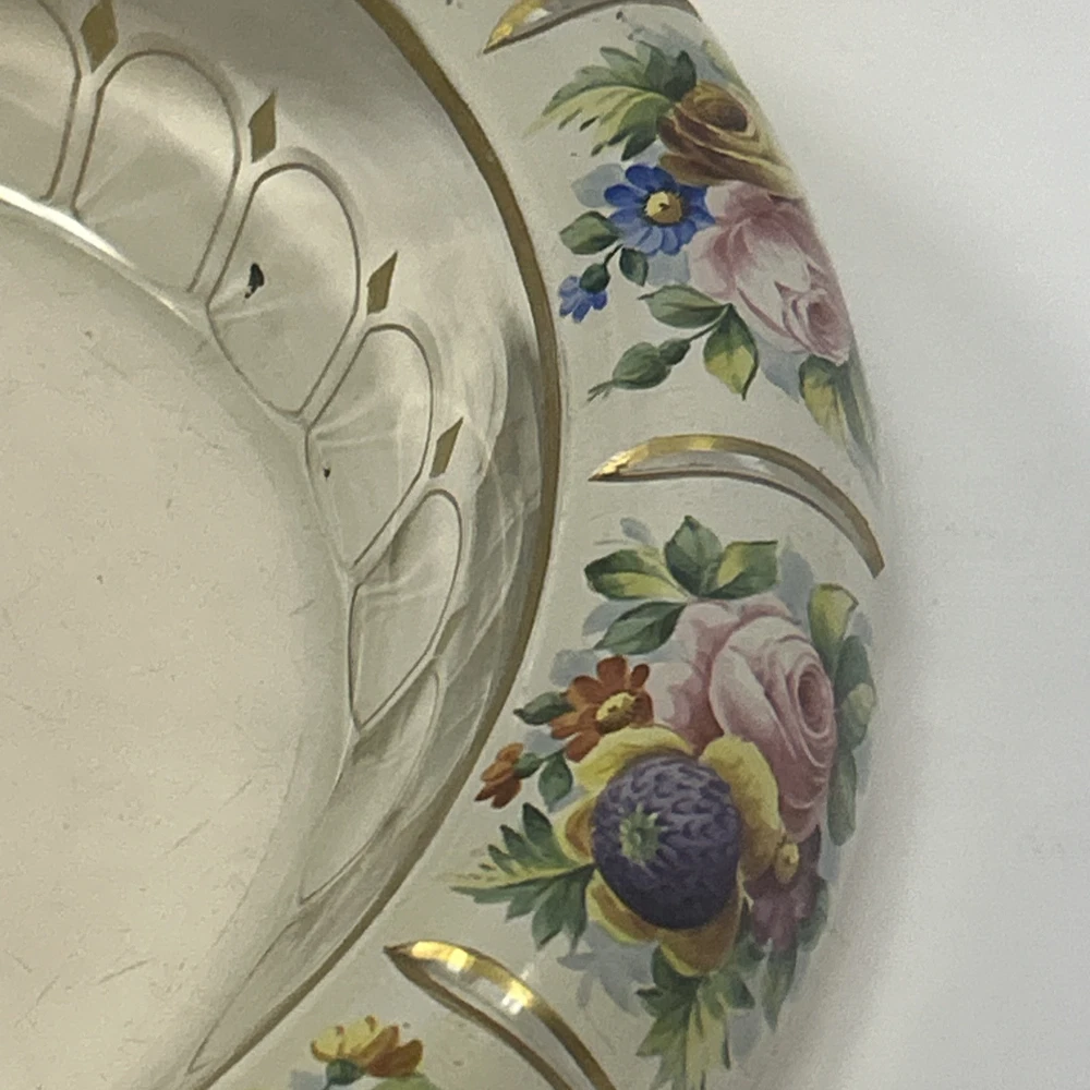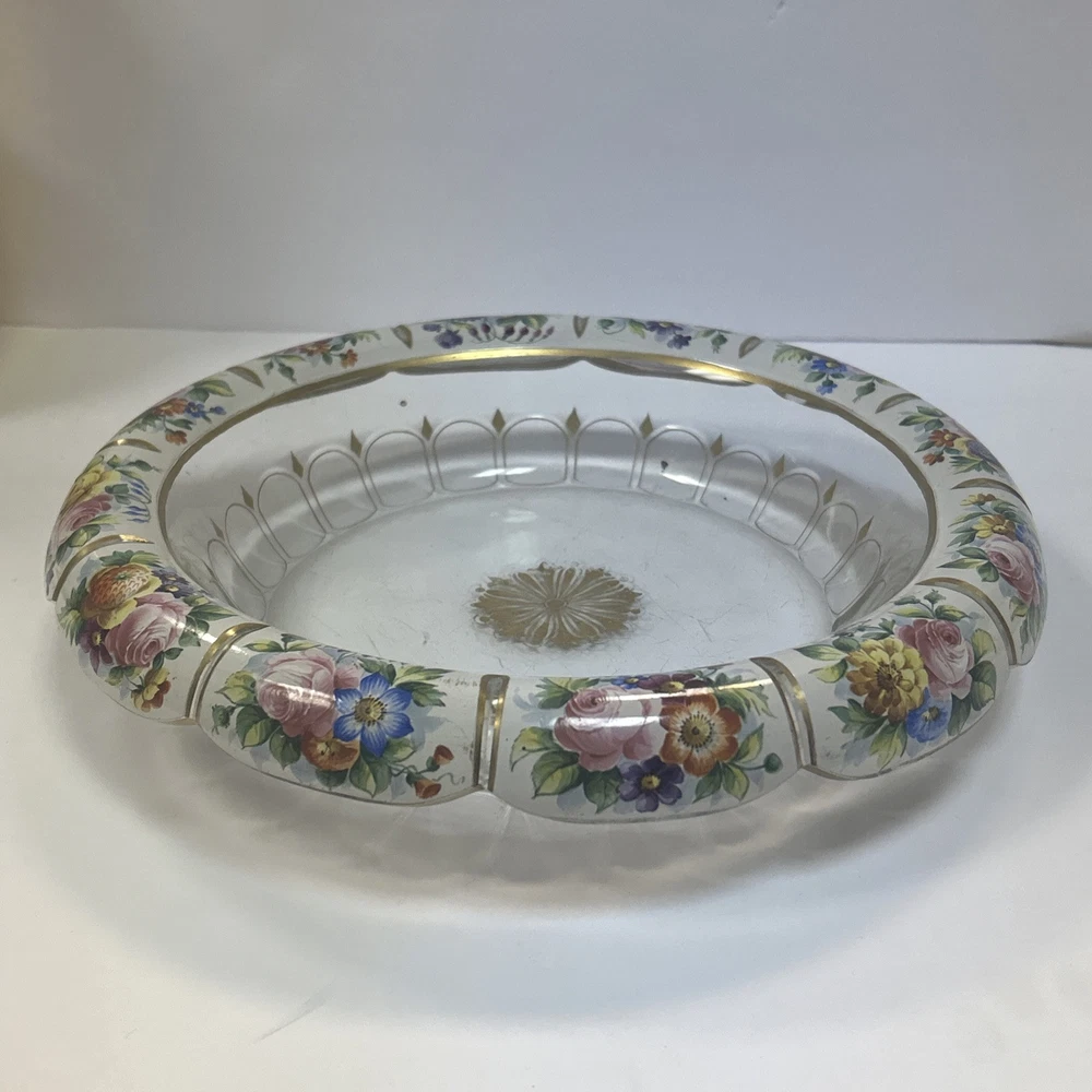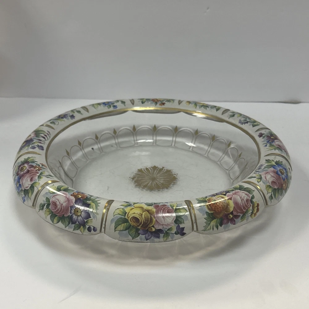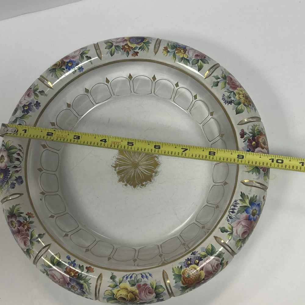 Large Vintage Glass Shallow TRINKET / jewelry DISH w/Gold Detail white Rim w/ Flowers Pink Blue yellow Approximately 9 3/4 “wide Please see photos and measurements. There is a small chip on the outside edge as shown in photos. There are scratches inside due to use. Zoom in to see. Rim edge is white with beautifully detailed flowers. Would be a great dish to store your necklaces, earrings, perfume bottles, or bathroom item. We don’t accept returns, so please take your time deciding on your purchase. For your support of this small shop!