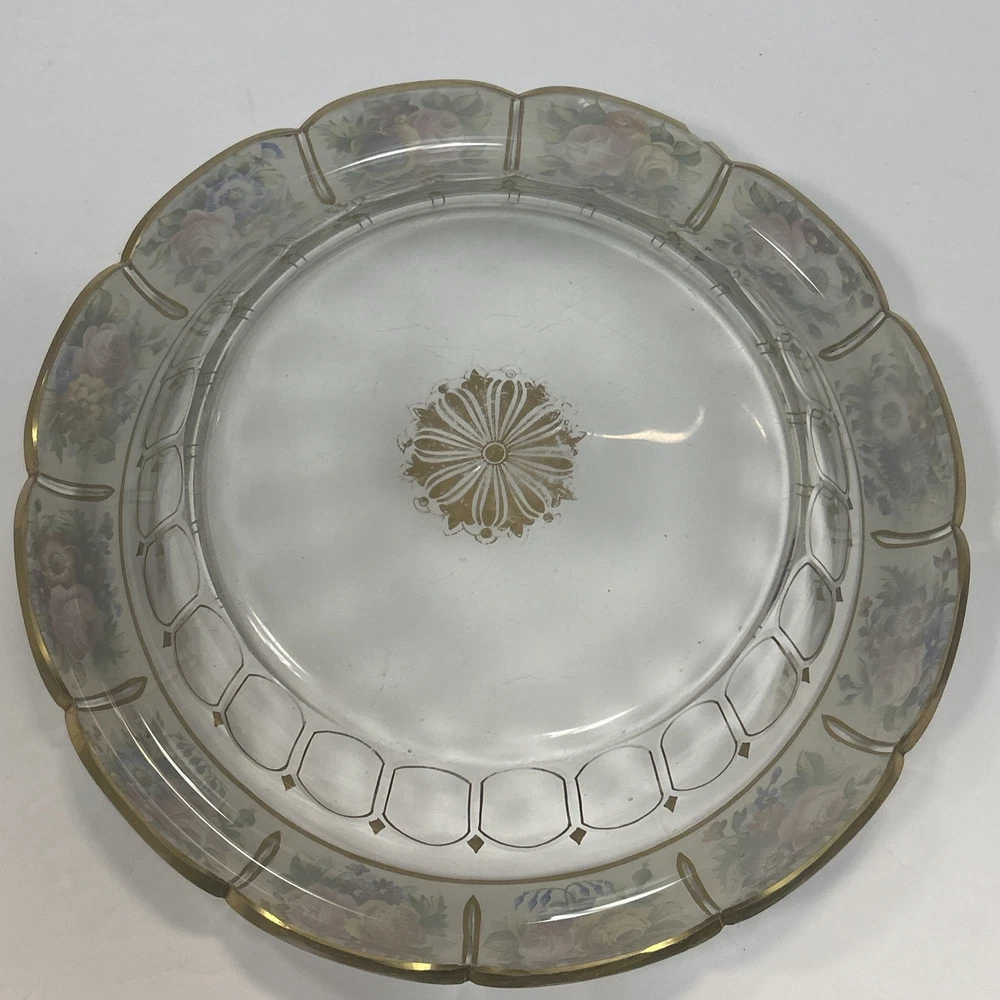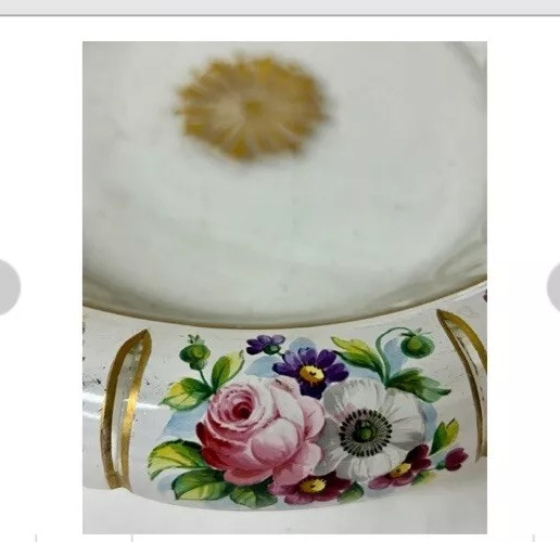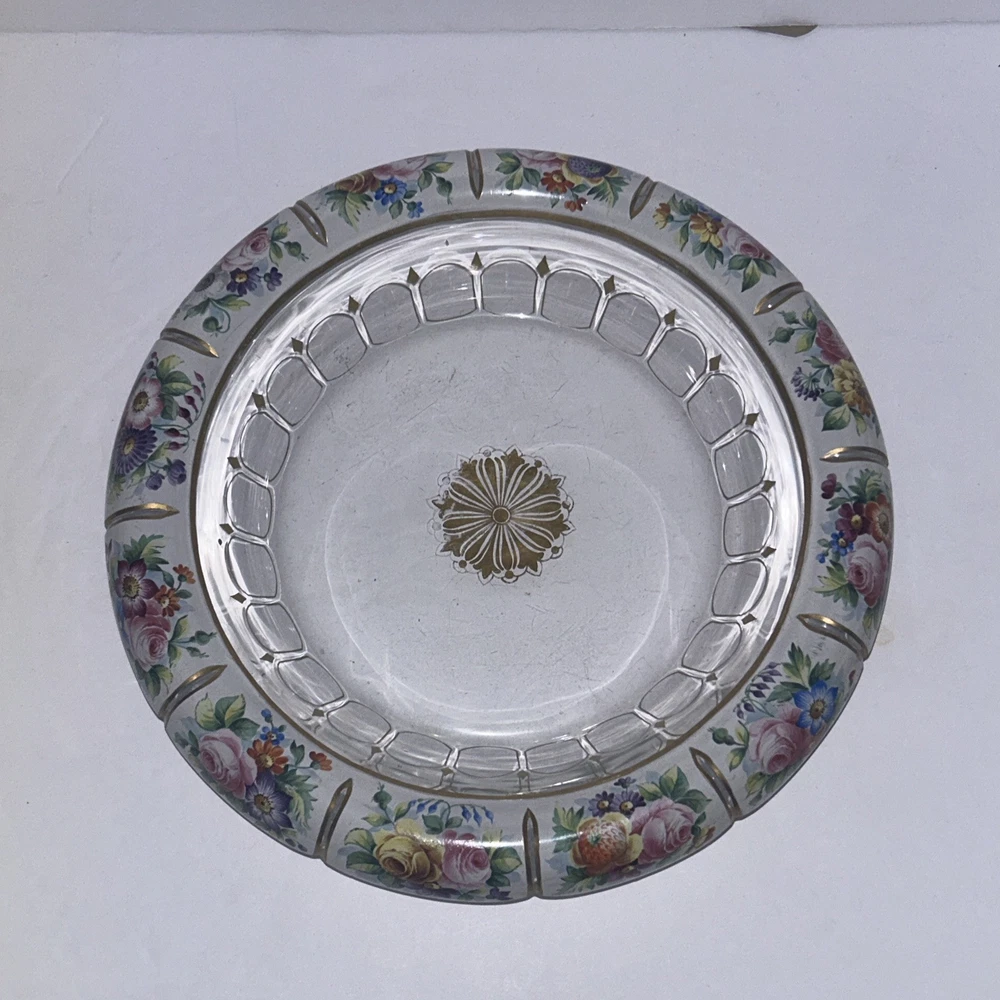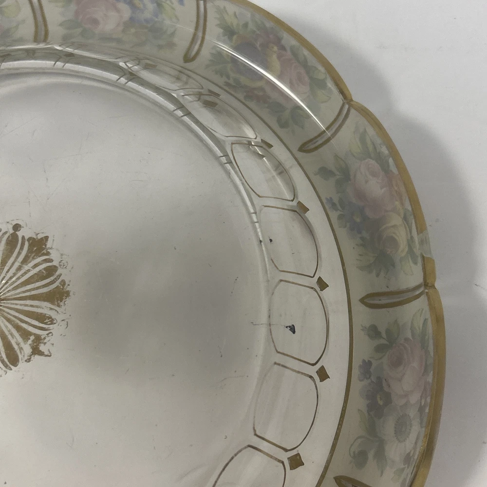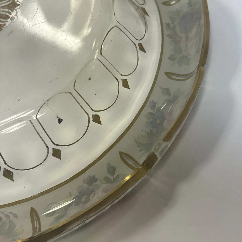 Large Vintage Glass Shallow TRINKET / jewelry DISH w/Gold Detail white Rim w/ Flowers Pink Blue yellow Approximately 9 3/4 “wide Please see photos and measurements. There is a small chip on the outside edge as shown in photos. There are scratches inside due to use. Zoom in to see. Rim edge is white with beautifully detailed flowers. Would be a great dish to store your necklaces, earrings, perfume bottles, or bathroom item. We don’t accept returns, so please take your time deciding on your purchase. For your support of this small shop!