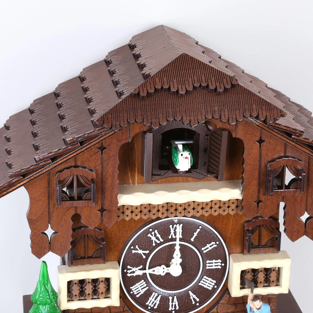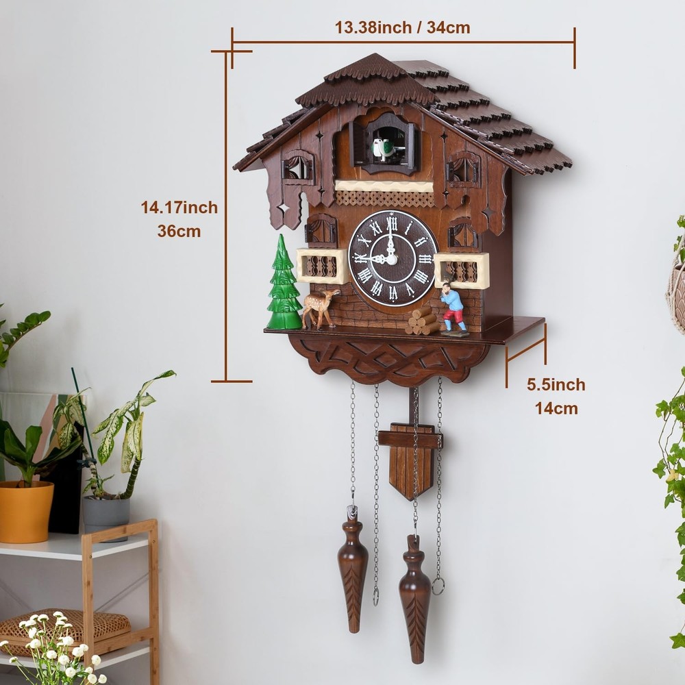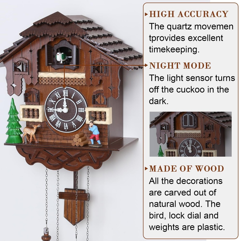 Cuckoo Clock Large Vintage Wall Clock Handcrafted Wood Cuckoo Clock House Home Decor with Singing Bird & The Man Work In Front Of The House Decoration CC23-3 Large vintage cuckoo clock made of basswood and hand engraved The birds come out and sing every hour. If you don't know how to match the time, please send us a message. Clock net size: 14.17 "H x 5.5 "W x 13.38" D Automatic nighttime shutdown of the sensor - Nighttime silencer. Adjustable volume. Powered by two D batteries (not included) 100% SATISFACTION GUARANTEE - We are so confident you will love the Cuckoo Clock that you can contact us if you have any questions. We will get back to you as soon as possible. Give it a try, we know you'll love it!Automatic nighttime shutdown of the sensor - Nighttime silencer. Adjustable volume. Powered by two D batteries (not included)