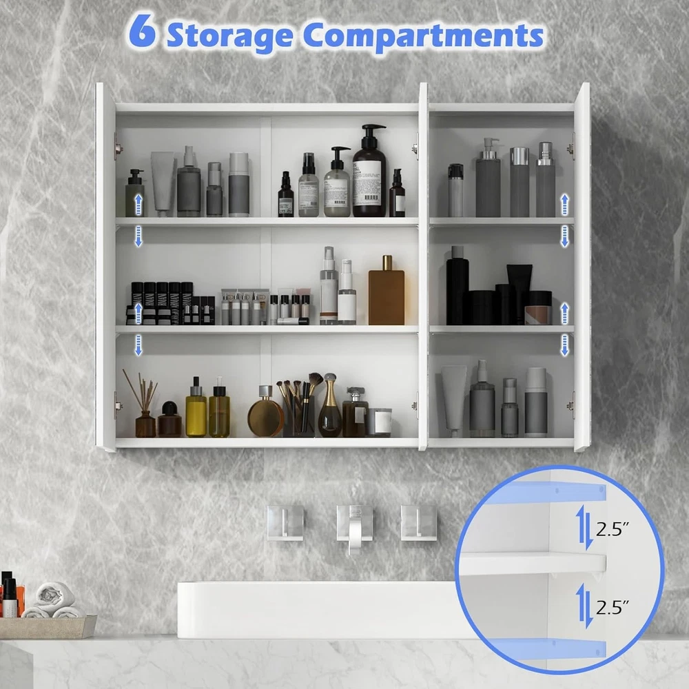 Product Description Specification Color: White Net Weight: 40lbs Shelf Adjustable Height:1" Material: MDF wood, stainless steel, glass Product Dimensions: 36” x 4.5” x 25.5” (L x W x H) Package includes: 1 x Bathroom cabinet 1 x User manual Bathroom Cabinet Wall Mounted Our Medicine Cabinet is suitable for bathroom, living room and any other rooms to store items. 3 mirrors on the cabinet look more bright and spacious, which perfectly add modern feeling to your bathroom or other space. If you are tired of organizing your items over your bathroom counter, then upgrade to this organized and durable wall-mounted storage cabinet.