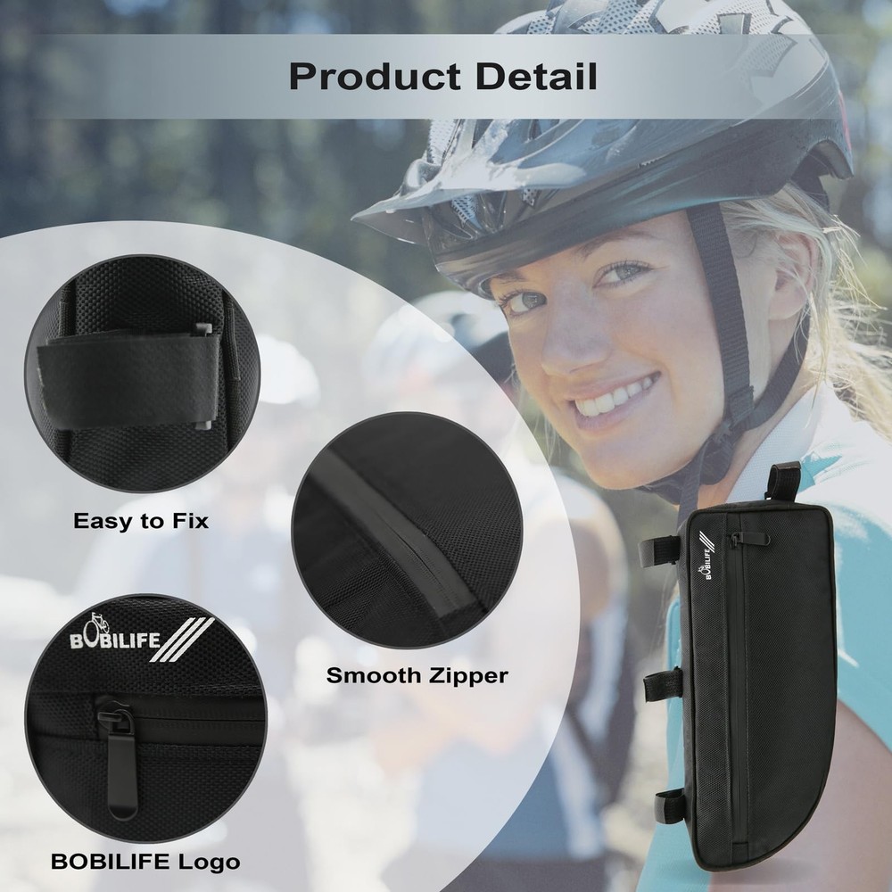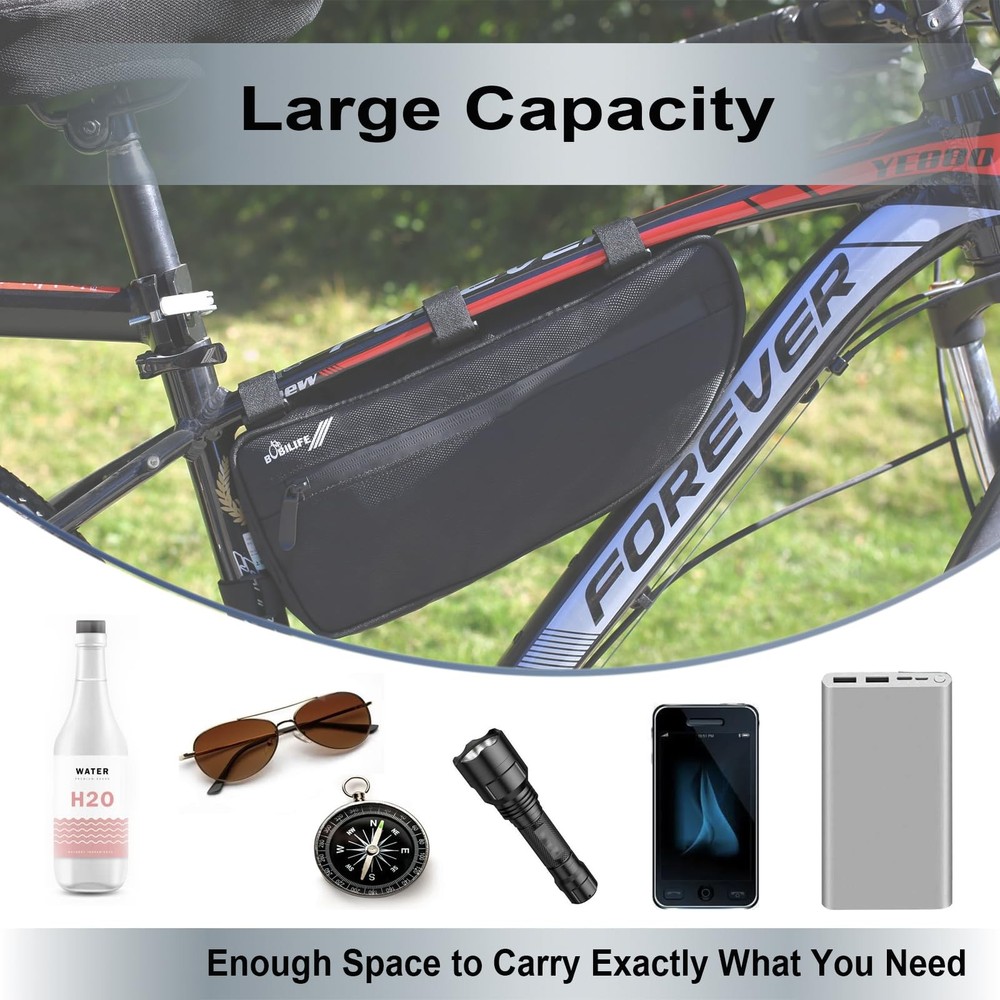 Large Bike Frame Bag - Waterproof Bicycle Triangle Frame Bag Under Top Tube Pouch Storage Bag for Adult Cycling Road Mountain Bikes LARGE CAPACITY: The size is 13.8 " L x 5.9 " H x 2.2 " W . This bike triangle frame bag has 4L large capacity, perfet for holding cycling essentials, such as snacks, wallet, cell phone, keys, eyeglasses, repair kits, mini pump, gloves and etc. STURDY & CONVENIENT: The metallic frame make the cycling storage frame bag retain its shape to keep the bag very steady. No need to worry about deformation and protect your items from squeezing. The different directions mounting straps make the bag fixed on the bike firmly. WATERPROOF BAG & ZIPPER: The bicycle frame bag is made of high quality oxford nylon material outer and TPU material inner offer a comprehensive protection for your cycling accessories inside, Unique waterproof glue zippers in double sides will keep your belongings dry in rainy days. SAFE & HUMANIZATION: This cycling bag width is only 2.20inch , it would not rubs against your legs while riding. And the double sided reflective logo provide night riding warning for enjoying a safe journey. And the two side zipper pockets are easy to access our items. EASY MOUNT& RELEASE: This bike triangle frame storage pouch with 4 mounting straps for installing under the top tube, stay in place and won’t move even on the rough roads, the slim body allows this bag to hide under the frame without worrying about interfering with pedaling.