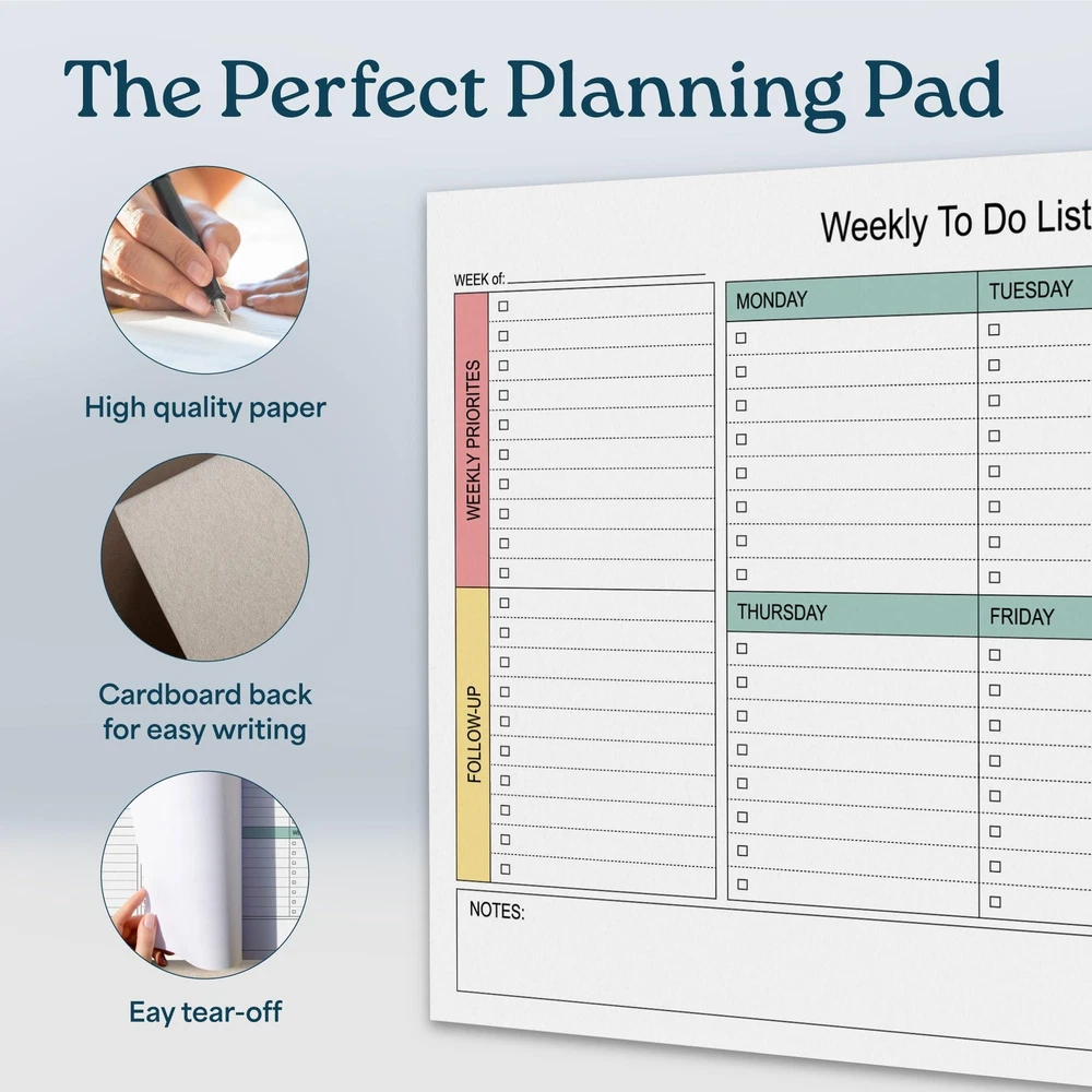 Large Weekly Planning Pad and Matching Notepad, 52 Letter Size Tear-Off Sheets, 8.5” x 11” Undated Weekly Desk Planner Pad, Daily Schedule, Weekly Priorities To Do List,for Work and Home INCREASE YOUR PRODUCTIVITY. Weekly planner with matching notepad . This undated weekly planner pad with 54 tear-off sheets will have you more focused and productive than ever. A perfect size for a desk planner, the weekly notepad is 8.5 x 11 inches, providing plenty of room to track, organize and manage your schedule and weekly tasks. Matching 54 sheet notepad. STAY ORGANIZED AND ON TASK - No more missed deadlines, appointments or forgotten tasks! Keep track of everything with space for a daily schedule, tasks and to-do lists that you can check off as you go. Great for home, work, teachers, students and anyone who wants to be more organized and productive. FLEXIBILTY AND FREEDOM - Embrace the freedom of an undated weekly planner with 54 weeks of undated planning pages. Start, stop and restart anytime! No more wasted spaces or skipped dates. This versatile planner allows you to stay organized in 2024, 2025, 2026 and beyond. HIGH QUALITY MATERIALS AND CONSTRUCTION. Weekly planner and matching notepad are made of 100 GSM smooth & acid-free paper for a smooth writing experience without bleeding. Thick cardboard backing ensures that you can write on the go. High quality glue binding keeps pages securely attached to planner and notepad until you are ready to tear off. PROFESSIONAL DESIGN. Minimalist design to maximize the space for writing down schedules, appointments, tasks, meeting or class notes, reminders and to do lists. INCREASE YOUR PRODUCTIVITY. Weekly planner with matching notepad . This undated weekly planner pad with 54 tear-off sheets will have you more focused and productive than ever. A perfect size for a desk planner, the weekly notepad is 8.5 x 11 inches, providing plenty of room to track, organize and manage your schedule and weekly tasks. Matching 54 sheet notepad. STAY ORGANIZED AND ON TASK - No more missed deadlines, appointments or forgotten tasks! Keep track of everything with space for a daily schedule, tasks and to-do lists that you can check off as you go. Great for home, work, teachers, students and anyone who wants to be more organized and productive. FLEXIBILTY AND FREEDOM - Embrace the freedom of an undated weekly planner with 54 weeks of undated planning pages. Start, stop and restart anytime! No more wasted spaces or skipped dates. This versatile planner allows you to stay organized in 2024, 2025, 2026 and beyond. HIGH QUALITY MATERIALS AND CONSTRUCTION. Weekly planner and matching notepad are made of 100 GSM smooth & acid-free paper for a smooth writing experience without bleeding. Thick cardboard backing ensures that you can write on the go. High quality glue binding keeps pages securely attached to planner and notepad until you are ready to tear off. PROFESSIONAL DESIGN. Minimalist design to maximize the space for writing down schedules, appointments, tasks, meeting or class notes, reminders and to do lists. Shipping from the USA All of our products are shipped from the USA, ensuring quick delivery to your destination. Payment We offer the following payment methods: PayPal, credit card, bank transfer, and eBay's secure payment system. Free Shipping & Free Returns Shipping within the USA is FREE. Additionally, any return is absolutely free for you. Risk-Free Purchase You have the option to return an item within 30 days without any justification. We cover the return shipping costs! Fast Shipping We ship immediately upon receipt of payment. Generally, the package is delivered within 2-3 days in the USA. If it takes longer, we will contact you. Quality and Costs Made in Europe, USA, China No customs fees or additional charges Total satisfaction guarantee Invoice with declared VAT available upon request in .pdf format Feedback Your feedback is very important to us. After you pay for your purchase, you will automatically receive positive feedback from us.