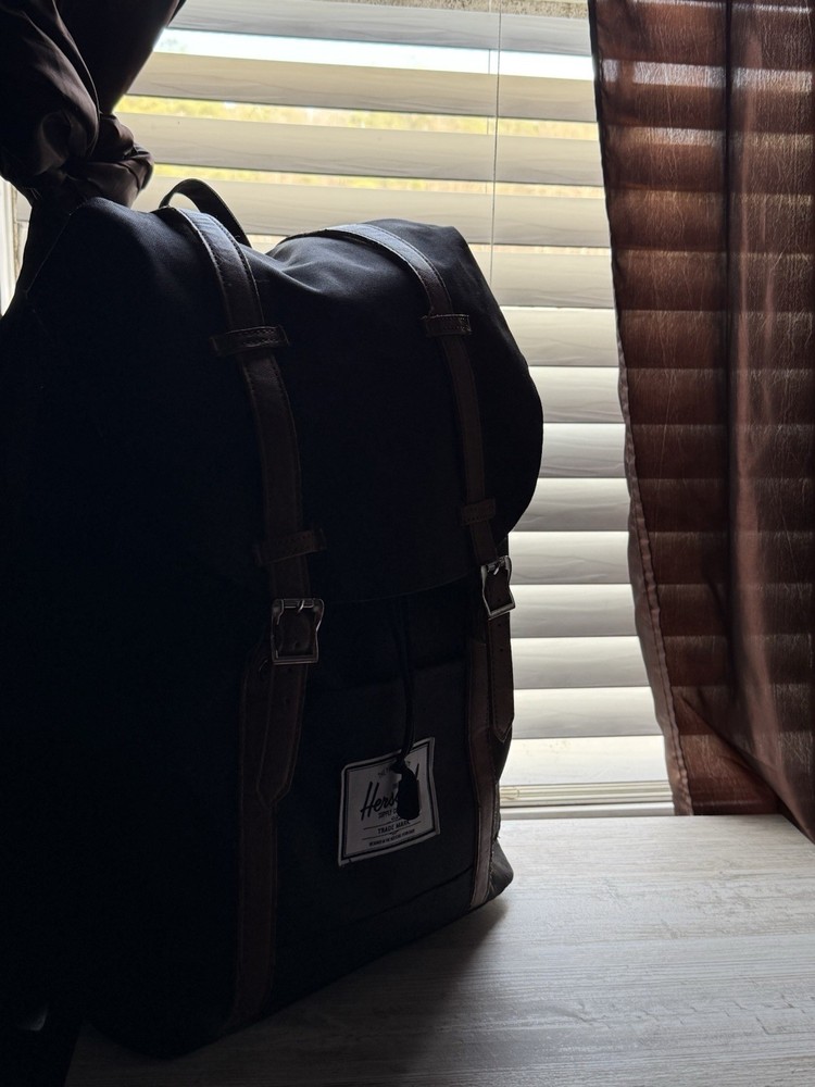 This large Herschel backpack in blue and brown is perfect for travel or casual occasions, with a solid pattern and zip closure. Made of durable polyester with a canvas fabric type, it features a comfortable shoulder strap handle style and adjustable strap for added convenience. The classic Herschel brand and accents such as buttons add a touch of style, making it a great choice for school or everyday use.