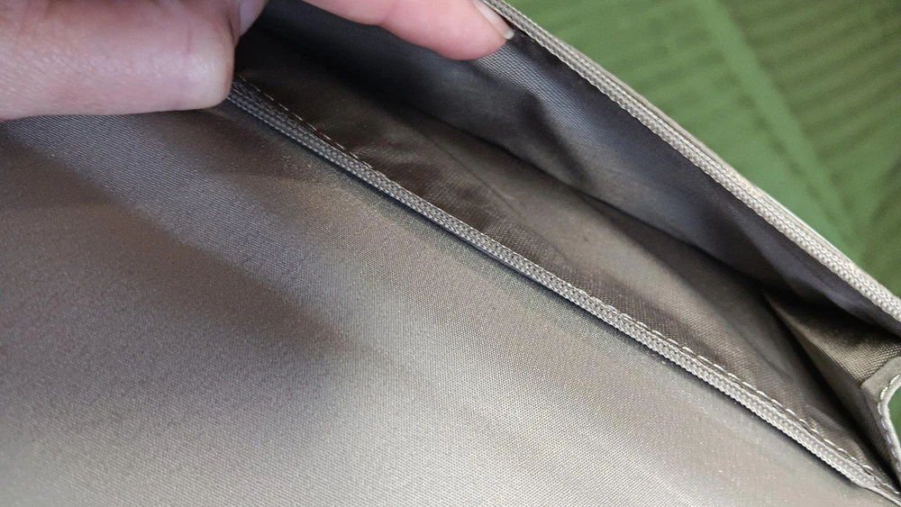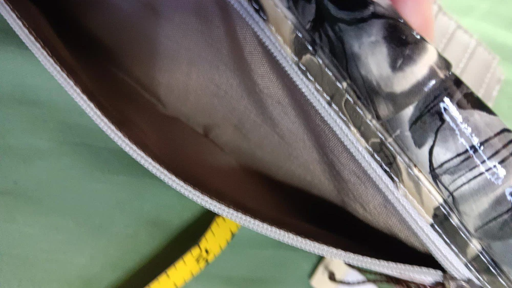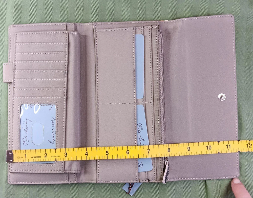 Patent leather Black and white floral design There are sections for your cards, pics, checkbook, and change. The change compartment is zipper The tri-fold is a snap button Only flaw is some yellow tinge on the exterior back and a little on the front. Hardware is hold tone