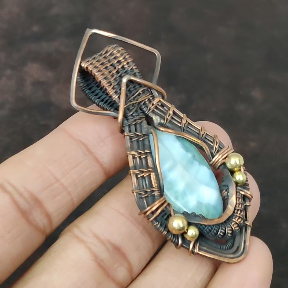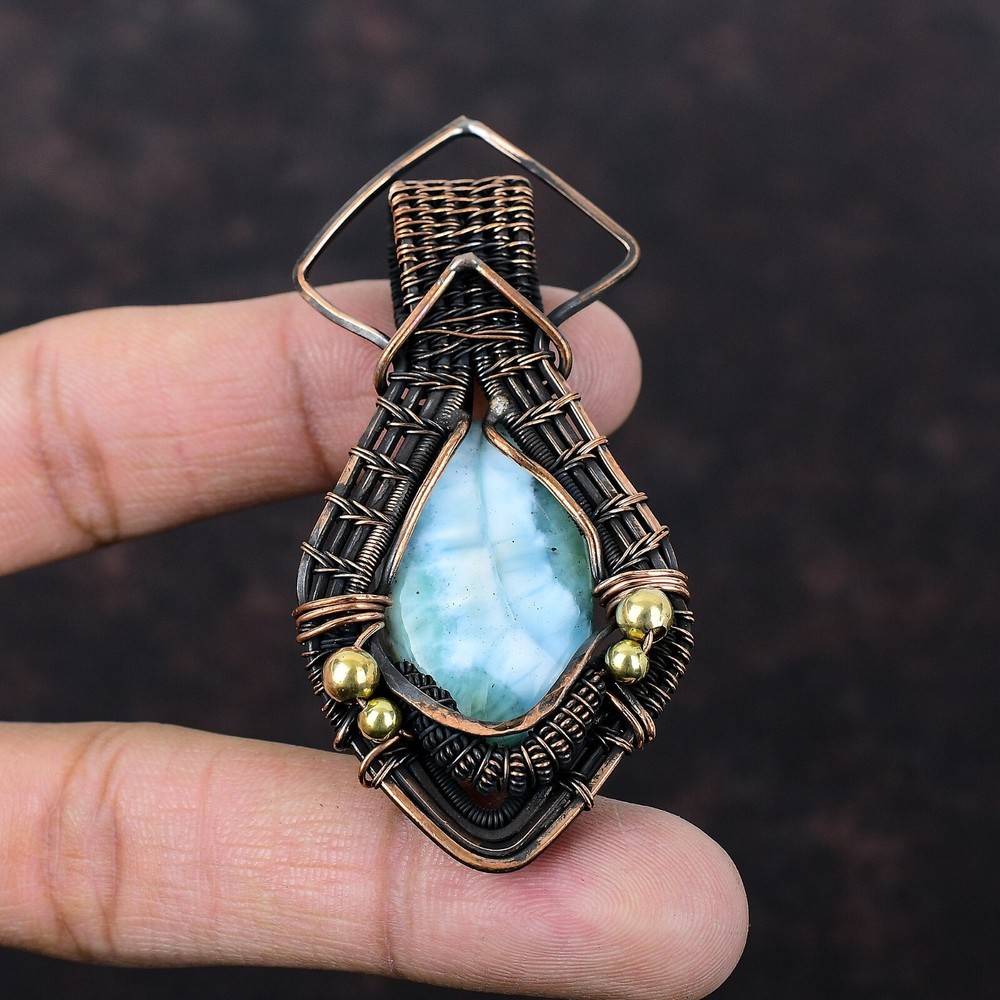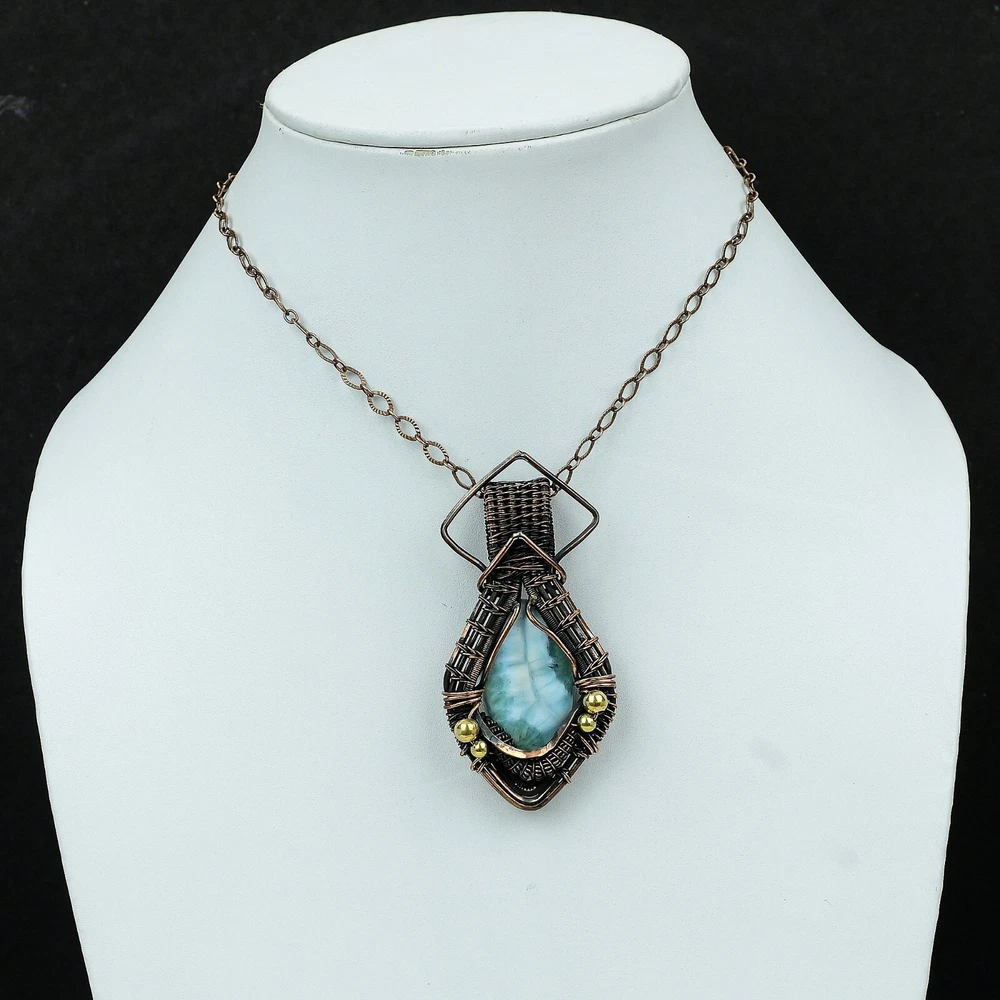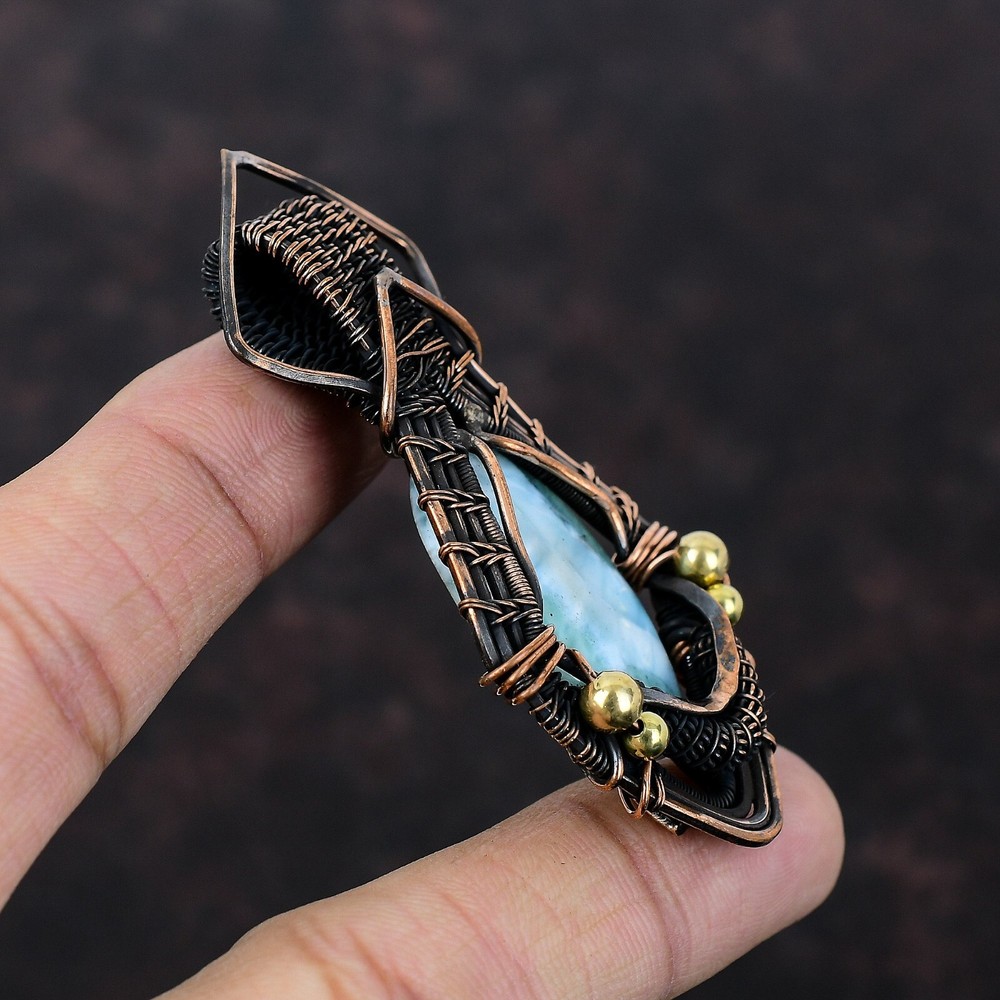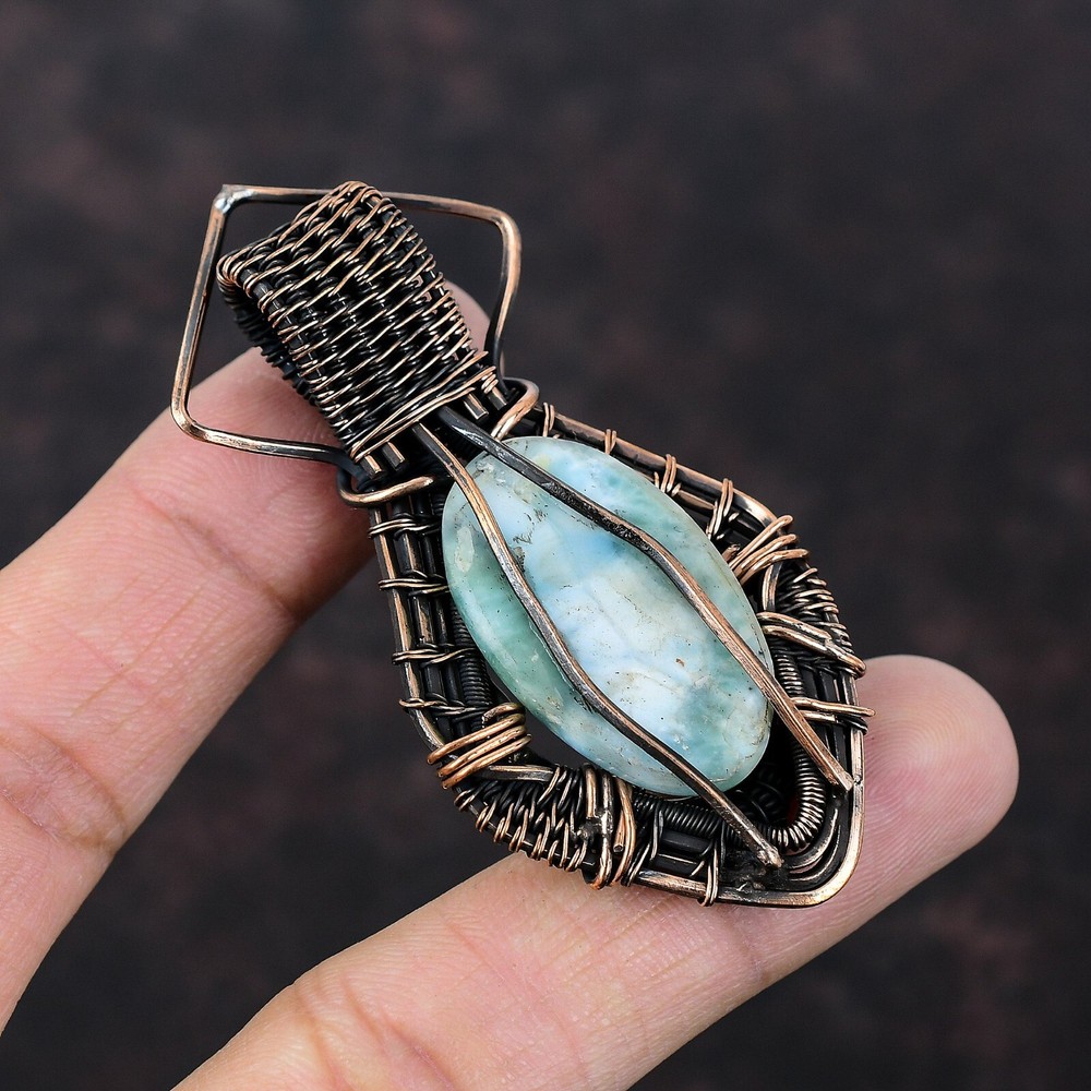 Note : Due to the natural formation of this gemstone. Slight variation in design and color are to be expected. Welcome to Silver Creation Mothers day Sale Larimar Gemstone Copper Wife Wire Wrapped New Wedding Pendant Handmade Pendant, Wire Wrapped Pendant, Wire Wrapped Jewelry, Copper Pendant, Copper Wire Pendant, Wrapped Jewelry, Wire Wrap Pendant, Wire Wrap Jewelry SKU : VFWP-1789 Stone Shape : Oval Metal Purity : Unknown Copper Length : 73 Millimeters Width : 35 Millimeters Copper has been used for jewelry making for thousands of years, dating back to ancient civilizations such as the Egyptians, Romans, and Aztecs. Copper was valued for its beauty, versatility, and durability, and was often used to make everything from jewelry and coins to cookware and tools. In addition to its historical significance, copper jewelry also offers several benefits. Copper is a natural conductor of heat and electricity, which makes it ideal for energy healing and therapeutic purposes. Wearing copper jewelry is believed to have various health benefits, such as improving circulation, reducing inflammation, and boosting the immune system. Some people also believe that copper jewelry has the ability to balance energy and improve mood. For Mother's Day Gift For Father's Day Gift For Promise For Valentine' Day For Halloween Party For Christmas Day Gift For New Year Party For Mom For Her If you can't find the information you need or need some advice for your design? Feel free to contact us. We are fast to reply :) All our work is made by hand with Love and Care in our workshop Thank you so much for visiting and hope you enjoy shopping with us Silvercreations is committed to delivering the best quality sterling silver jewelry to customers. As a handmade jewelry manufacturer, we offer an extensive selection of copper gemstone jewelry that showcases the brilliance of our craftsmanship. We are an experienced handmade jewelry supplier with expertise in embellishing gemstones to suit every style. We offer you the liberty to create your jewelry ensemble with sparkling, earthy, and pure gemstones. Our Talented artisans masterfully handcraft each piece of jewelry you see here. Our pieces are made with genuine gemstones.