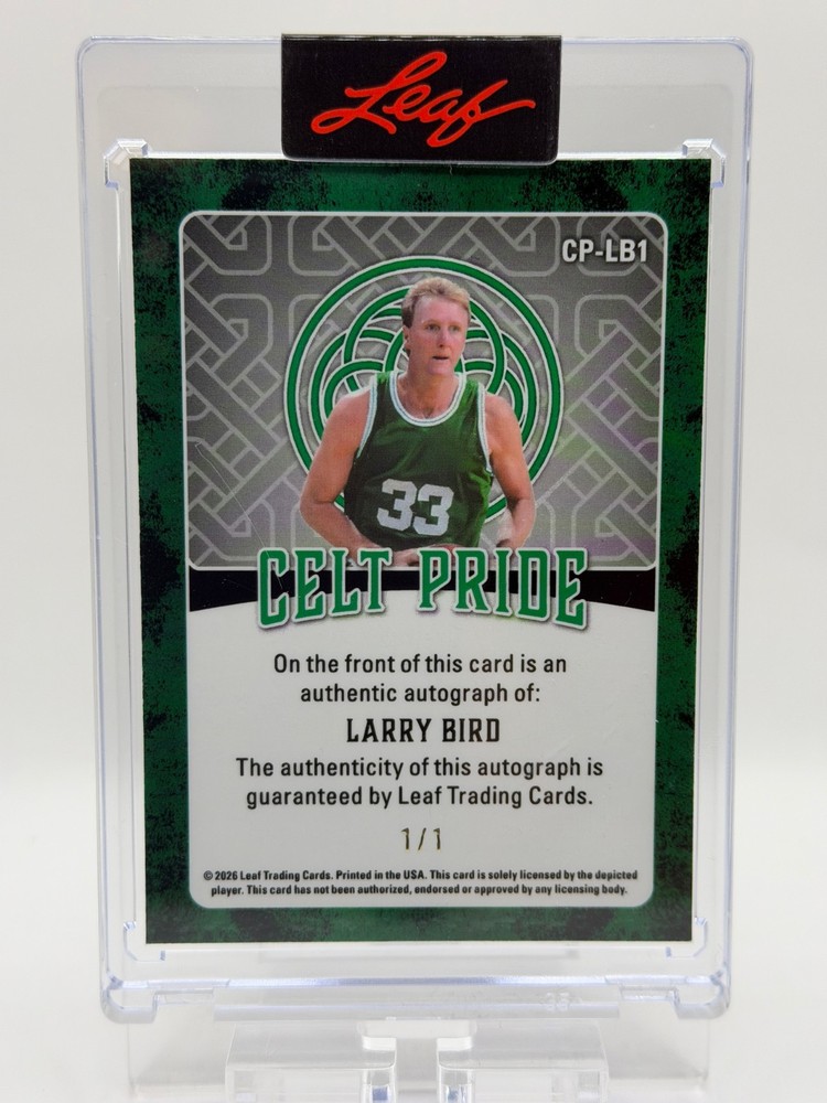 Parallel/Variety:Gold VinylSet:2026 LeafMaterial:MetalCountry of Origin:United StatesSport:BasketballSigned By:Larry BirdManufacturer:LeafTeam:Boston CelticsEvent/Tournament:NBA FinalsType:Sports Trading CardFeatures:Chase, One of One, Parallel/Variety, Serial Numbered, AutographCard Number:CP-LB1Card Name:Celt PrideCard Size:StandardLanguage:EnglishAutographed:YesPrint Run:1Original/Licensed Reprint:OriginalYear Manufactured:2026Autograph Authentication:LeafSeason:2026Vintage:NoLeague:National Basketball Association (NBA)Player/Athlete:Larry BirdCard Condition:Near Mint or Better