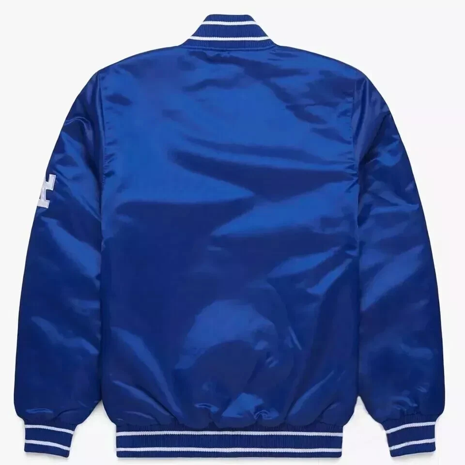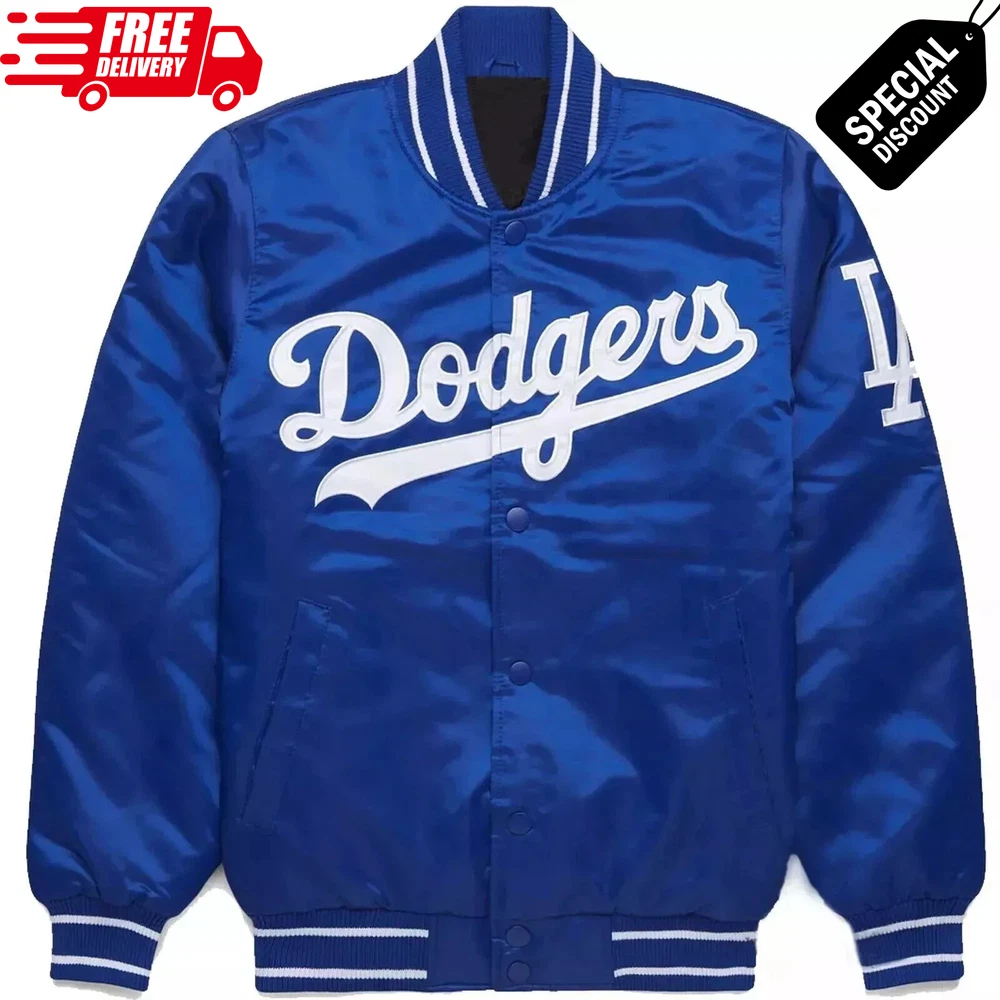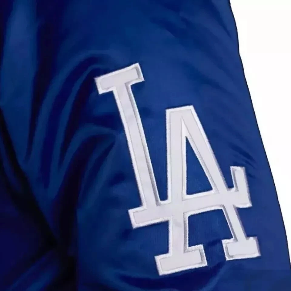 Las Angeles Dodgers MLB Blue Satin Baseball Jacket Bomber Athletic Streetwear This vintage-style MLB varsity jacket showcases classic elegance with detailed embroidered logos. Exterior : Made from high-quality satin fabric Interior : Features 100g quilting and a satin-blend lining for warmth and comfort Front Closure : Coordinated full-snap buttons Pockets : Two exterior pockets and one interior pocket designed for your phone Ribbing : Premium polyester rib-knit collar, cuffs, and waistband