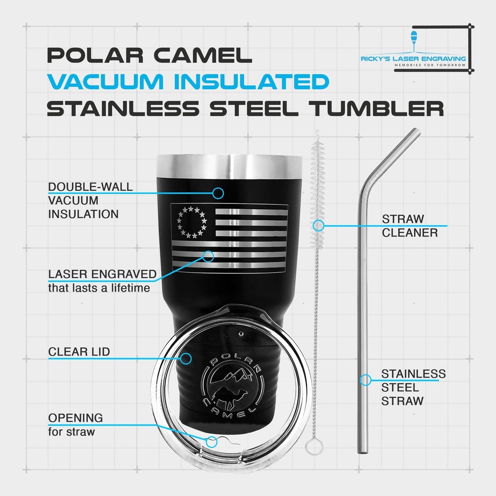 Polar Camel 30 oz Tumbler with Stainless Steel Straw and Straw Cleaner ENGRAVED IN THE USA FOR LASTING PRIDE: Our 30 oz. stainless steel water tumbler made in USA features precision laser engraving of the Betsy Ross 1776 flag that won’t fade or peel over time. Unlike screen printing or stickers, this design remains sharp and clean, creating a standout look for your patriotic gifts for men unique. Enjoy a durable and stylish Betsy Ross 1776 flag tumbler for men that showcases your love. DOUBLE-WALL VACUUM INSULATION KEEPS DRINKS HOT OR COLD: This dad tumbler maintains hot drinks for up to 12 hours and cold beverages for 24 hours. Whether you need a Betsy Ross 1776 flag gifts for men or a reliable cup for work, this tumbler provides superior temperature control. Perfect for early morning coffee or ice-cold drinks on hot days, it's the ideal water bottle for dad who’s always on the go. INCLUDES LID AND STAINLESS STEEL STRAW FOR EASY SIPPING: Each daddy tumbler comes with a clear lid and a large opening, making it easy to use with the included stainless steel water tumbler made in USA. The set also includes a straw cleaning brush for convenience. Whether you’re gifting tumblers for dad or looking for a stylish travel cup, this tumbler ensures a hassle-free drinking experience. DESIGNED FOR DURABILITY WITH A SWEAT-FREE FINISH: Made from 18/8 gauge stainless steel, this Betsy Ross 1776 flag tumbler for men resists dents and scratches while keeping hands dry thanks to its sweat-free design. It’s an excellent choice for patriotic gifts for men unique, ensuring long-lasting performance at home, work, or on outdoor adventures. A great addition to any dad tumblers collection. FITS MOST CUP HOLDERS WITH SECURE GRIP DESIGN: The polar camel 30 oz. stainless steel tumbler features a tapered bottom to fit standard cup holders, making it an excellent water bottle for dad. The ringneck design provides extra grip, even when wearing gloves. Whether for Betsy Ross 1776 gifts for men or everyday use, this high-quality tumbler is built for convenience and comfort.