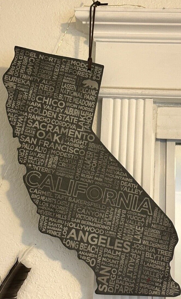 Heavy 2.5lb laser etched black slate cutout silhouette of the state of California with major cities engraved as the design. Can be use as a decorative wall art. Seeing similar items for sale as a cheeseboard or serving tray. Fun item for new Californian or a California native. Or unique cheeseboard collector. Measures about 13” long.