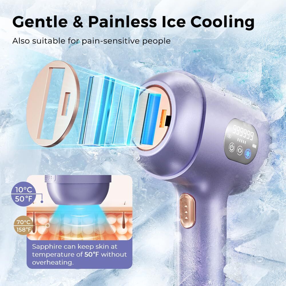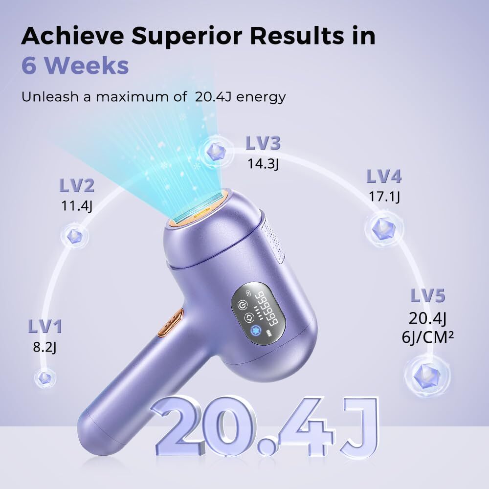 FLEXIBLE CORDLESS USE: Say goodbye to annoying power cords during epilation! cordless IPL hair removal device offers you unparalleled freedom! Ergonomics design, comfortable to hold, easy to use and control. The ipl laser hair removal device is equipped with a powerful 2600mAh battery, which can perform full-body permanent hair removal without wiring, enjoy a convenient and flexible hair removal anytime, anywhere FAST & EFFECTIVE LONG-LASTING RESULTS: Visible hair reduction in 3 weeks. Discover the power of our high-energy 20.4J long wave technology for effective and salon-level permanent IPL hair removal in 6 weeks. With an impressive unlimited 999,999 flashes, meet your entire family's hair removal needs without cartridge replacements. Long press the power button to freely switch between continuous flash mode and manual mode, saving your time and removing hair efficiently ICE-COOLING & PAINLESS: IPL laser hair removal device with advanced sapphire cooling system, cooling the skin at 10°C (50°F) during the entire hair removal process, no need or ice packs, get a true painless and comfortable hair removal without redness. Even the most sensitive body parts can get safe and effective hair removal SAFE & DURABLE: This at home laser hair remover is equipped with dual-air channel alloy, which can dissipate heat efficiently, make it safe to use and prolong the service life of the device. Designed with eye-safe settings, the hair remover emits pulsed light only when the light window is in full with your skin. Please note, this IPL hair removal device cannot remove hair from tattooed areas; avoid using it on tattoos LET'S DO HAIR REMOVAL IN WINTER: It doesn’t matter if you miss the summer. Hair removal is more suitable in winter. You don’t need to use sun protection. After hair removal, the skin will recover faster and the effect will be more significant, help you get smooth skin before summer arrives ! Tips: Count on us for top-notch . We take full responsibility for any defective and are here to address your questions or concerns