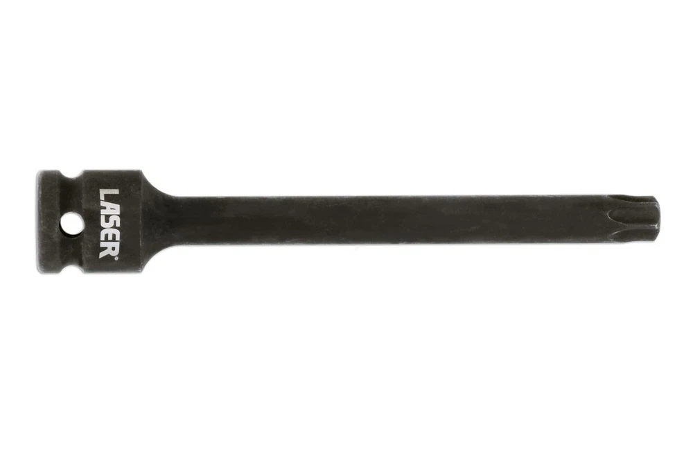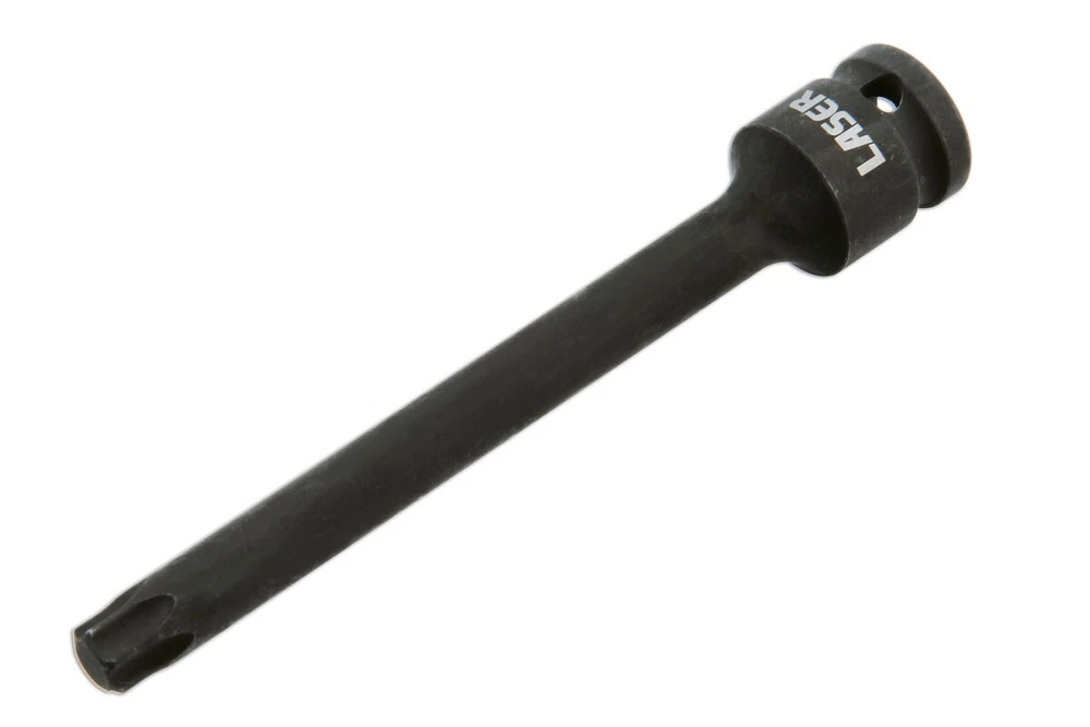 Laser Tools 9148 Extra Long Impact Star Bit Socket 1/2"D T50 Features and Benefits: A long series impact quality, T50 Star* 1/2"D bit socket for use on Ford Transit wheel bearing retaining bolts. It features a one-piece construction and manufactured from chrome molybdenum for impact strength with anti-corrosion black phosphate finish, together with a groove and holes for use with a retaining ring and pin. Applications include: Ford Transit wheel bearing retaining bolts. Size: T50 x 150mm x 1/2"D. Impact quality, manufactured from chrome molybdenum for strength, with a black phosphate finish. For the twin rear wheel transit front disc mounting bolts, please see Laser Part No. 9149, T55 impact bit socket. Also available as part of a set, Part No. 8706. *TORX® & TORX PLUS® are registered trademarks of Acument Intellectual Properties, LLC.