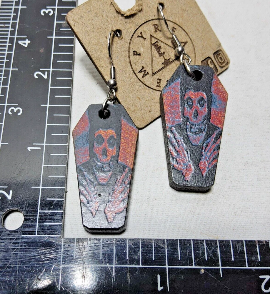 Laser engraved cut coffin misfits earrings hallowen custom punk horror fashion art goth metal rockabilly Based off a misfits crimson ghost design i made digitally. Then sent through laser machine. Made on plywood. From skull bead to bottom of earring measures 1.5"h x .75"w x 1/4"d. Loaded with hypoallergenic metal ear hooks. Check out plenty of other lasered creations of mine in shop. Order a few pieces and I'll give you a bundled art deal. Not doing customs at the moment but may be persuaded to fire up the laser for right project. Ebay reselling keeps me busy. Message me to find out. Thanks again for visiting my Ebay shop. ***Treasure Suite offers you many pieces of my art prints now*** ###This section is for laser cut sublimation prints of my digital art. Measurements vary by piece. ### *Welcome to my unique collection of digital art, where creativity meets craftsmanship! Each piece in this category features my original digital designs, heat pressed into vibrant sublimation prints on laser cut whiteboard material. Some are engraved then hand painted. These art pieces are not just decorations, they are collectibles that bring a touch of gothic, rock and roll, horror, pin-up, and lowbrow art into your space. *perfect for:* *man cave *castle *bungalow *abode *domicile *penthouse *flat *cabin *studio *boutique hotel *yacht *etc *These pieces make fantastic gifts for art enthusiasts and collectors alike. Who doesn't enjoy vibrant digital art of out of this world space huntresses, demon witches, cyberpunk vixen cyborgs, spooky mistresses, hearses, hotrods, and so on? ***May consider custom orders of laser cut or engraved items.***