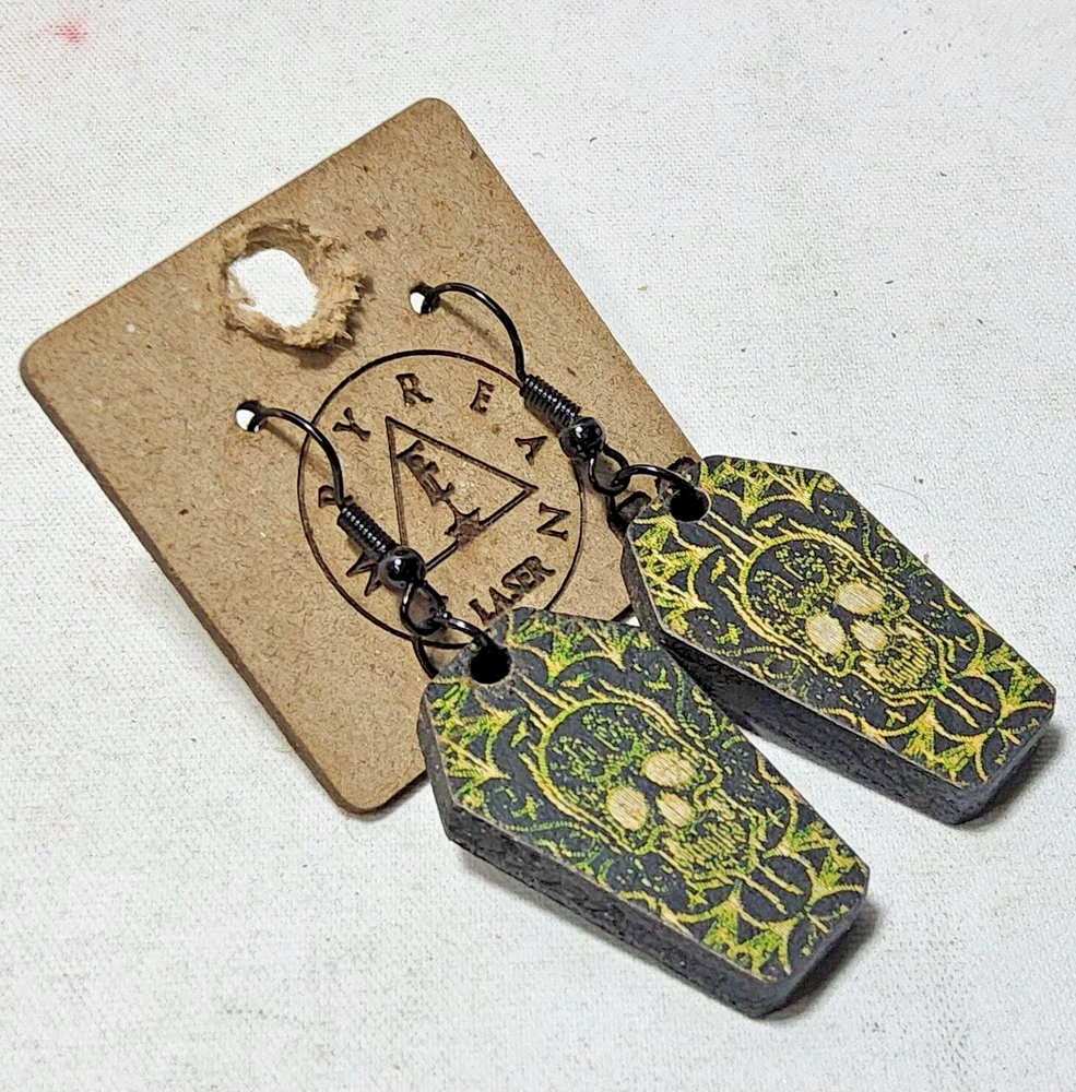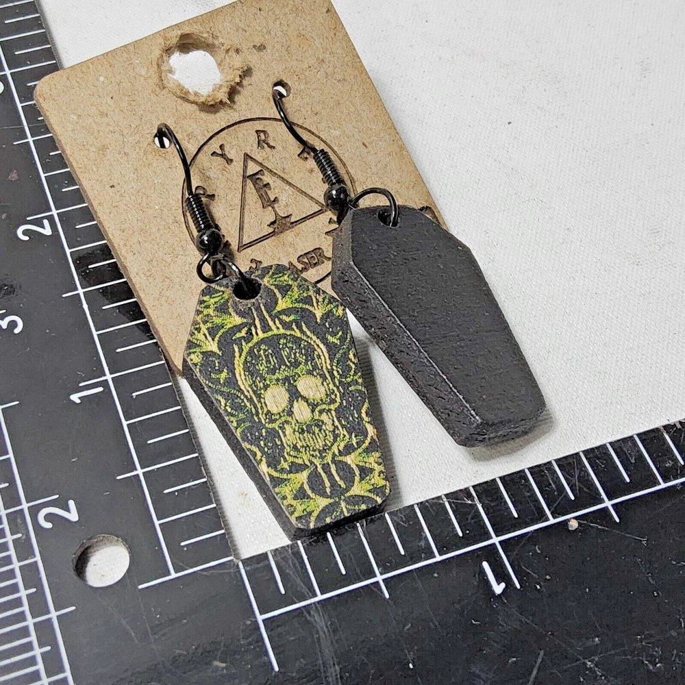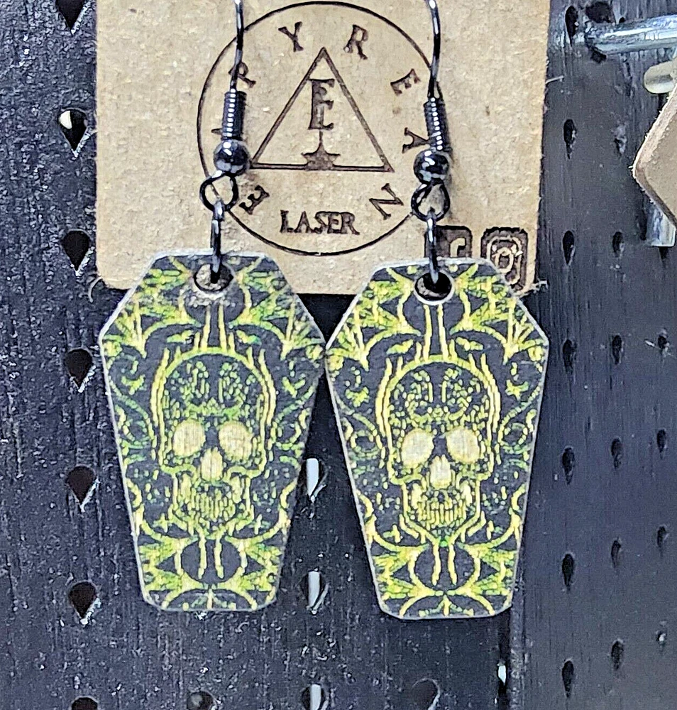 Laser engraved cut sugar skull themed earrings hallowen custom art horror fashion green and black western coffin Made from one of my sugarskull coffin designs on laser cutter/engraver. Measures 1.5"h x .75"w x 1/4"d. Loaded with hypoallergenic metal ear hooks. Check out plenty of other lasered creations of mine in shop. Order a few pieces and I'll give you a bundled art deal. Not doing customs at the moment but may be persuaded to fire up the laser for right project. Ebay reselling keeps me busy. Message me to find out. Thanks again for visiting my Ebay shop. ***Treasure Suite offers you many pieces of my art prints now*** ###This section is for laser cut sublimation prints of my digital art. Measurements vary by piece. ### *Welcome to my unique collection of digital art, where creativity meets craftsmanship! Each piece in this category features my original digital designs, heat pressed into vibrant sublimation prints on laser cut whiteboard material. Some are engraved then hand painted. These art pieces are not just decorations, they are collectibles that bring a touch of gothic, rock and roll, horror, pin-up, and lowbrow art into your space. *perfect for:* *man cave *castle *bungalow *abode *domicile *penthouse *flat *cabin *studio *boutique hotel *yacht *etc *These pieces make fantastic gifts for art enthusiasts and collectors alike. Who doesn't enjoy vibrant digital art of out of this world space huntresses, demon witches, cyberpunk vixen cyborgs, spooky mistresses, hearses, hotrods, and so on? ***May consider custom orders of laser cut or engraved items.***