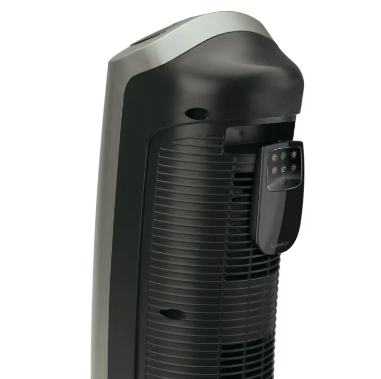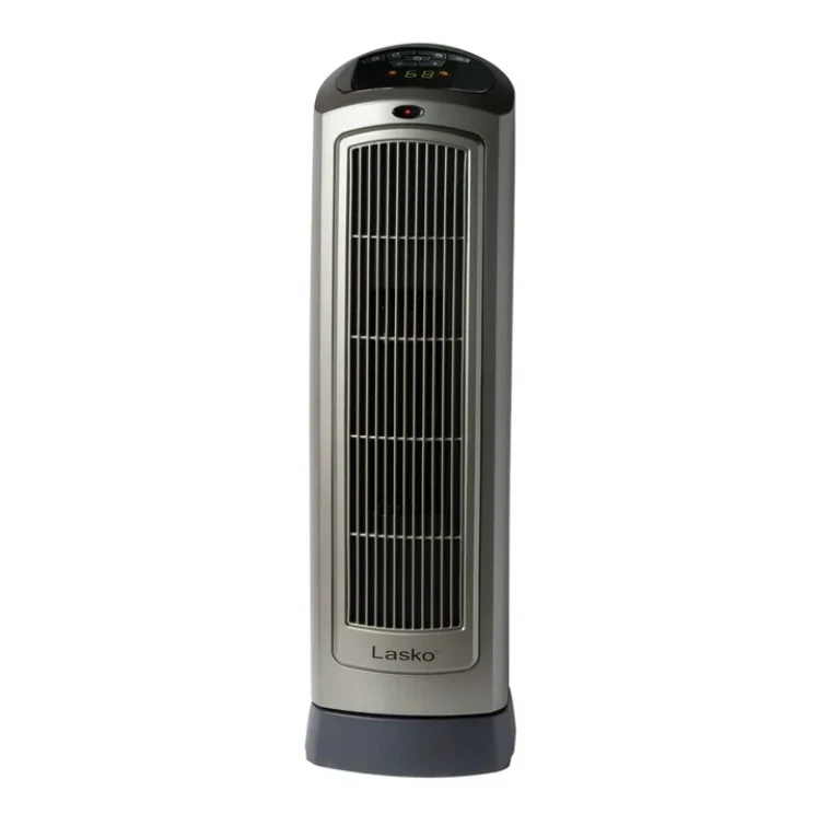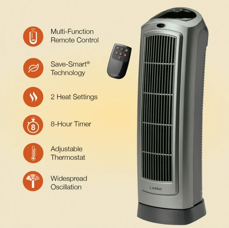 Product details The Lasko Ceramic Electric Tower Space Heater features 1500W of comforting warmth and an elongated heating element, which extends your comfort zone. Features easy-to-use electronic touch control operation, plus a multi-function remote control for convenience. This powerful space heater has two heat settings: high heat, low heat, plus an auto thermostat mode. The auto-off timer can be set for up to 8 hours. It has a convenient carry handle for room-to-room mobility and comes fully assembled. This dependable Lasko Tower Heater with digital display will be sure to keep you warm and toasty. This electric heater is ETL listed and Includes built-in safety features such as overheat protection, a cool-touch exterior and a safe ceramic element. 3-year limited warranty. Comes with a 6-foot power cord. For your safety, do not use space heaters with extension cords. For indoor use only. For indoor use only. Condition: New Provides 1500 watts of comforting warmth with an elongated heating element Features powerful air velocity to push heat throughout the room Simple electronic controls with an easy to read digital display Two heat settings: high heat, low heat 8-hour auto-off timer Widespread oscillation for full room coverage Adjustable thermostat maintains preferred temperature setting Molded carry handle for easy portability from room to room Comes fully assembled Built-in safety features include overheat protection, a cool-touch exterior and a safe ceramic element