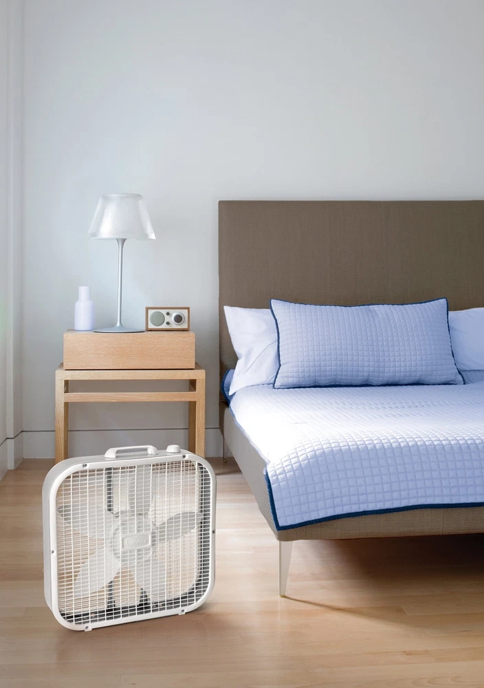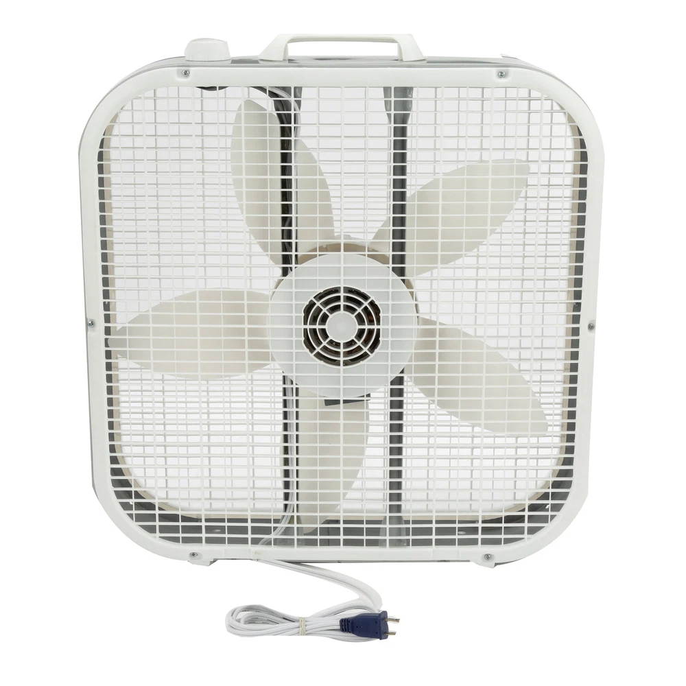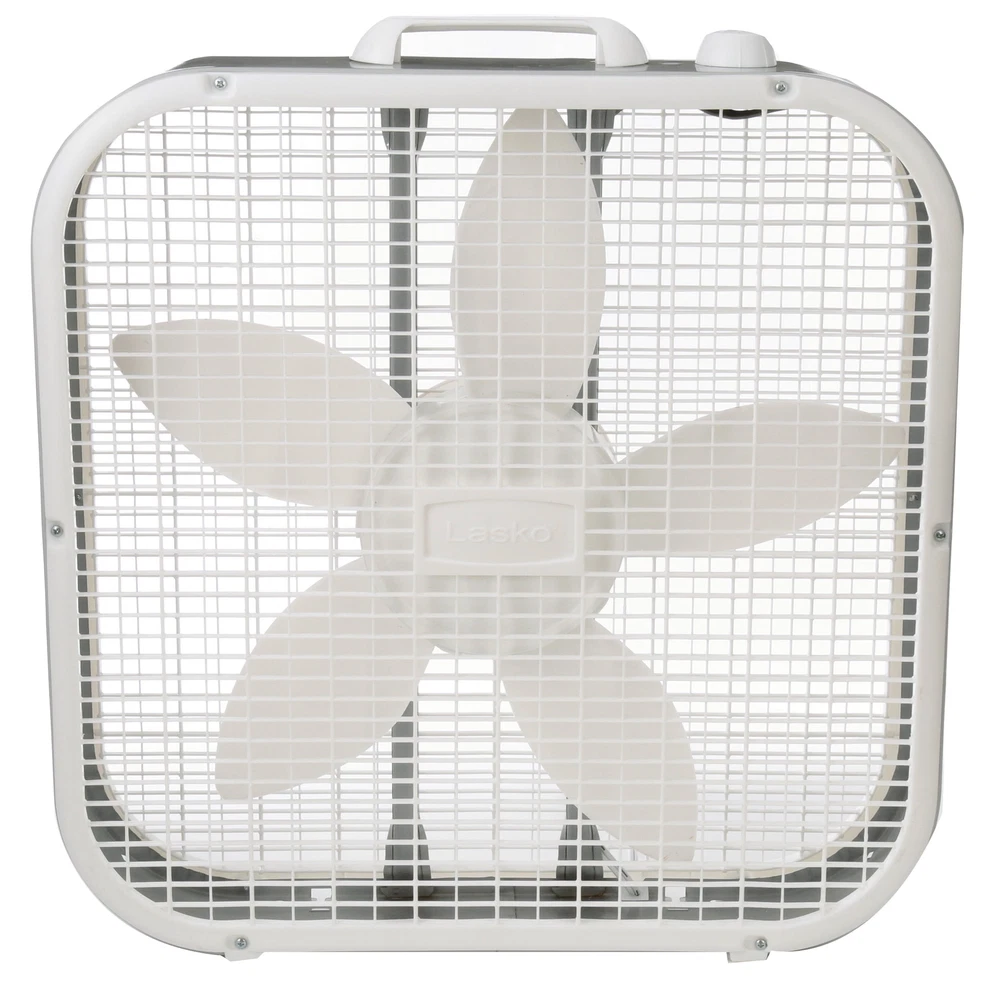The Classic Lasko 20" Box Fan creates efficient airflow to keep your home or work space cool and comfortable and helps to dry out dampness. Everyone needs a great basic, and this box fan is just that. Features 3 quiet fan speeds, top-mounted controls for easy operation, built-in handle for portability, and a durable metal frame. The front grill and fan blades are removable for easy maintenance to maximize efficiency. This box fan also features a weather-resistant motor for worry-free indoor window use. No tools are required for set-up or maintenance, adding even more convenience. Condition: New This Lasko 20" fan has 3 quiet speeds Easy-carry handle makes it convenient to move from room to room Steel body frame Top-mounted controls Weather-resistant motor Patented Blue Plug safety fuse technology 21.5" L x 4.44" W x 22.56" H Cord length: 72" White box fan requires no tools for setup Front grill and blades can be removed for easy and convenient cleaning ETL listed Weight of unit: 7.5 lbs Condition: New