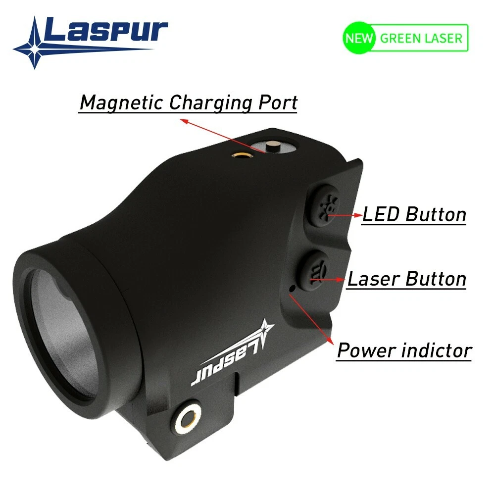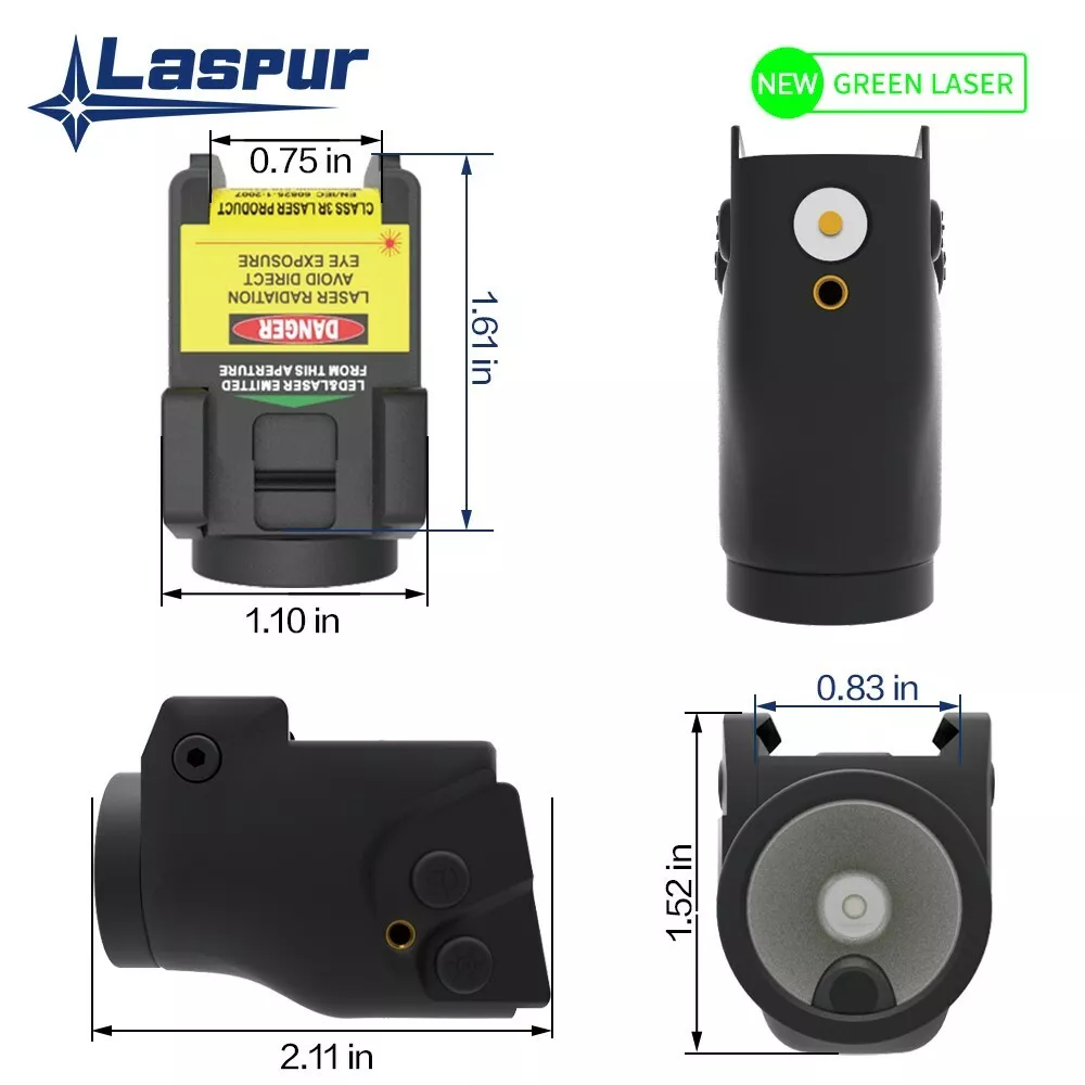 FEATURES ★ Low profile, Ultra-lightweight, compact, and tough design , Stable and adjustable. Low profile. Tactical laser light combo with INTERNAL GREEN LASER emitted from LED Cup. Offers the brightest green laser allowed by Law. Four running mode: Green Laser only\ gun light only\Green Laser and Light Combo\strobe . It gives you more choices. ★ Smart switch design. Ambidextrous momentary/ steady On-Off switch Controls activation from either side of the unit; One handed snap-on and tighten interface for safe and quick mounting. Long press the switch to change the working mode. ★ Two Rail Locating Keys have four installation sizes. It holds to fit more pistols, Will not loosen due to vibration. The light fits onto virtually any firearm with a modern (M1913 Pica tinny or Weaver-style) accessory rail. Fit rail- equipped pistols, handgun. it will easily accommodate most universal holsters. ★ Build-in battery with magnetic USB charging port. Super convenient USB Magnetic Contact Charging, which solves the problem that the existing USB plug can’t access the USB interface in night or dim light environment. Magnetic recharging allows you to conveniently keep the product mounted to the gun while charging. The battery indicator can prompt the remaining power at any time to avoid the inability to use the product due to insufficient battery power. ★ It is fully user-adjustable for Windage and Elevation with the provided tool, You can adjust and zero-in this laser easily. Also, if you don't like the product or if something happens to it please return it for a full refund or a new one! No questions asked! We are real humans in the United States with a real company and a real warranty. OPERATION 1 、 Click the either side Laser On/Off Switch to turn on or turn off the laser. Click the either side LED On/Off Switch to turn on or turn off the LED. 2 、 High-brightness/Medium-brightness/Low-brightness/Extremely low-brightness: : in the LED mode, long press either side LED On/Off Switch ( 0.5s ) to cycle switch the working mode(500lm-300lm-100lm-10lm). 3 、 Power Indicator: every time turn on the device, the power indicator will light up for 5 seconds. Showing the current state of the battery power. 4 、 Power Protection: in the high-brightness(500lm)mode, every time turn on the device, after the brightness of 500lm is maintained for 1 min, it will linearly decrease to the state of medium brightness(300lm) with 2 min. 5 、 Pulse Laser: in any state, double-click the either side Laser On/Off Switch to enter pulse mode, and click either side Lase On-Off Switch again to revert to the state before entering pulse. 6 、 Strobe LED: in any state, double-click the either side LED On/Off Switch to enter strobe mode, and click either side LED On-Off Switch again to revert to the state before entering strobe. 7 、 Memory Function: every time turn on the device, it will revert to the state when it was last closed. 8 、 The device will be automatically turned off during the charging process, and all function cannot be activated. DETAILS ★ Laser output: <5mW, Class 3A ★ Laser wavelength : Green laser 510-532nm ★ Dimension: L x W x H = 2.12” ⅹ 1.12” ⅹ 1.53”(54 ⅹ 28.5 ⅹ 39 mm) ★ Material: Fiber Reinforced Nylon PA66 ★ Weight (net): 1.79ounce (50g) ★ Light : High: 500lm; Mid1: 300lm; Mid2: 100lm; Low: 10lm ★ Working mode: Laser only\ gun light only\Laser and Light Combo\strobe . ★ Type of Bulb: LED ★spot size: 25mm@30m ★ Runtime: a 、 Laser Only: 3h b 、 LED Only: High: 60mins; Mid1:70mins; Mid2: 90mins; Low: 21hrs c 、 Laser LED Combo : High: 55mins; Mid1:65mins; Mid2:85mins; Low: 20hrs ★ Power Source: Battery-powered ★ Battery type: Build-in Rechargeable Battery ★ Item Package Quantity:1 ★ Included Components: · Laser Light Combo · Wrench · Magnetic Charging Cable · Rail Locating Keys · User Manual INSTALLATION REQUIREMENTS INSTALLATION REQUIREMENTS If it meets the following two points, it can fit your pistol: ★ First, It requires a standard accessory rail. Make sure your handgun has it. Compatible with Picatinny and Weaver rail. ★ Second, Make sure at least 1.2" space between the rail groove and the trigger guard . SHIPPING ★ Our standard shipping service is free, your order will be processed within 1-2 business days after your payment. Transit time varies from 2-5 business days. ★ We only ship to the confirmed PayPal address. We reserve the right to cancel any order for any reason at any time. ★ We are not responsible for undeliverable addresses. RETURN POLICIES ★ We offer a 30 day return policy from checkout winning date. ★ An RMA number is required for all returns. Message us for return instructions. Items returned without a RMA number will not be processed. ★ Items defective upon receipt must be packaged in their retail packaging as if new and returned with a detailed description of the problem. We are unable to accept any items that have been used as well as any food items. ★ We reserve the right to decline any returns if the above guidelines are not followed. FEEDBACK ★ We will leave feedback for you as soon as we receive your payment. COMMUNICATION ★ If you have a problem or question regarding your item, please contact us before leaving any type of feedback. We will work with you to resolve any problems you may have. ADDITIONAL INFORMATION ★ Direct viewing of the laser is hazardous to the eyes. ★ Never look directly into the laser beam. ★ Never point laser beam at person. ★ Do not allow children to use laser sight