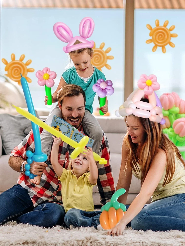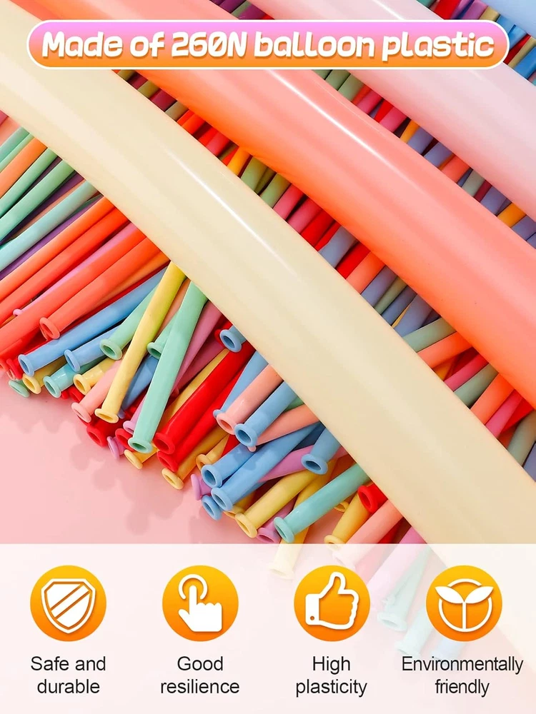 Package Content: The package contains 100 colorful balloons and 1 manual inflatable pump, which is a great balloon animal kit that can enrich the children's sense of color and improve hands-on ability to experience the joy of DIY. High-quality Materials: The long balloons for balloon animals are made of premium latex, strong and safe, with good elasticity and plasticity, not easy to break, durable, can be twisted and tied into various shapes at will. Colorful Ballons: The appearance of balloon animals kit with pump is macaroon candy colors, such as pink, yellow, blue, green, etc. Suitable for making various shapes of animals or plants like puppies, flower, butterfly, bee, bear, bird and more. Easy to Inflate: Our latex twisting balloons are equipped with pump, the balloon should be stretched about 5 times before inflating to obtain better malleability and to avoid bursting caused by uneven inflation. Note: Please inflate at a constant rate and leave some space to avoid explosion when twisting. Widely Used: The animal balloon kit can twisted into different animals or other items, which is a perfect balloon animals kit for kids, perfect for Christmas gifts, birthday party, parent-child games, wedding decoration, school performances, making the activity more active and wonderful. Product Description