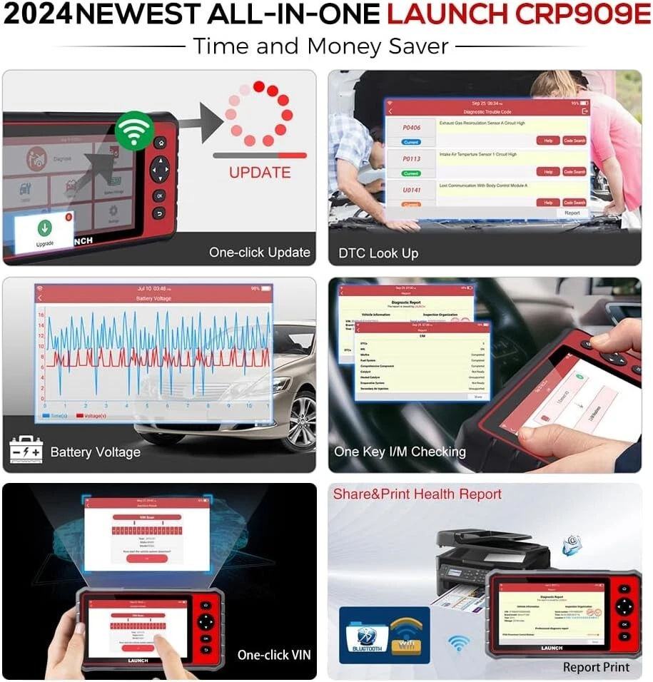 LAUNCH CRP909E ALL-IN-ONE SCAN TOOL -- Newest Full System LAUNCH CRP Series Scan Tool Why your Deserve a LAUNCH CRP909E ? Upgraded Version of CRP429C/CRP129E/CRP123/VIII/CRP123E/CRP123i/CRP909 update car software to 2 022/2023/2024, including cars, SUVs, minvans, 12v light-duty trucks. ALL SYSTEM DIAGNOSE ( Read & Erase All System Codes): The diagnostic scan tool LAUNCH CRP909E will give your car a full detection since it can read/clear DTCs and view live data, and service functions for ALL Systems ,For instance: Engines/Auto Transmission/Airbags/Immobilizer/Key Coding/ABS/Cruise Control/Instruments/ Self Leveling Suspension systems/Seats/Doors/Gateway/Steering Angle/Air Suspension/Body Systems/Electronic Power Steering & Motor Assisted/Power Steering/Tyre Pressure/Rain Sensors/4WD System/Stabilizer/Intelligent Parking Assist/Door Motors/Audio Systems/Air Conditioning/Tiptronic/Anti Theft/Soft Top/Headlamp Leveling/Central Locking/Automatic Clutch/ D.PF Reset/Electric Windows/Plip Programming/Heated Rear Window/Xenon Headlights/Wash Wipe/Fuel Burning Heater/Transfer Box/Seat Memory/Oil Life Service Reset/Sliding Doors/Electronic Throttle/Navigation System/Rollover Sensor/Cruise Control/ Multi Function Steering Wheel/Aux Heating/Electronic Parking Brake/Clutch Electronics, ....etc.( OVER 100,0000 CAR OWNERS & MECHANICS 's First Choice) 28 Hot Used Reset Function ( Newly Added 11 Service functions in NOV.2021 ): Including Oil Lamp Reset, EPB Reset, BAT battery service(BMS), D.PF service, SAS Steering Angel Sensor Reset, IMMO Key Programming(Anti-theft Matching), ABS Bleeding, Fuel Injector Coding, TPMS service, Throttle Adaptation,AFS Headlamp Reset,Sunroof Reset,Suspension Reset,Gearbox Reset,Gear Learning,Tire Reset,A/F Reset,Adblue Reset,Coolant Bleeding,Language Change,Nox Sensor Reset,Stop/Start Reset,Seat Calibration,Transport Mode,Windows Calibration,AC System Relearn/Initialization. ( Keep growing with UPDATES) 4 Basic diagnostic functions: Version Information, Read DTCs ,Clear DTCs and Read Data Stream ( supports 3 dispiay modes: Value, Graph and Merged ). Support Multi-languages : English, French, Spanish, Russian, Japanese, German, Italian, Portuguese. Update: One-Click update online via Wi-fi, 2(TWO)-Year Free Updates Frequently Asked Question: Can the LAUNCH CRP909E Work without Wifi ? Sure ,you can always use it on the car without WIFI , you only need wifi connection when initial Set-up OR updating OR sending diagnostic emails. *** Print & Share : Support print out diagnostic report via PC Multiple car models: covering over 108+ car makes and 25000+ model from Asia, America and Europe,etc. 99% of Vehicles Coverage.(Other scanners on the market only support 56+ car brands) 7-inch Larger,Clearer Touch Screen: . A brighter, clearer Screen let you " Deep Dive into Diagnostics" ,Touch screen and button operation model, meets majority of users needs A great visual experience. Thanks to the LAUNCH CRP909E Scan tool, you don’t need to rely on the mechanics or auto repair shop , you can be the mechanic of your family ,Which is a great money saver for your family 2024 NEWEST UPGRADE---28 Dealership Level Relearn Functions Free to USE 1. Oil Lamp Reset Service :perform reset for a new calculation of Engine Oil Life system once changed the oil. 2. EPB Reset :Help replace and reset the brake pad. 3. BAT battery service(BMS) :Clear the fault information of low battery and make it match again 4. D.PF service 5. SAS Steering Angel Sensor Reset :Reset the steering angle to zero to keep the car running straight. 6. IMMO Key Programming(Anti-theft Matching) : Disable any lost keys and add new keys. **ONLY for cars with easy IMMO system. 7. ABS Bleeding : Help exhaust the air. 8. Fuel Injector Coding : Write the new injector code into the car system for correct cylinder injection quantity. 9. TPMS service : Makes sense in displaying sensor IDs from the vehicle's ECU, inputting TPMS sensor replacement IDs and testing sensors. 10. Throttle Adaptation : Initialize the throttle actuators to the default state. 11. AFS Headlamp Reset : Initialize the adaptive headlamp system. 12. Sunroof Initialization : The sunroof needs to be reset when the sunroof control unit have communication problem or changed. 13. Suspension Reset :Adjust the vehicle body height sensor for level calibration. 14. Gearbox Reset : Help complete the gearbox self-learning to improve gear shifting quality. 15. Gear Learning : Monitors certain camshaft position sensors signals. 16. Tire Reset :Set the size parameters of the modified or replaced tire. 17. A/F Reset :Set or learn Air/Fuel ratio parameters. 18. Adblue Reset(Diesel Engine Exhaust Gas Filter) : Reset urea after the diesel exhaust treatment fluid is replaced or filled up. 19. Coolant Bleeding: Activate the electronic water pump 20. Language Change :Change vehicle system language. 21. Nox Sensor Reset :Reset catalytic converter learned value stored in ECU. 22. Stop/Start Reset :Set up the automatic start-stop function in ECU 23. Seat Calibration :Calibrate the memory in replaced or repaired seats. 24. Transport Mode :Deactivate the transport mode. 25. Windows Calibration :Perform door window matching to recover ECU initial memory. 26. AC System Relearn/Initialization 27. HVOLBAT Reset. 28. Engine Cylinder Power balance Test . Deep Dive into Auto Diagnostics with Live Data Graphing, Record, Playback, Sharing. 2022.09 Newly Added ENGPBM Reset: Cylinder power balance testing can help uncover hidden engine issues related to engine misfires, lack of power or just a poor running engine, which is commonly missed with other tests. So, cylinder power balance testing, is one of the best and easiest ways to find the source of a engine misfire. Furthermore, cylinder power balance testing is often used along with a cylinder compression and cylinder leakage tests to further pinpoint the problem. 2022.09 Newly Added HVOLBAT Reset: High Voltage Battery Detection is used for high voltage 