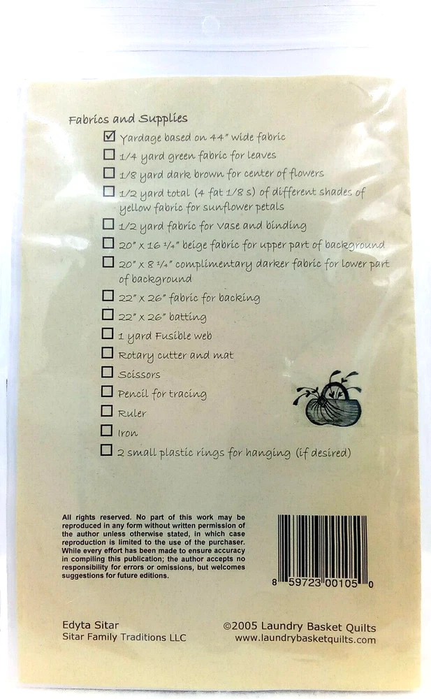 Laundry Basket Quilts Sunflowers UNCUT Quilt Sewing Pattern Raw Edge Applique 20x24". Condition is Uncut/Unused. The finished quilt size is 20x24" per the package. Per the package, this is a raw edge applique quilt. This can be a wall hanging by attaching plastic rings per the instructions. These are by Edyta Sitar of Sitar Family Traditions dated 2005. Please check out the photos in this listing for further information. If you have any questions or concerns, please contact us. Thank you for your support. We ship vintage and new items. We carefully pack with care to ensure the safety of each item. We do not pass these packaging costs onto the buyer. Furthermore, we do not charge any extra fees for handling. We only charge for the USPS shipping charge. We do monitor shipping prices frequently. In most cases, we do find the USPS to be the most inexpensive way to ship our products. We try to be as detailed as we possibly can in our photos and descriptions. We try to mention any imperfections in our vintage items. We may miss things from time to time or our photos may not be enough clarification for you to see the item. We will be glad to answer any questions or send you more photos. If at any time, you have a question or issue, please contact us immediately. We will contact you within 24 hours. We want to make sure you have a good experience in purchasing any of the products. If you are happy with your purchase, please leave feedback. It will help us to grow and offer more great items in our store! Thank you for your interest in one of the many products in our eBay store! Renee Burly Owl Lady