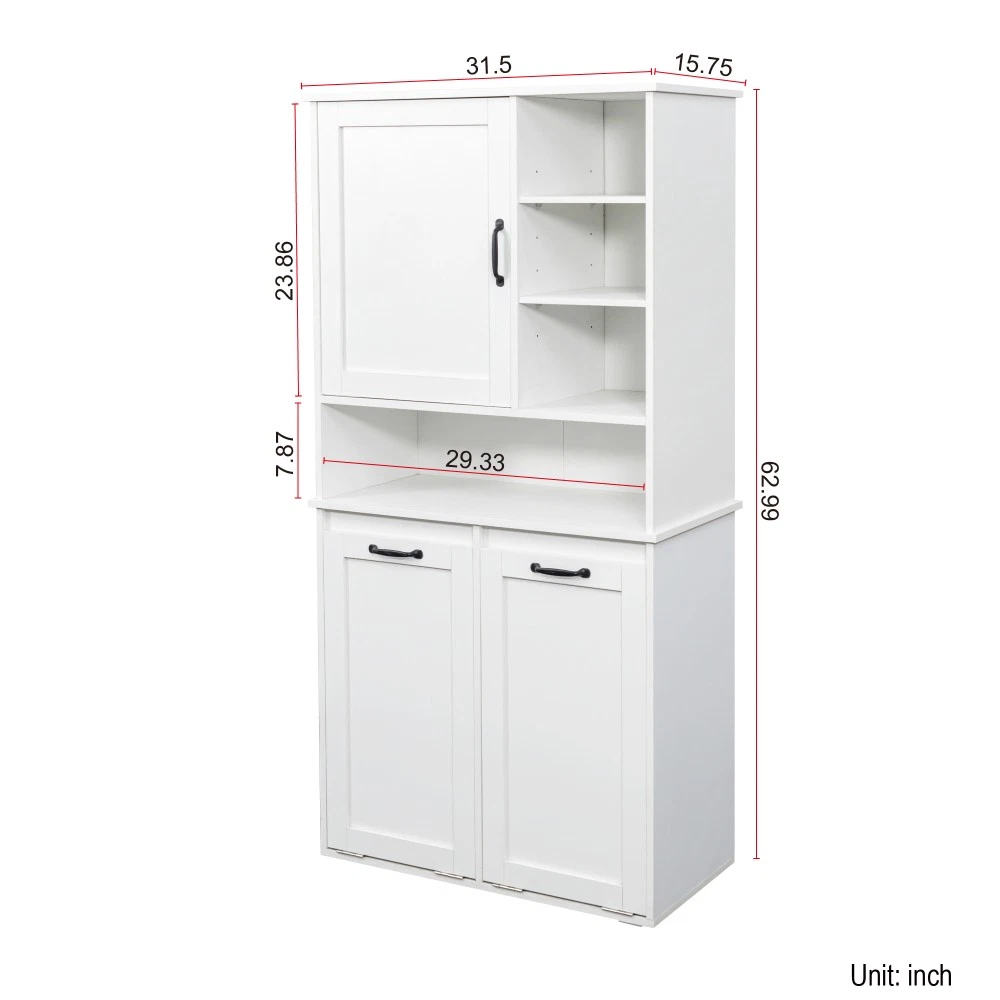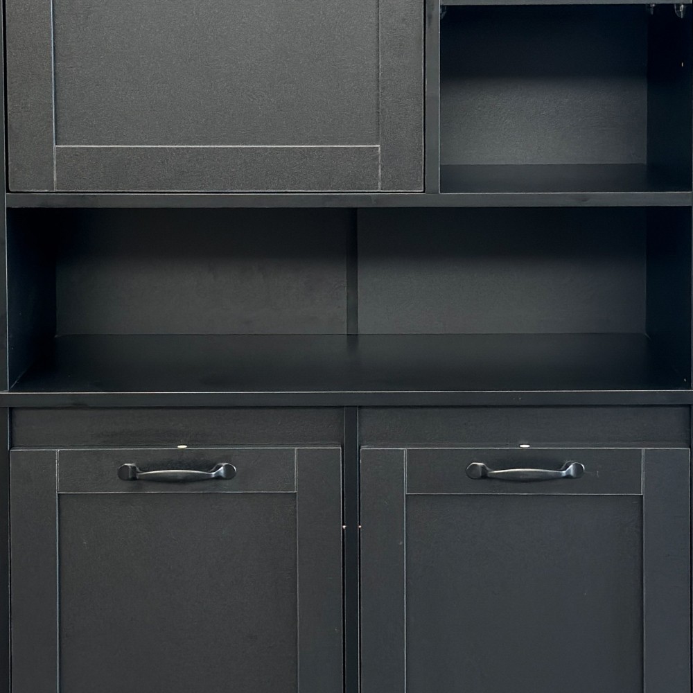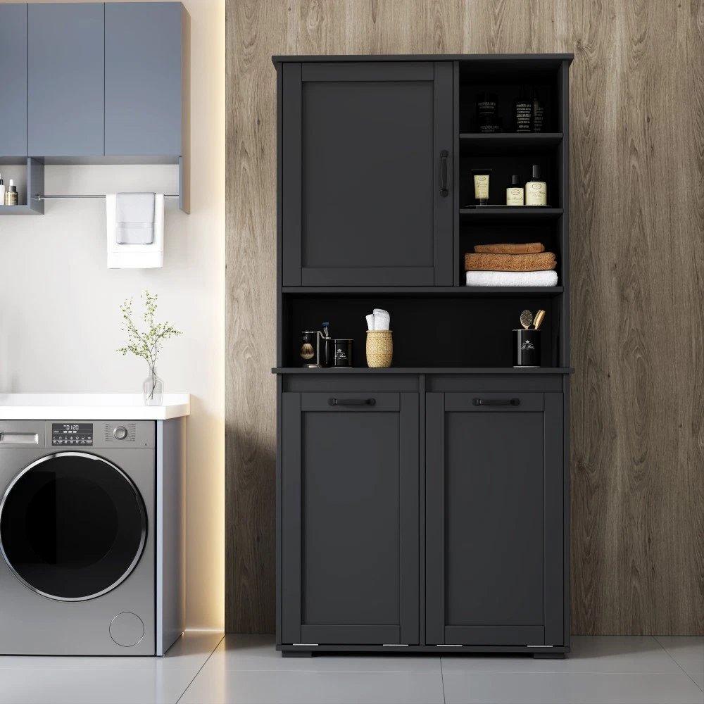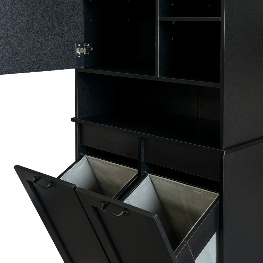 Key Specifications Assembled Dimensions: 31.50” L x 15.75” W x 63.00” H Product Weight: 108.03 lbs Color: Black Material: 15mm Particle Board + 3mm MDF Backboard (Melamine Finish) Premium Storage & Versatile Design Maximize your storage potential with a well-structured layout tailored to daily needs: Ample Storage Space : Features four-layer open shelves for displaying decorations, storing laundry detergents, fabric softeners, or daily necessities. The left cabinet door encloses two additional storage shelves, keeping private items neatly concealed. Two tilt-out laundry hampers offer dedicated space for dirty clothes, towels, bath towels, or linens, preventing dust buildup and keeping your space neat. Adjustable Shelves : The right open shelves and the inner shelves of the left cabinet are adjustable, while other shelves remain fixed. This flexible design accommodates items of different sizes—from tall bottles to small boxes—meeting all your varied storage demands. Tilt-Out Hampers : The two tilt-out baskets feature a space-saving design that’s easy to access. Simply tilt the front panel to place or retrieve items, and the closed design keeps odors and dust at bay, maintaining a clean laundry room. Durable Construction Crafted from high-quality 15mm particle board with a 3mm MDF backboard, this laundry cabinet boasts a sturdy wooden structure. The melamine finish not only enhances durability but also ensures easy maintenance—just wipe clean with a damp cloth to keep it looking like new for years to come. Warranty & Return Policy Shop with confidence! This laundry cabinet comes with a 1-Year Manufacturer’s Warranty , covering any defects in materials or craftsmanship. We also offer a 30-Day Free Return Policy —if you’re not completely satisfied with your purchase, you can return it for a full refund within 30 days of receipt, no questions asked. Important Notes Due to lighting effects and monitor differences, the actual color of the product may slightly differ from the image shown. This is a normal phenomenon and not a quality issue. For logistics reasons, the product may be shipped in two separate packages, which may arrive at different times. We appreciate your understanding and patience. Transform your cluttered laundry space into an organized haven with this practical and stylish laundry cabinet. Add it to your cart today and enjoy a tidier home!