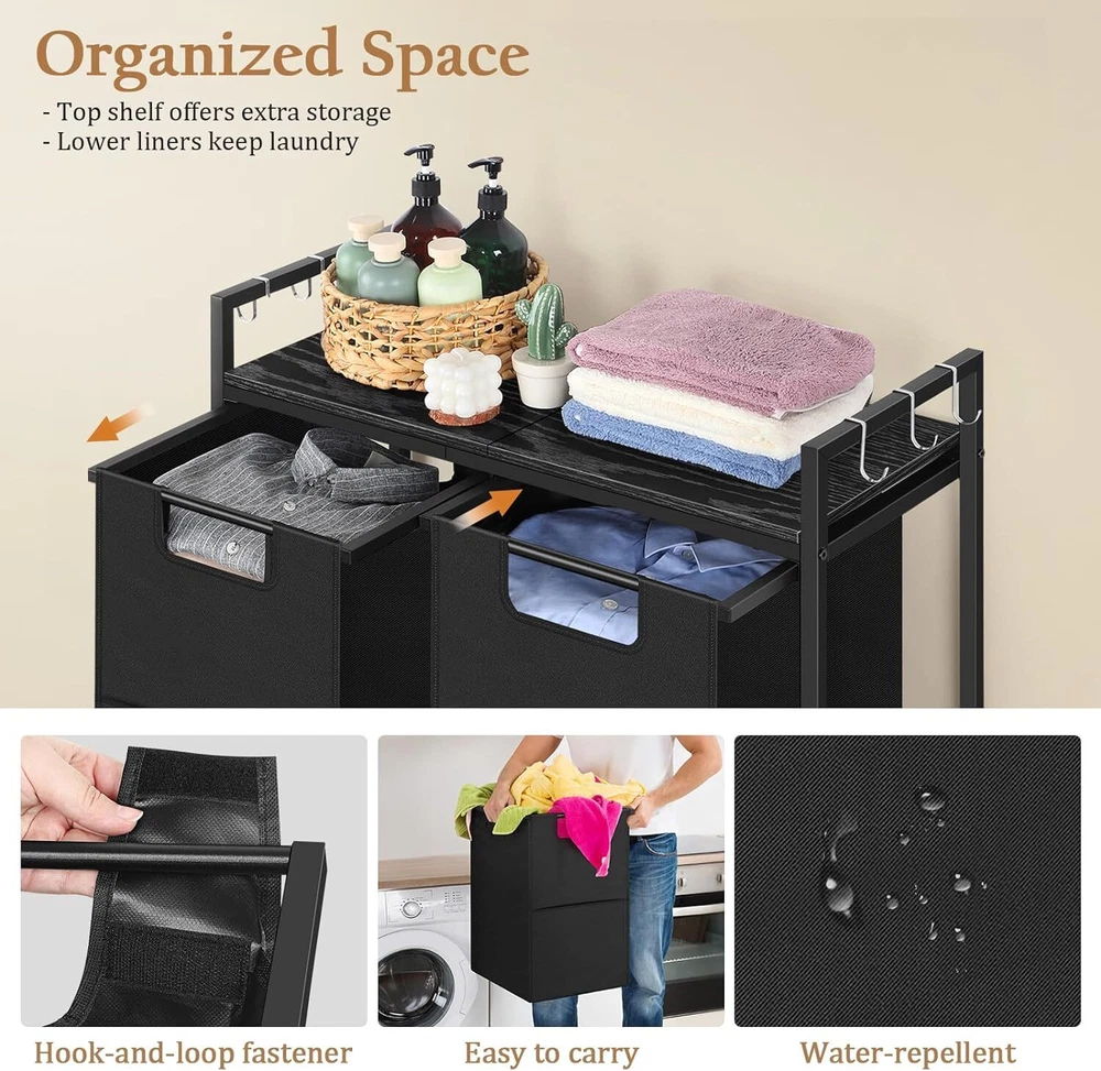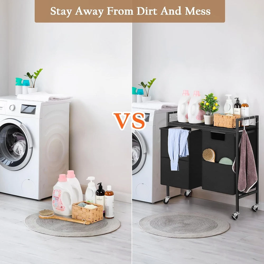 Store Categories Store Categories Luggage Set Tools Storage Racks Lights Outdoors Home Decor Health and beauty Organizers Sewing Garden Kids Pet Other Details 【Laundry Basket with Pull-Out and Removable】 With our divided laundry hamper's innovative double compartment design, allowing you to effortlessly sort your clothes from light to dark. 【Large Capacity Laundry Sorter with shelf】 Our thin clothes hampers for laundry features a practical top storage shelf, offering you additional space for storing laundry essentials such as detergent and fabric softener. 【Laundry Hamper with 4 Wheels】 Featuring 4 sturdy wheels, the rolling laundry hamper cart can be easily moved and locked at your convenience. 【Versatile Design】 Made from high-quality steel and wood, laundry basket cabinet ensures durability even with heavy loads. 【Easy Installation】 Clear and detailed instructions and necessary tools are included, just following the easy to understand and finishing the assemble quickly within 25 minutes. Specification: Product Dimensions: 29.4"L x 11.8"W x 29.6"H Color: Black Material: Wood, Metal Shape: Rectangular Shipping Policy Payment Method Returns Policy Shipping Policy Payment Method Returns Policy Copyright©2017 DataCaciques Details 【Laundry Basket with Pull-Out and Removable】 With our divided laundry hamper's innovative double compartment design, allowing you to effortlessly sort your clothes from light to dark. 【Large Capacity Laundry Sorter with shelf】 Our thin clothes hampers for laundry features a practical top storage shelf, offering you additional space for storing laundry essentials such as detergent and fabric softener. 【Laundry Hamper with 4 Wheels】 Featuring 4 sturdy wheels, the rolling laundry hamper cart can be easily moved and locked at your convenience. 【Versatile Design】 Made from high-quality steel and wood, laundry basket cabinet ensures durability even with heavy loads. 【Easy Installation】 Clear and detailed instructions and necessary tools are included, just following the easy to understand and finishing the assemble quickly within 25 minutes. Specification: Product Dimensions: 29.4"L x 11.8"W x 29.6"H Color: Black Material: Wood, Metal Shape: Rectangular Feedback Returns Policy Shipping Policy Feedback If you are satisfied with the product you received, please leave us positive feedback and 5 star comment, which will be highly appreciated. 2. If there is any problem about your order, please contact seller prior to leaving feedback, and we will be glad to work with you to have it resolved. 3. If you are dissatisfied for any reason, please do not be quick to leave negative or neutral feedback. We’ll try our best to resolve any problem for you to make EACH CUSTOMER 100% SATISFIED and always leave positive feedback to all our customers. Returns Policy Unauthorized returns will not be accepted. If you need to return, please check twice to confirm the item not work and contact our customer service representative, let us know the detailed problem and send us some pictures for confirmation. Shipping Policy We will provide tracking number and ship within 3 working days after payment.