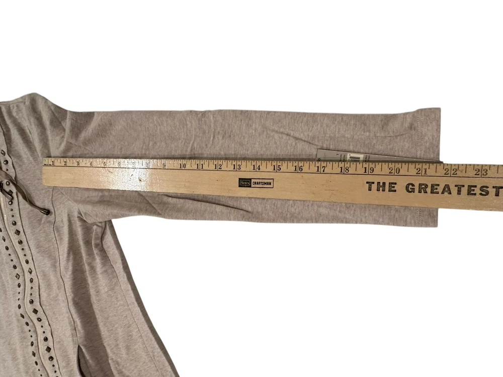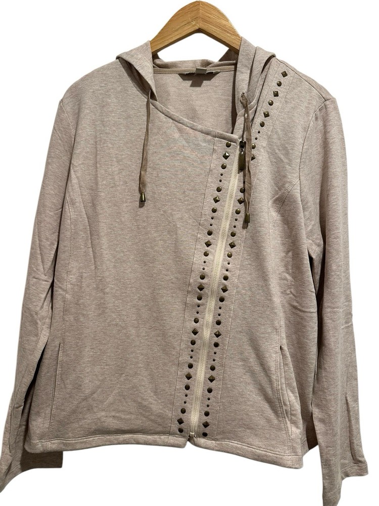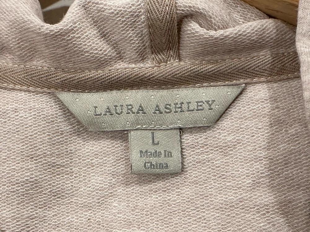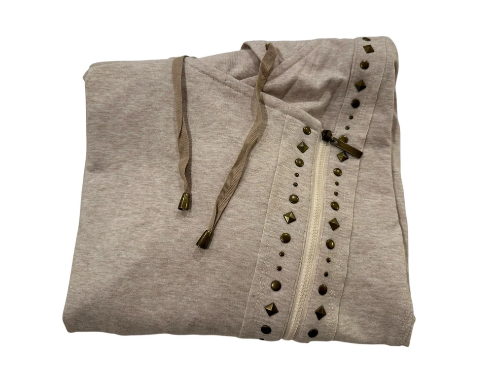 Elevate your wardrobe with this stylish and cozy cardigan from Laura Ashley. Featuring a side zip and studded accents, this beige-colored sweater is perfect for any casual occasion. The hooded design adds an extra layer of warmth and protection from the elements, while the cotton blend material ensures comfort and durability. This item is new with tags. Measurements are included in pictures. Please inspect pictures to make sure they are up to your standards and reach out with any questions.