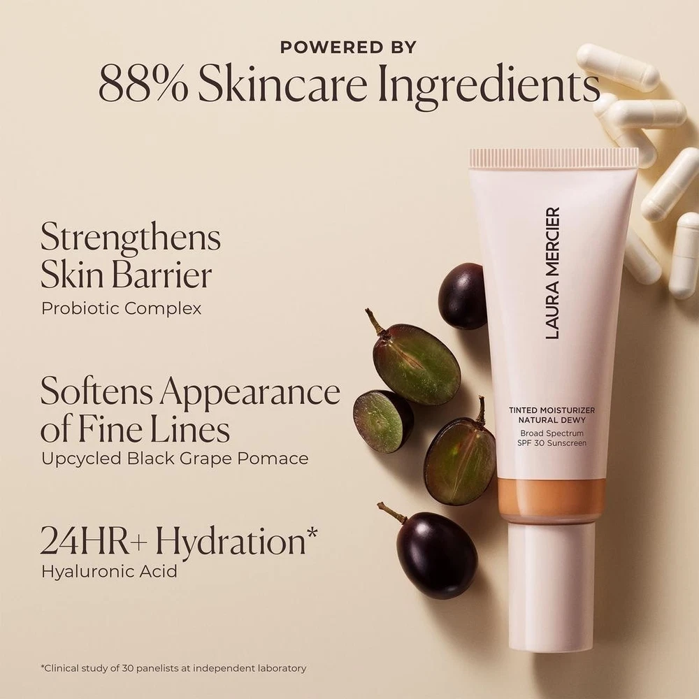 The Laura Mercier Long-Wear Tinted Moisturizer Natural Dewy SPF 30 with Hyaluronic Acid is the bestselling tinted moisturizer with a new & improved weightless formula that provides 16HR long wear, 24HR+ hydration and improves skin tone and texture. Details Benefits 16HR long wear Improves skin tone and texture with every wear 24HR+ hydration Humidity proof SPF30 protection Reduces Appearance of Pores and Fine Lines Resurfaced Non-Comedogenic Non-Acnegenic Dermatologist Tested Key Ingredients Hyaluronic Acid- Long-lasting hydration Upcycled Grape Extract with Resveratrol- Softens appearance of fine lines Probiotic Complex- Strengthens skin barrier Research Results 100% agree it visibly evens skin tone and texture after 1 Day** 100% agree it makes their skin feel soft in just 1 week * 97% agree it reveals healthy looking skin over time* *Consumer study of 30 panelists at independent laboratory **Clinical study of 30 panelists at independent laboratory How To Use HOW TO APPLY: Dispense Tinted Moisturizer on the back of your hand and use it as a palette. Picking up a small amount from back of the hand, apply with fingers, smoothing over face in a downward motion to ensure facial hairs lay flat. Laura recommends starting at the outer portion of the face and working inwards toward the nose, avoiding excess application around the contours of the face. Pat on additional product to build coverage where needed. Laura's finishing touch, inspired by a Parisian facial technique, is to smooth the remaining product under the jawline, neck, and chin. PRO TIPS: To build more coverage, pick up product on the back of hand using a foundation brush and work Tinted Moisturizer into the bristles on a clean area on back of the hand. Stipple onto any areas that need additional coverage. If a fuller coverage is desired, mix a few drops of foundation into Tinted Moisturizer to get more pigment while maintaining the fresh, hydrated look of Tinted Moisturizer Natural Dewy.