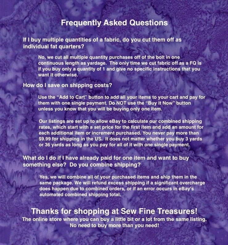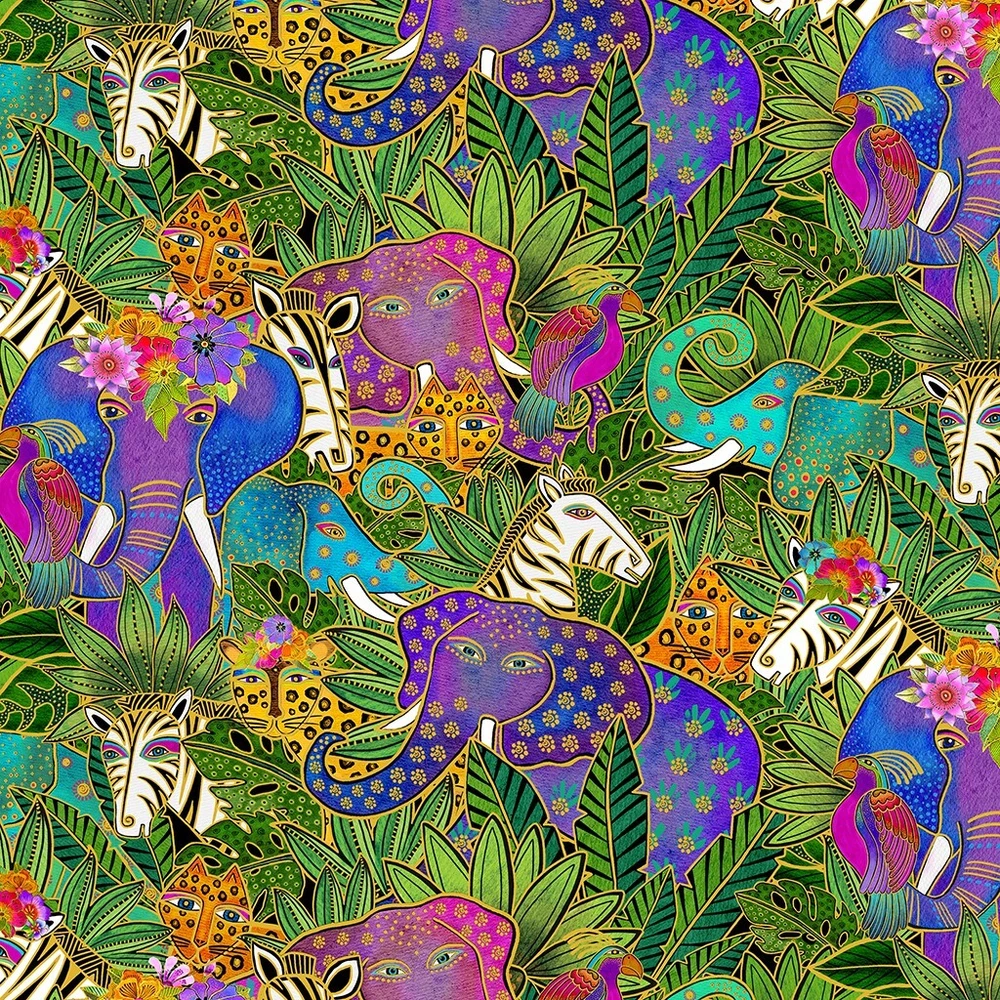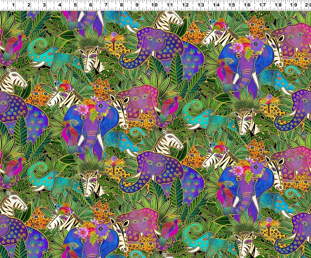 Title : Laurel Burch Earth Song Jungle Allover Black Metallic Fabric ~ Sold by the 1/4 yard increment Item description : You are buying one increment (1 FQ) of Jungle Allover from the Laurel Burch Earth Song collection by Clothworks . There are elephants, leopards, zebras and parrots surrounded by broad leaf plants all over. A black background can be seen peeking through in small amounts. Digitally printed, larger elephants are about 5-1/2". There are gold metallic outlining this design’s components . The first and second photos are ones that Clothworks provided ; a ruler is included on the second photo to show the size . The quilts shown use fabrics from this collection and the pictures are from Clothworks; they are not included in this listing. They are available by request while supplies last. The last photo is a composite of the whole fabric collection; they also are not included in this listing. The pictures really don't do the fabric justice. It is much more beautiful than a picture can show. We are sure you can agree. This fabric is priced by the single 1/4 yard increment, so you can choose the amount that is right for you from the quantity available. Our fabric is : Priced by the 1/4 yard (FQ if only one is purchased) ~ not by the yard 100% cotton Quilt Shop quality fabric New ~ Still on the bolt from the manufacturer It is not washed, soaked, or ironed Sold in continuous yardage, which means if you buy a quantity more than one (1) it will be shipped in one continuous piece Need more than one FQ? Buy 2 = 1/2 yard (18" L x 43"-44" W) Buy 3 = 3/4 yard (27" L x 43"-44" W) Buy 4 = 1 full yard (36" L x 43"-44" W) Buy 5 = 1-1/4 yard (45" L x 43"-44" W) And so on... What is a FQ? It is 1/4 yard of fabric, but it is cut off the bolt differently than the standard 1/4 yard of fabric. It is cut off the bolt at the 1/2 yard length; then it is cut in half by the width the fabric. This means that the piece of fabric measures 18 x 21-22 inches. It is "fat" instead of "skinny" like the regular 1/4 yard, which measures 9 x 43-44 inches. To change your purchase to a regular skinny 1/4 yard: please add a comment to your payment or send us a message thru eBay's "My Messages" system. Whether your one increment is a FQ or a regular 1/4 yard it doesn't effect the price; they are both the same. Search our store : Chec k out our store for other beautiful fabrics; you never know what you may find. We have lots of other fabrics in stock. Disclaimer : Due to the limitations of desktop scanners, digital scanners, and the inconsistencies of screen displays, the colors and other characteristics you see on screen MAY NOT be a totally accurate reproduction of the actual fabric. Images are intended to be used as a guide only and should not be regarded as absolute replications of the fabric. Color Matching is not possible without the actual fabric. Colors stated in the description are subjective and are used to help you to visualize the fabric. If you need to color match a fabric or verify other characteristic of a fabric, please send us a message. When we receive your message, we will let you know how to proceed with purchasing a sample. Shipping information : We are always happy to combine your purchases to save you money on shipping costs, but you need to make ONLY ONE payment in order to receive the most savings. Save on shipping costs. Be sure to buy with the "add to cart" button if you are buying more than one item from us. Buying multiple items and paying for them individually causes you to not receive our combined shipping rate. We will refund excess shipping if a significant overcharge does happen due to combined orders, or if errors occur in eBay's automated shipping total. Payment information: Simply use the "add to cart" button to select all the fabrics you want to purchase instead of "buy it now" button. Add all of your selections to your cart before you go to checkout. You will save on shipping costs with our combined shipping rates. Payment is then appreciated within 24hours, but it is expected within a maximum of 4 days. International Buyers: We use the eBay International Shipping program to ship all our international packages. We simply ship to an eBay shipping hub in the USA, and eBay does the rest, which includes the customs paperwork. Returns are also handled by eBay. Be sure to add us to your favorites ! Check out our store for other beautiful fabrics ! You never know what you will find Thank you for shopping at Sew Fine Treasures