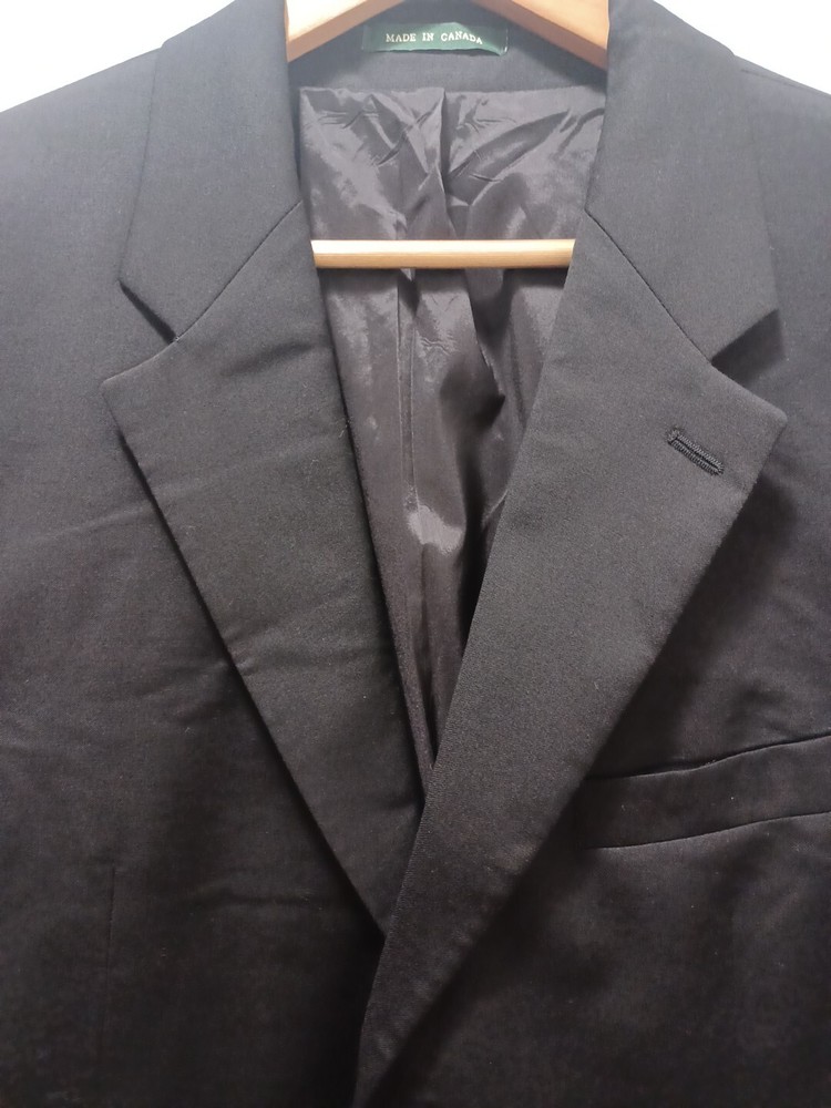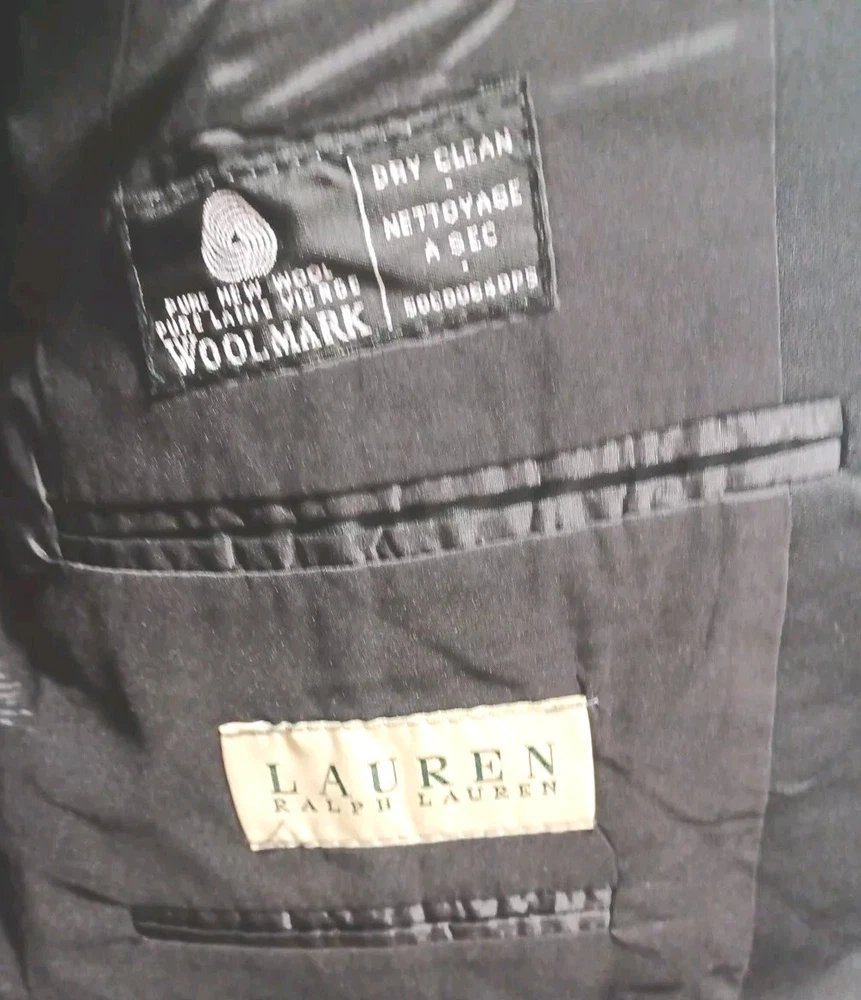 Color: Black Garment Care: Dry Clean Only Occasion: Business, Formal, Party/Cocktail, Travel Jacket Sleeve Button Style: Four-Button Jacket/Coat Length: Regular Pattern: Solid Style: suit jacket Jacket Cut: Single-Breasted Vintage: No Size: 44R Jacket Vent Style: Single-Vented Brand: Lauren Ralph Lauren Theme: Classic, Designer Department: Men Country/Region of Manufacture: Canada Fabric Type: wool Number of Pieces: 1 Size Type: Regular Lining Material: Polyester Fit: Classic Material: Wool Type: Suit Jacket Chest Size: 44 Jacket Lapel Style: Notch Jacket Front Button Style: Two-Button Season: Fall, Spring, Summer, Winter