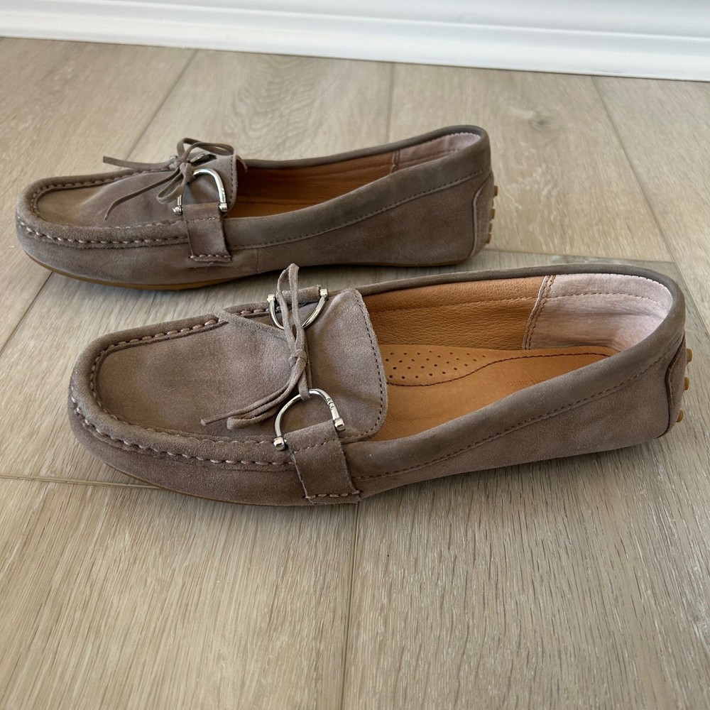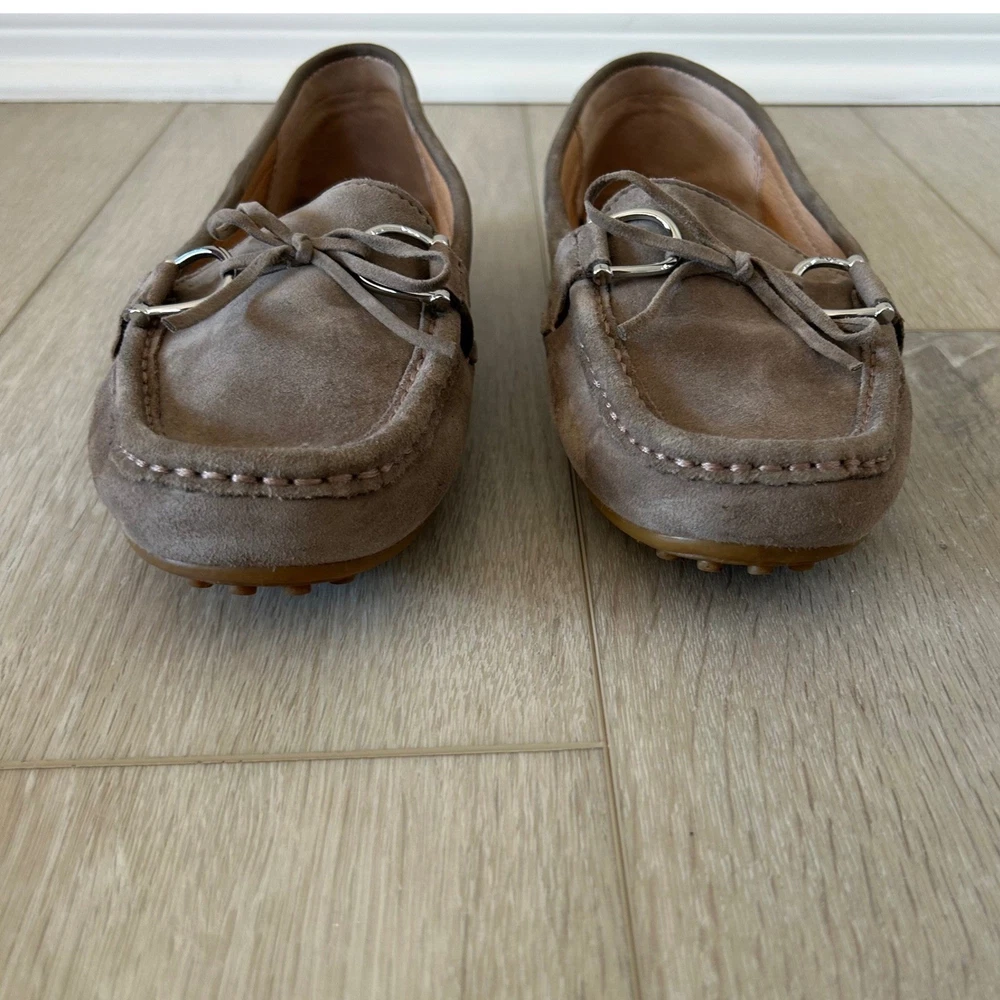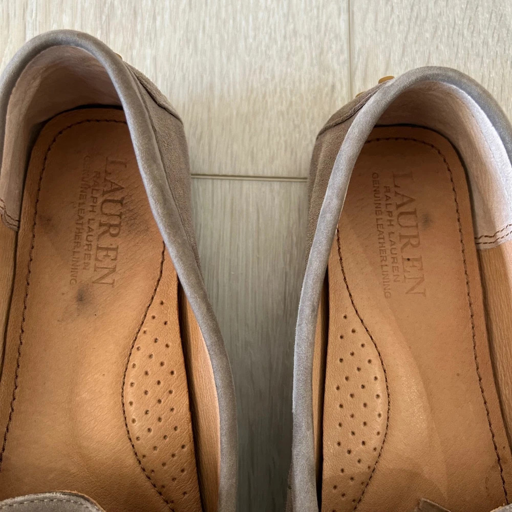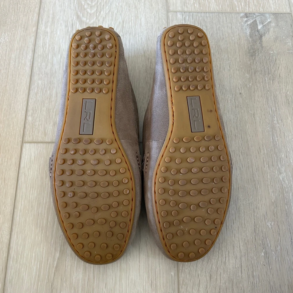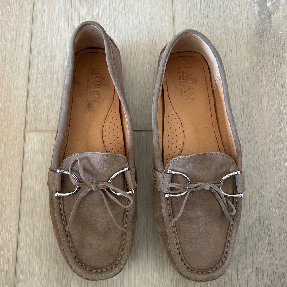 Lauren Ralph Lauren Briley II driving loafers offer a sophisticated blend of comfort and classic style. Crafted from premium taupe suede with a full leather lining, these slip-on shoes feature a traditional moc-toe construction and a dainty bow detail accented by polished silver-tone hardware. The signature rubber nubbed outsole provides excellent grip and flexibility, making them an ideal choice for everyday wear or travel. **See pictures for minor wear and marking to insoles and bottom of right shoe** Brand: Lauren Ralph Lauren Model: Briley II Style: Driving Loafer, Moccasin Color: Taupe / Mushroom Material: 100% Leather Suede Upper Lining: 100% Leather Hardware: Silver-tone Toe Shape: Round Moc Toe Closure: Slip-on Accents: Bow, Metal Bit Sole: Rubber Pebble / Nubbed Keywords: Quiet Luxury, Preppy, Minimalist, Neutral, Coastal Grandmother, Office Wear, Travel Shoes, Classic, Suede Loafers, Moccasins, Designer, Workwear, Earth Tones, Slip On