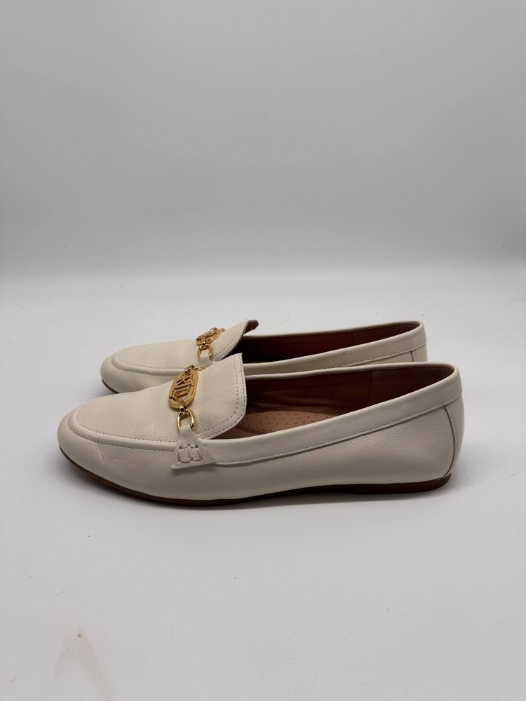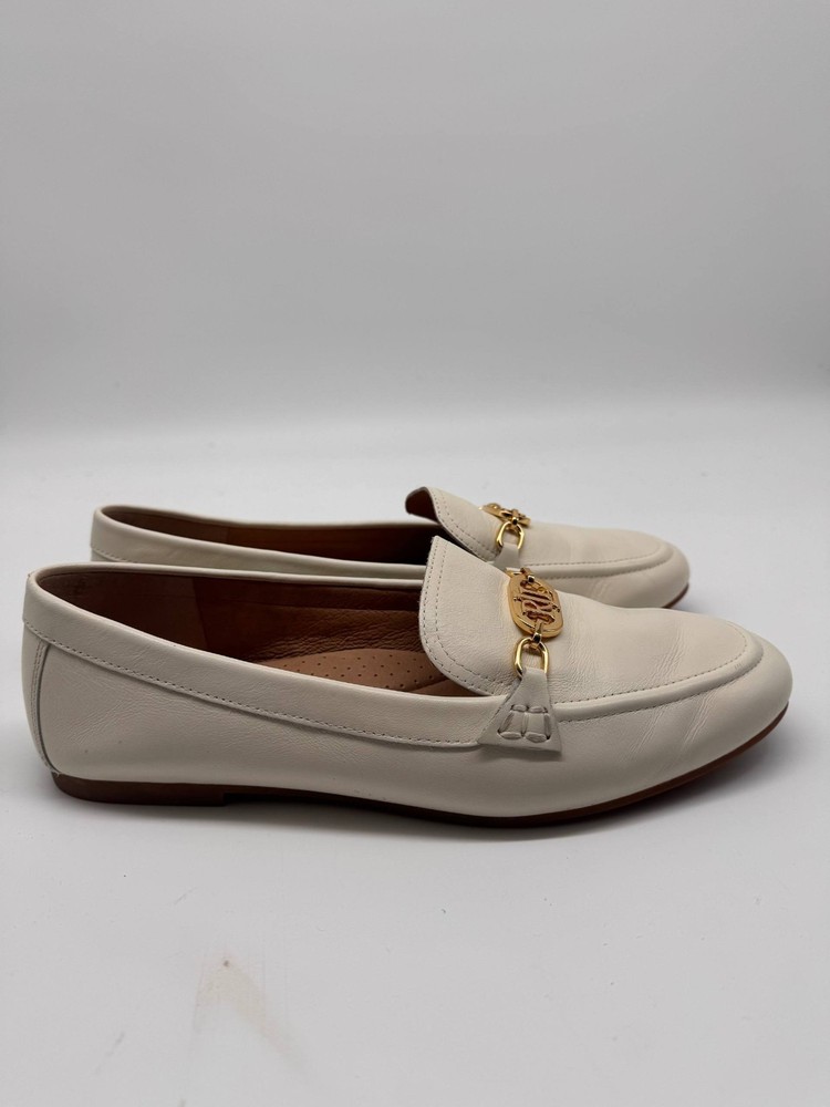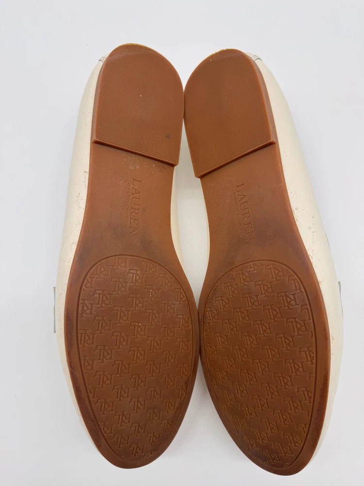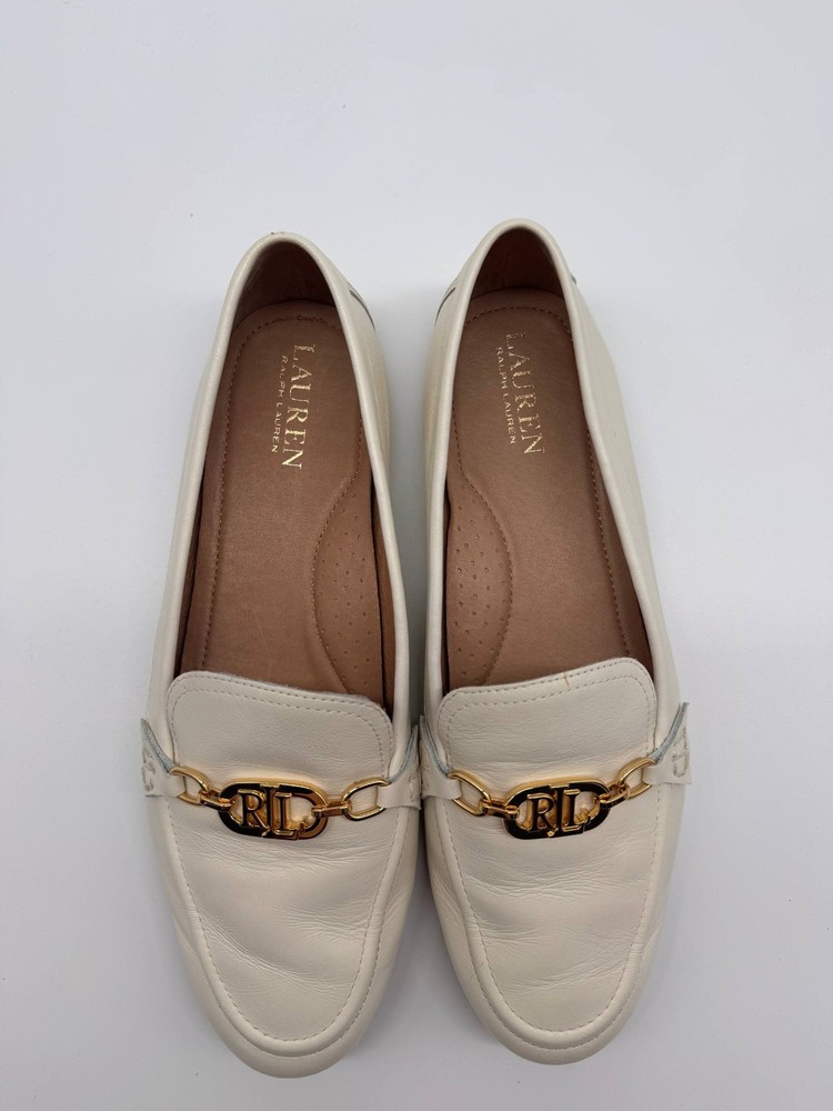 The Lauren Ralph Lauren Ivory Leather Loafer Flats are stylish and elegant flats designed for women. Featuring a solid ivory color with gold tone hardware and logo accents, these loafers have an almond toe shape and a slip-on closure for easy wear. Made from leather with a rubber outsole, these loafers offer both comfort and durability. Perfect for adding a touch of sophistication to any outfit, these loafers from Lauren Ralph Lauren are a versatile addition to any woman's shoe collection.