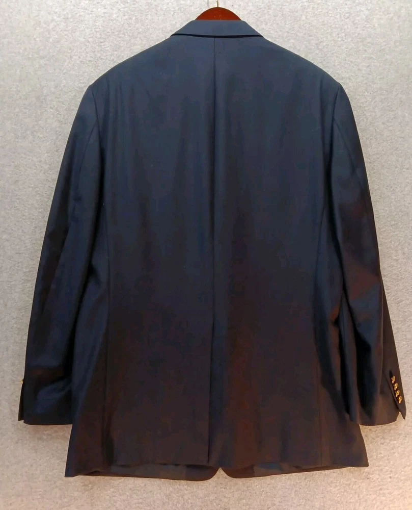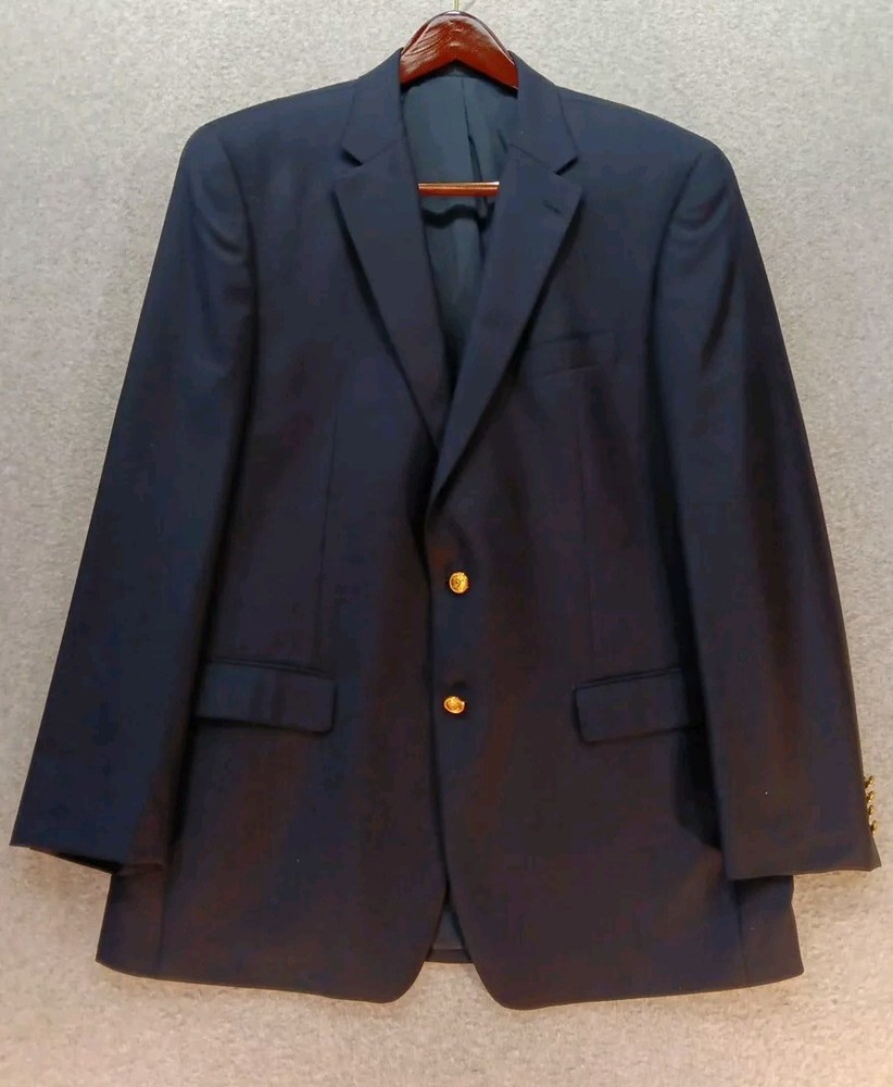 Elevate your formal attire with this Lauren Ralph Lauren blazer, perfect for any occasion. The navy blue wool fabric is complemented by a gold button closure and a notch lapel style. This classic fit blazer features a single-breasted cut, two-button front button style, and four-button sleeve button style. The blazer also includes inner pockets for convenient storage. Dry clean only. This blazer is perfect for the winter, summer, fall, and spring seasons and can be worn for travel, weddings, parties, or business meetings. The blazer is made in Indonesia and is available in a men's regular size 44L. Add this stylish blazer to your wardrobe today and elevate your fashion game.