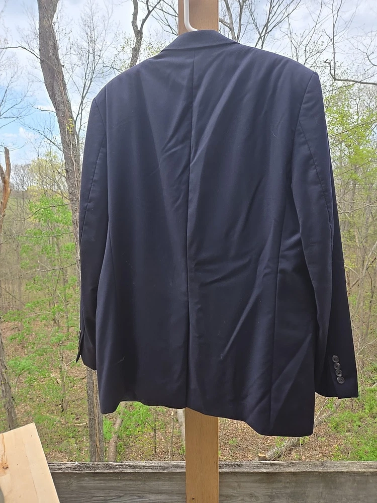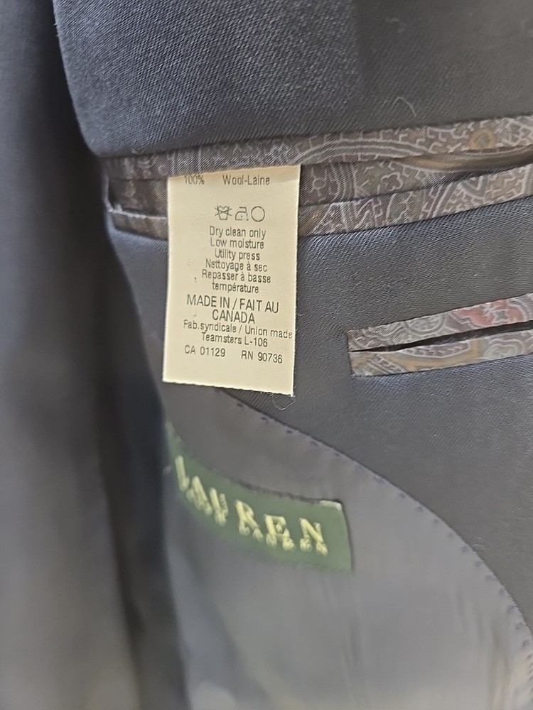 Crafted for the discerning gentleman, this Lauren Ralph Lauren men's sport coat offers a sophisticated silhouette in a rich blue hue. The size 44L is tailored for the Big & Tall, ensuring a comfortable fit that complements your stature. The coat is fashioned from premium wool, promising warmth and a smooth, structured feel. The coat features a classic double-button closure and a four-button sleeve style, both of which add a touch of elegance to your ensemble. Functional inner pockets enhance the garment's practicality, while the solid pattern maintains a sharp, uncomplicated look. Designed to be dry-clean only, this sport coat ensures effortless maintenance and longevity.