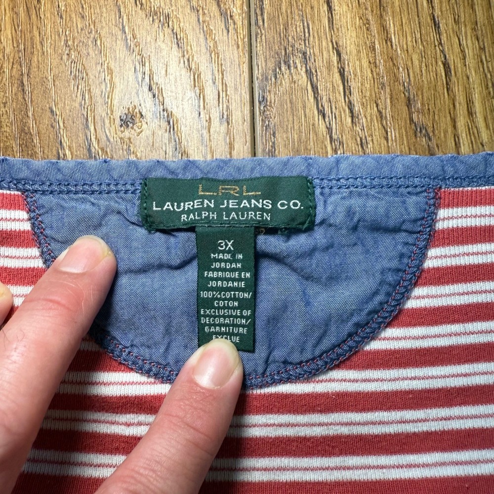 100% cotton. Excellent condition. Women's size 3X. Please see measurements in the photos to ensure correct fit. Shipping same day or next business day ALWAYS. Smoke free home. If you have any questions at all, do not hesitate to ask! *SKU 105* Y2K Lauren Ralph Lauren blouse henley top stripes summer comfort boho bohemian indie hippie classic luxury everyday wear casual nautical contrast trim