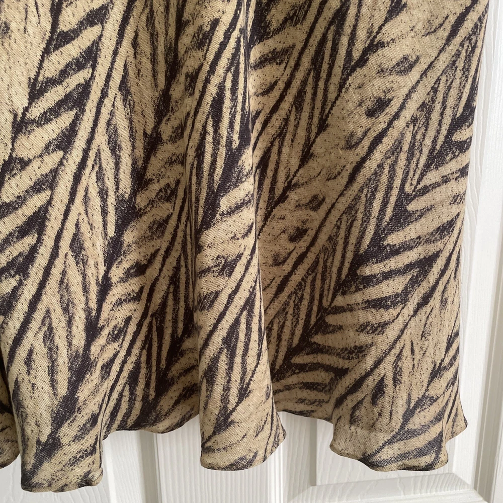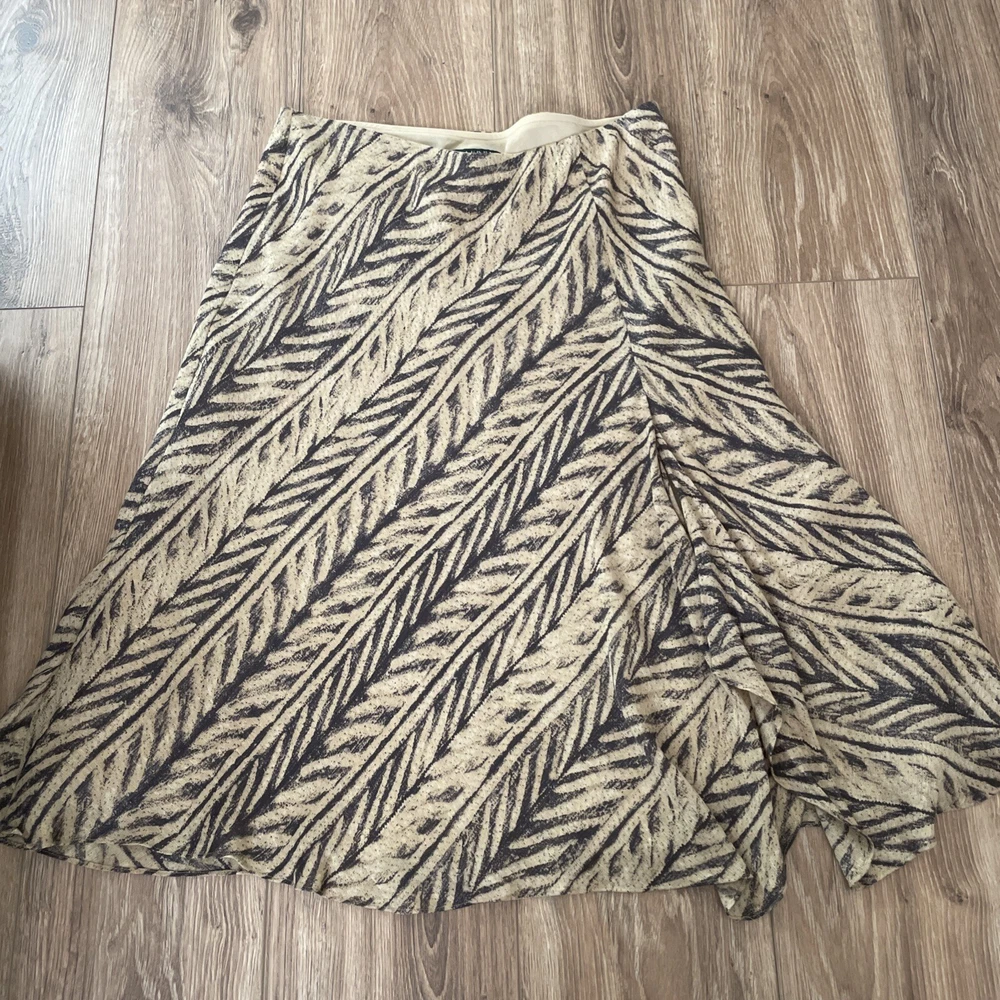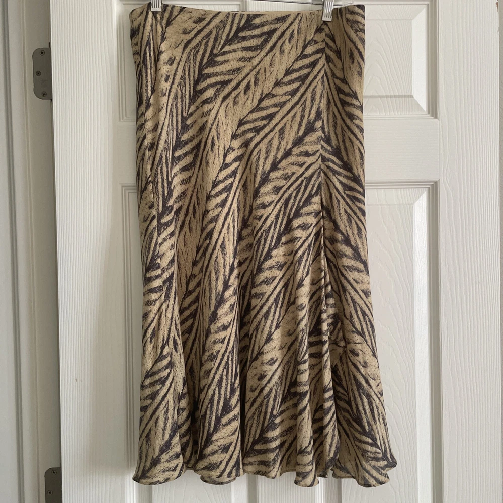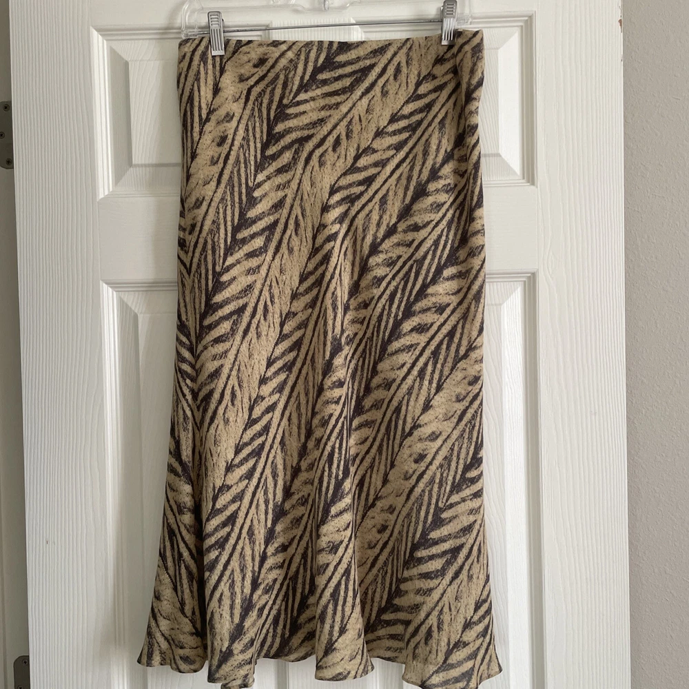 This Lauren Ralph Lauren Midi Skirt features a stylish ruffle flair design in a tan and dark gray color scheme, crafted from a luxurious combination of silk and linen materials. The skirt is in a size M with a pull-on closure and a mid-rise fit, suitable for various occasions such as travel, casual outings, workwear, or business settings. It is fully lined and easy to care. Perfect for all seasons, this skirt exudes a blend of bohemian and city-inspired charm with a hint of southwestern influence. Excellent preowned condition, like new.